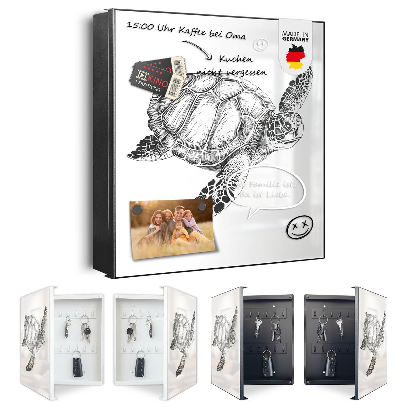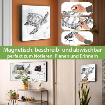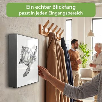 Bringe Ordnung und Eleganz in deinen Eingangsbereich mit dem banjado Schlüsselkasten Motiv Motiv Schildkröte 2. Die moderne Schlüsselbox kombiniert funktionales Design mit hochwertiger Verarbeitung und wird so zu einem echten Hingucker in Flur, Büro oder Ferienwohnung. ✅ Stilvolle Schlüsselaufbewahrung mit Motiv Motiv Schildkröte 2 Der Design-Schlüsselkasten Motiv Motiv Schildkröte 2 bietet Platz für bis zu 32 Schlüssel, die auf 4 stabilen Reihen mit je 8 Haken übersichtlich verstaut werden. Mit seinen kompakten Maßen von 30 x 30 x 5 cm passt die Schlüsselbox perfekt auch in kleinere Räume. Der schwarz lackierte Stahlkorpus mit rechts angeschlagenem Türscharnier harmoniert mit gedruckten Folie auf der Front und fügt sich nahtlos in jedes Wohnambiente ein. Ob als Schlüsselorganizer für Zuhause oder als praktische Lösung für Büros, Praxen und Gewerbe, der banjado Schlüsselkasten sorgt für Ordnung und Übersicht. Dank der magnetischen, mit Kreidestiften beschreibbaren Folie auf der Front kannst du Notizen anheften oder Termine direkt auf der Oberfläche festhalten. Die Schlüsselbox Motiv Motiv Schildkröte 2 zur Wandmontage wird inklusive Befestigungsmaterial geliefert und ist schnell angebracht. So hast du deine Schlüssel jederzeit griffbereit und zugleich stilvoll verstaut. Mit diesem banjado Schlüsselkasten Motiv Motiv Schildkröte 2 kombinierst du praktische Aufbewahrung mit stilvollem Wohndesign. Ob privat oder geschäftlich, die Schlüsselbox sorgt für mehr Ordnung, Übersicht und ein wohnliches Ambiente.Vorteile im Überblick