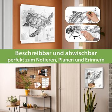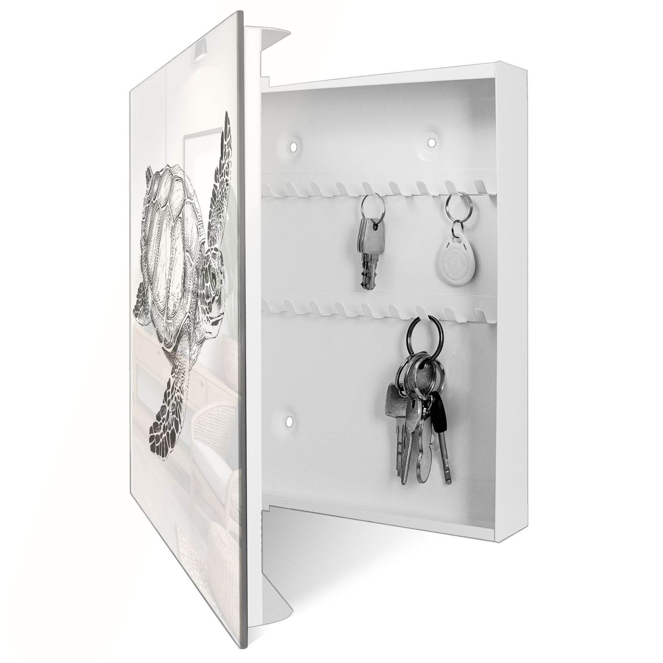 Bringe Ordnung und Eleganz in deinen Eingangsbereich mit dem banjado Schlüsselkasten Motiv Motiv Schildkröte 2. Die moderne Schlüsselbox kombiniert funktionales Design mit hochwertiger Verarbeitung und wird so zu einem echten Hingucker in Flur, Büro oder Ferienwohnung. ✅ Stilvolle Schlüsselaufbewahrung mit Glasfront im Motiv Motiv Schildkröte 2 Der Design-Schlüsselkasten Motiv Motiv Schildkröte 2 bietet Platz für bis zu 50 Schlüssel, die auf 5 stabilen Reihen mit je 10 Haken übersichtlich verstaut werden. Mit seinen kompakten Maßen von 30 x 30 x 5 cm passt die Schlüsselbox perfekt auch in kleinere Räume. Der weiß lackierte Stahlkorpus mit rechts angeschlagenem Türscharnier harmoniert mit der Glasfront und fügt sich nahtlos in jedes Wohnambiente ein. Ob als Schlüsselorganizer für Zuhause oder als praktische Lösung für Büros, Praxen und Gewerbe, der banjado Schlüsselkasten sorgt für Ordnung und Übersicht. Dank der magnetischen, mit Kreidestiften beschreibbaren Glasfront kannst du Notizen anheften oder Termine direkt auf der Oberfläche festhalten. Die Schlüsselbox Motiv Motiv Schildkröte 2 zur Wandmontage wird inklusive Befestigungsmaterial geliefert und ist schnell angebracht. So hast du deine Schlüssel jederzeit griffbereit und zugleich stilvoll verstaut. Mit diesem banjado Schlüsselkasten Motiv Motiv Schildkröte 2 kombinierst du praktische Aufbewahrung mit stilvollem Wohndesign. Ob privat oder geschäftlich, die Schlüsselbox sorgt für mehr Ordnung, Übersicht und ein wohnliches Ambiente.Vorteile im Überblick