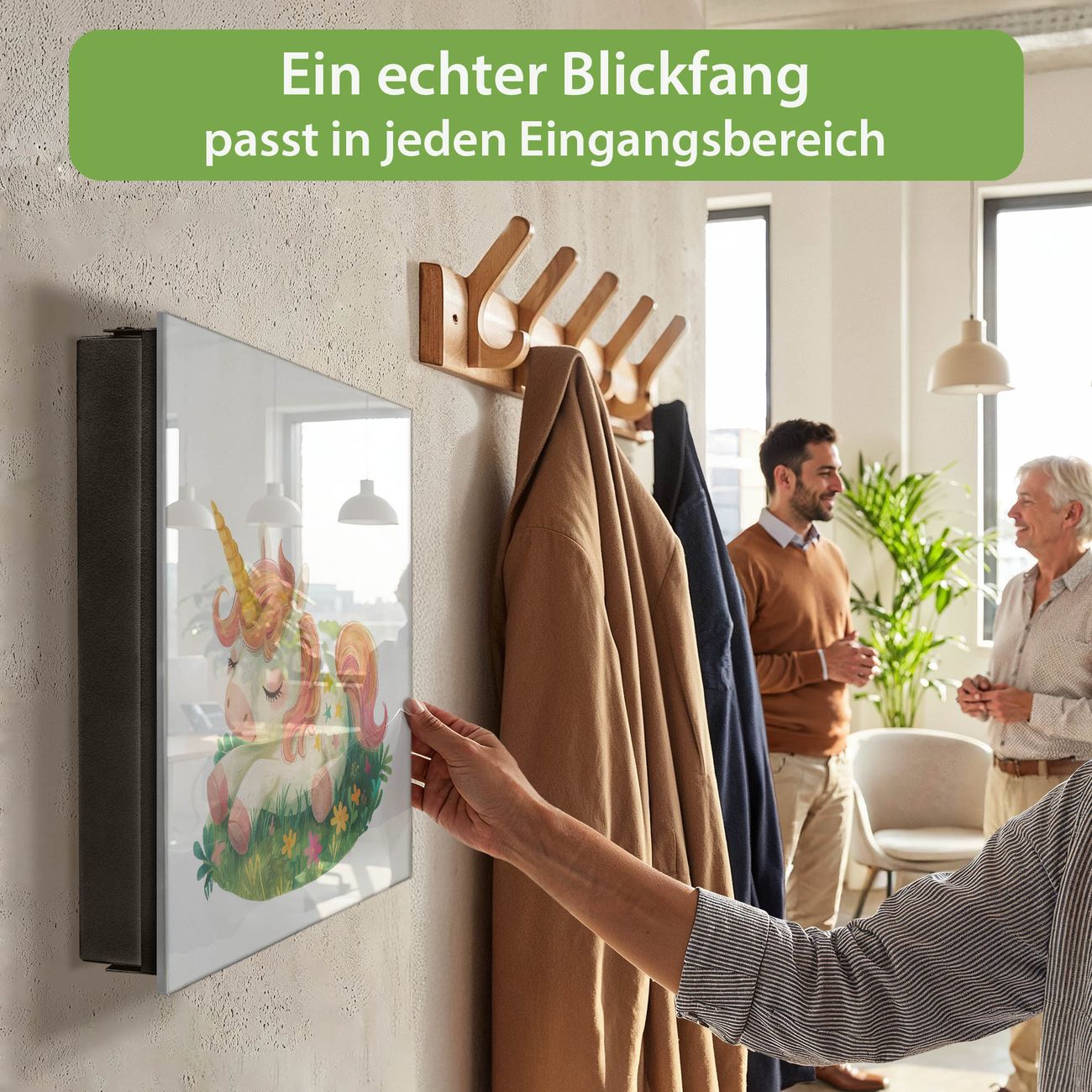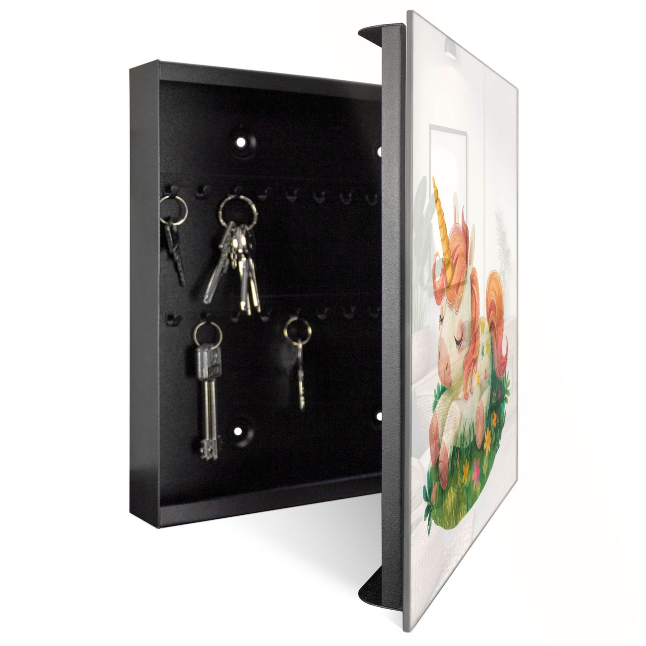 Bringe Ordnung und Eleganz in deinen Eingangsbereich mit dem banjado Schlüsselkasten Motiv Motiv Schlafendes Einhorn. Die moderne Schlüsselbox kombiniert funktionales Design mit hochwertiger Verarbeitung und wird so zu einem echten Hingucker in Flur, Büro oder Ferienwohnung. ✅ Stilvolle Schlüsselaufbewahrung mit Glasfront im Motiv Motiv Schlafendes Einhorn Der Design-Schlüsselkasten Motiv Motiv Schlafendes Einhorn bietet Platz für bis zu 50 Schlüssel, die auf 5 stabilen Reihen mit je 10 Haken übersichtlich verstaut werden. Mit seinen kompakten Maßen von 30 x 30 x 5 cm passt die Schlüsselbox perfekt auch in kleinere Räume. Der schwarz lackierte Stahlkorpus mit rechts angeschlagenem Türscharnier harmoniert mit der Glasfront und fügt sich nahtlos in jedes Wohnambiente ein. Ob als Schlüsselorganizer für Zuhause oder als praktische Lösung für Büros, Praxen und Gewerbe, der banjado Schlüsselkasten sorgt für Ordnung und Übersicht. Dank der magnetischen, mit Kreidestiften beschreibbaren Glasfront kannst du Notizen anheften oder Termine direkt auf der Oberfläche festhalten. Die Schlüsselbox Motiv Motiv Schlafendes Einhorn zur Wandmontage wird inklusive Befestigungsmaterial geliefert und ist schnell angebracht. So hast du deine Schlüssel jederzeit griffbereit und zugleich stilvoll verstaut. Mit diesem banjado Schlüsselkasten Motiv Motiv Schlafendes Einhorn kombinierst du praktische Aufbewahrung mit stilvollem Wohndesign. Ob privat oder geschäftlich, die Schlüsselbox sorgt für mehr Ordnung, Übersicht und ein wohnliches Ambiente.Vorteile im Überblick