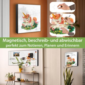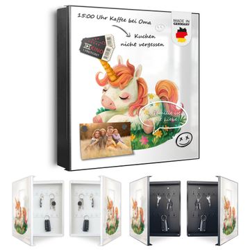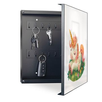 Bringe Ordnung und Eleganz in deinen Eingangsbereich mit dem banjado Schlüsselkasten Motiv Motiv Schlafendes Einhorn. Die moderne Schlüsselbox kombiniert funktionales Design mit hochwertiger Verarbeitung und wird so zu einem echten Hingucker in Flur, Büro oder Ferienwohnung. ✅ Stilvolle Schlüsselaufbewahrung mit Motiv Motiv Schlafendes Einhorn Der Design-Schlüsselkasten Motiv Motiv Schlafendes Einhorn bietet Platz für bis zu 32 Schlüssel, die auf 4 stabilen Reihen mit je 8 Haken übersichtlich verstaut werden. Mit seinen kompakten Maßen von 30 x 30 x 5 cm passt die Schlüsselbox perfekt auch in kleinere Räume. Der schwarz lackierte Stahlkorpus mit rechts angeschlagenem Türscharnier harmoniert mit gedruckten Folie auf der Front und fügt sich nahtlos in jedes Wohnambiente ein. Ob als Schlüsselorganizer für Zuhause oder als praktische Lösung für Büros, Praxen und Gewerbe, der banjado Schlüsselkasten sorgt für Ordnung und Übersicht. Dank der magnetischen, mit Kreidestiften beschreibbaren Folie auf der Front kannst du Notizen anheften oder Termine direkt auf der Oberfläche festhalten. Die Schlüsselbox Motiv Motiv Schlafendes Einhorn zur Wandmontage wird inklusive Befestigungsmaterial geliefert und ist schnell angebracht. So hast du deine Schlüssel jederzeit griffbereit und zugleich stilvoll verstaut. Mit diesem banjado Schlüsselkasten Motiv Motiv Schlafendes Einhorn kombinierst du praktische Aufbewahrung mit stilvollem Wohndesign. Ob privat oder geschäftlich, die Schlüsselbox sorgt für mehr Ordnung, Übersicht und ein wohnliches Ambiente.Vorteile im Überblick