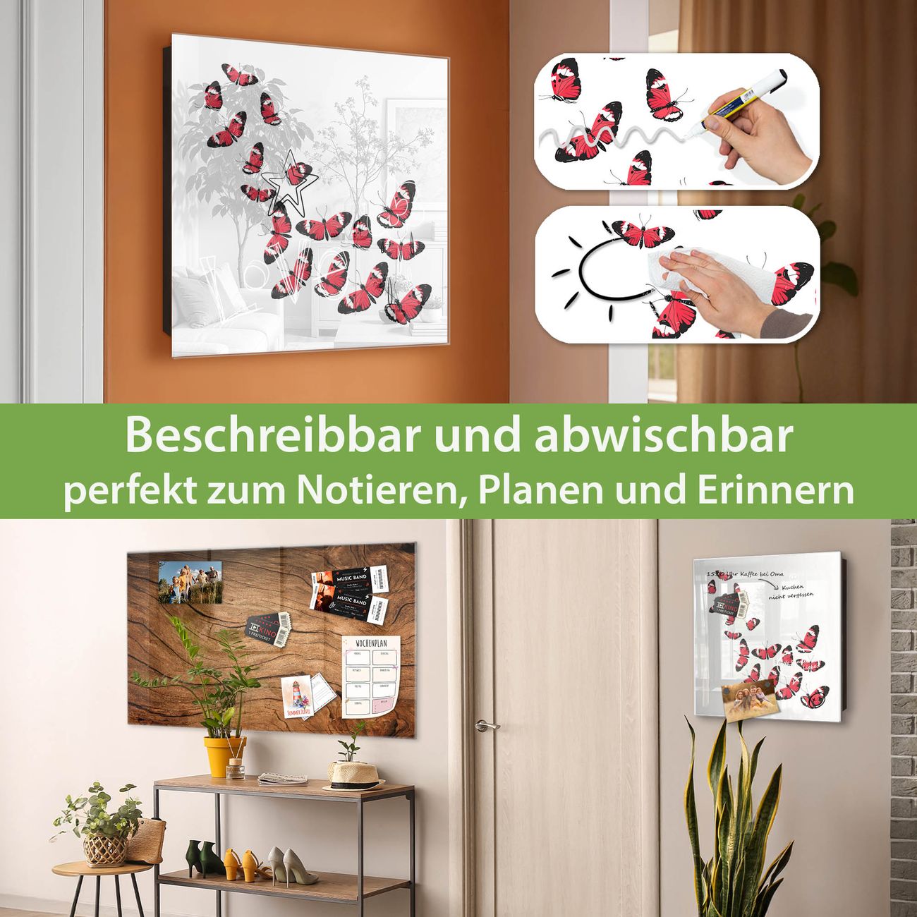 Bringe Ordnung und Eleganz in deinen Eingangsbereich mit dem banjado Schlüsselkasten Motiv Motiv Schmetterlingsflug. Die moderne Schlüsselbox kombiniert funktionales Design mit hochwertiger Verarbeitung und wird so zu einem echten Hingucker in Flur, Büro oder Ferienwohnung. ✅ Stilvolle Schlüsselaufbewahrung mit Glasfront im Motiv Motiv Schmetterlingsflug Der Design-Schlüsselkasten Motiv Motiv Schmetterlingsflug bietet Platz für bis zu 50 Schlüssel, die auf 5 stabilen Reihen mit je 10 Haken übersichtlich verstaut werden. Mit seinen kompakten Maßen von 30 x 30 x 5 cm passt die Schlüsselbox perfekt auch in kleinere Räume. Der schwarz lackierte Stahlkorpus mit rechts angeschlagenem Türscharnier harmoniert mit der Glasfront und fügt sich nahtlos in jedes Wohnambiente ein. Ob als Schlüsselorganizer für Zuhause oder als praktische Lösung für Büros, Praxen und Gewerbe, der banjado Schlüsselkasten sorgt für Ordnung und Übersicht. Dank der magnetischen, mit Kreidestiften beschreibbaren Glasfront kannst du Notizen anheften oder Termine direkt auf der Oberfläche festhalten. Die Schlüsselbox Motiv Motiv Schmetterlingsflug zur Wandmontage wird inklusive Befestigungsmaterial geliefert und ist schnell angebracht. So hast du deine Schlüssel jederzeit griffbereit und zugleich stilvoll verstaut. Mit diesem banjado Schlüsselkasten Motiv Motiv Schmetterlingsflug kombinierst du praktische Aufbewahrung mit stilvollem Wohndesign. Ob privat oder geschäftlich, die Schlüsselbox sorgt für mehr Ordnung, Übersicht und ein wohnliches Ambiente.Vorteile im Überblick