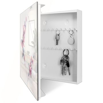 Bringe Ordnung und Eleganz in deinen Eingangsbereich mit dem banjado Schlüsselkasten Motiv Motiv Schmetterlingsgarten 2. Die moderne Schlüsselbox kombiniert funktionales Design mit hochwertiger Verarbeitung und wird so zu einem echten Hingucker in Flur, Büro oder Ferienwohnung. ✅ Stilvolle Schlüsselaufbewahrung mit Glasfront im Motiv Motiv Schmetterlingsgarten 2 Der Design-Schlüsselkasten Motiv Motiv Schmetterlingsgarten 2 bietet Platz für bis zu 50 Schlüssel, die auf 5 stabilen Reihen mit je 10 Haken übersichtlich verstaut werden. Mit seinen kompakten Maßen von 30 x 30 x 5 cm passt die Schlüsselbox perfekt auch in kleinere Räume. Der weiß lackierte Stahlkorpus mit rechts angeschlagenem Türscharnier harmoniert mit der Glasfront und fügt sich nahtlos in jedes Wohnambiente ein. Ob als Schlüsselorganizer für Zuhause oder als praktische Lösung für Büros, Praxen und Gewerbe, der banjado Schlüsselkasten sorgt für Ordnung und Übersicht. Dank der magnetischen, mit Kreidestiften beschreibbaren Glasfront kannst du Notizen anheften oder Termine direkt auf der Oberfläche festhalten. Die Schlüsselbox Motiv Motiv Schmetterlingsgarten 2 zur Wandmontage wird inklusive Befestigungsmaterial geliefert und ist schnell angebracht. So hast du deine Schlüssel jederzeit griffbereit und zugleich stilvoll verstaut. Mit diesem banjado Schlüsselkasten Motiv Motiv Schmetterlingsgarten 2 kombinierst du praktische Aufbewahrung mit stilvollem Wohndesign. Ob privat oder geschäftlich, die Schlüsselbox sorgt für mehr Ordnung, Übersicht und ein wohnliches Ambiente.Vorteile im Überblick