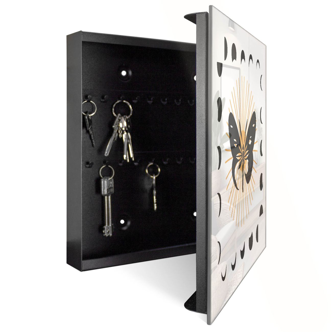 Bringe Ordnung und Eleganz in deinen Eingangsbereich mit dem banjado Schlüsselkasten Motiv Motiv Schmetterlingsmystik. Die moderne Schlüsselbox kombiniert funktionales Design mit hochwertiger Verarbeitung und wird so zu einem echten Hingucker in Flur, Büro oder Ferienwohnung. ✅ Stilvolle Schlüsselaufbewahrung mit Glasfront im Motiv Motiv Schmetterlingsmystik Der Design-Schlüsselkasten Motiv Motiv Schmetterlingsmystik bietet Platz für bis zu 50 Schlüssel, die auf 5 stabilen Reihen mit je 10 Haken übersichtlich verstaut werden. Mit seinen kompakten Maßen von 30 x 30 x 5 cm passt die Schlüsselbox perfekt auch in kleinere Räume. Der schwarz lackierte Stahlkorpus mit rechts angeschlagenem Türscharnier harmoniert mit der Glasfront und fügt sich nahtlos in jedes Wohnambiente ein. Ob als Schlüsselorganizer für Zuhause oder als praktische Lösung für Büros, Praxen und Gewerbe, der banjado Schlüsselkasten sorgt für Ordnung und Übersicht. Dank der magnetischen, mit Kreidestiften beschreibbaren Glasfront kannst du Notizen anheften oder Termine direkt auf der Oberfläche festhalten. Die Schlüsselbox Motiv Motiv Schmetterlingsmystik zur Wandmontage wird inklusive Befestigungsmaterial geliefert und ist schnell angebracht. So hast du deine Schlüssel jederzeit griffbereit und zugleich stilvoll verstaut. Mit diesem banjado Schlüsselkasten Motiv Motiv Schmetterlingsmystik kombinierst du praktische Aufbewahrung mit stilvollem Wohndesign. Ob privat oder geschäftlich, die Schlüsselbox sorgt für mehr Ordnung, Übersicht und ein wohnliches Ambiente.Vorteile im Überblick