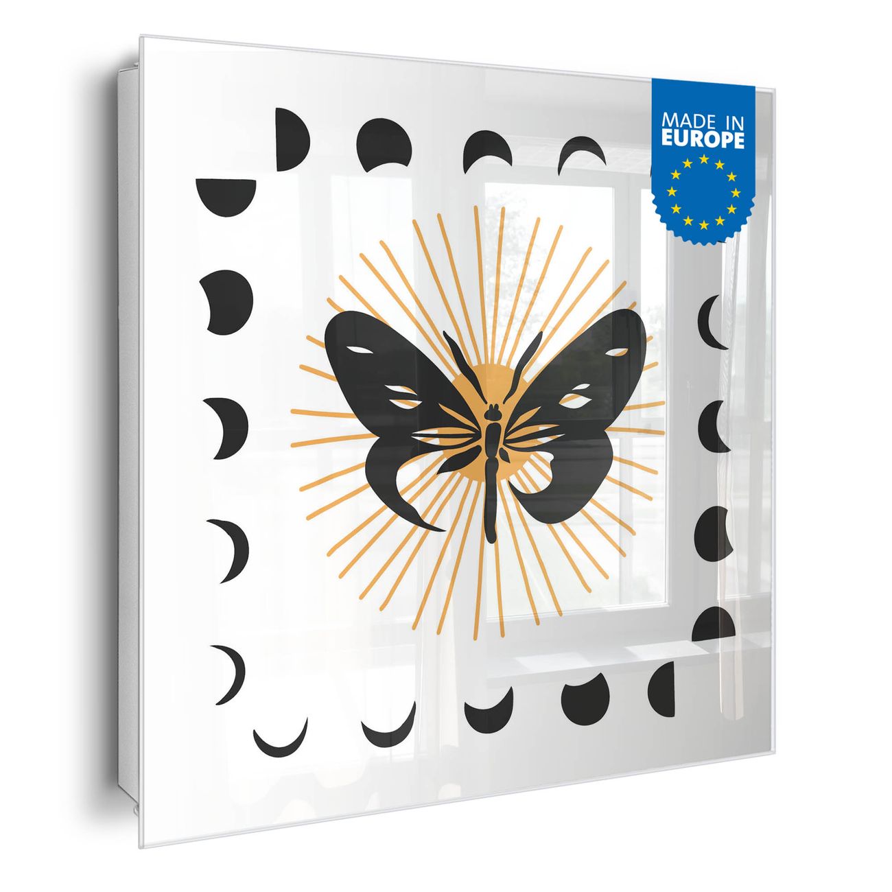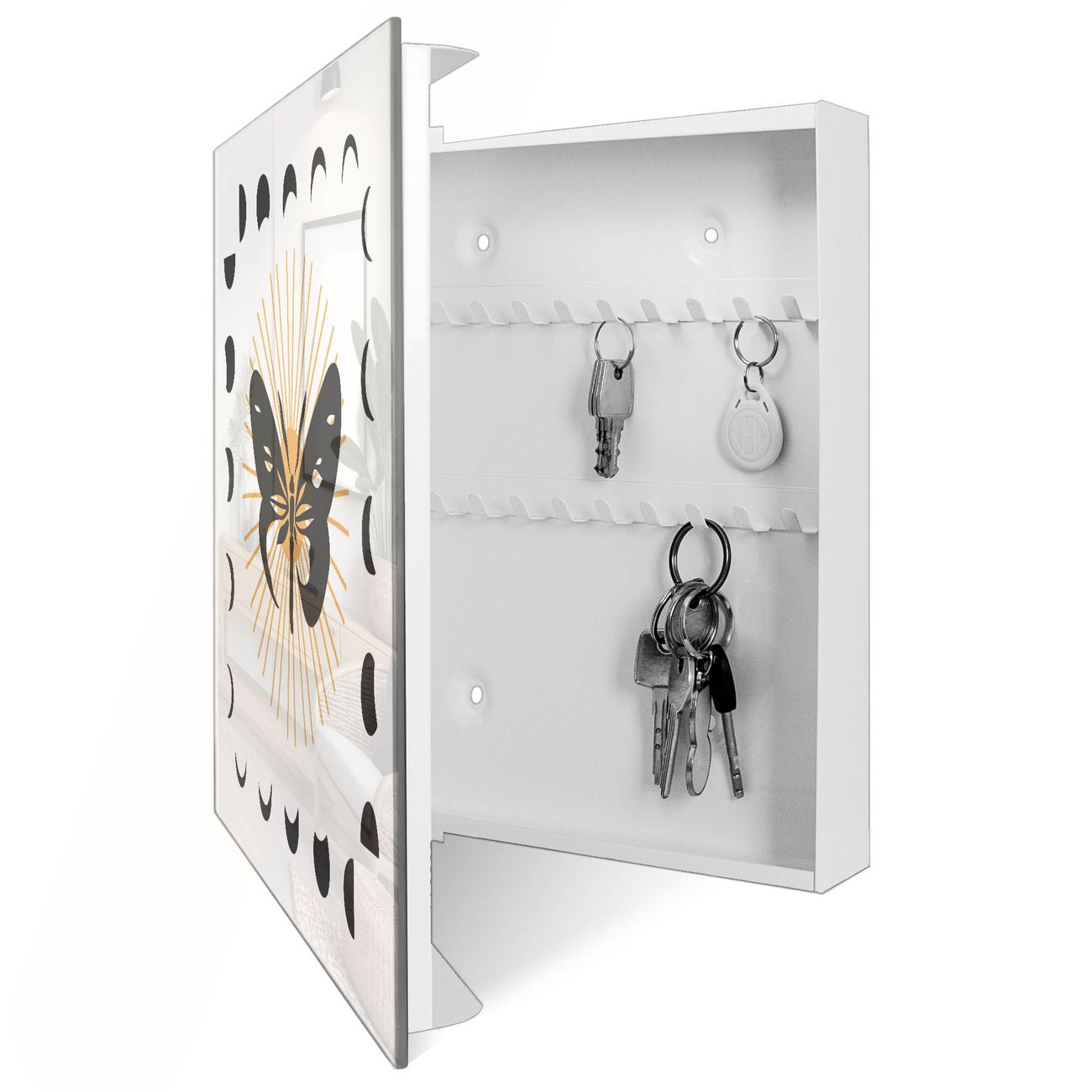 Bringe Ordnung und Eleganz in deinen Eingangsbereich mit dem banjado Schlüsselkasten Motiv Motiv Schmetterlingsmystik. Die moderne Schlüsselbox kombiniert funktionales Design mit hochwertiger Verarbeitung und wird so zu einem echten Hingucker in Flur, Büro oder Ferienwohnung. ✅ Stilvolle Schlüsselaufbewahrung mit Glasfront im Motiv Motiv Schmetterlingsmystik Der Design-Schlüsselkasten Motiv Motiv Schmetterlingsmystik bietet Platz für bis zu 50 Schlüssel, die auf 5 stabilen Reihen mit je 10 Haken übersichtlich verstaut werden. Mit seinen kompakten Maßen von 30 x 30 x 5 cm passt die Schlüsselbox perfekt auch in kleinere Räume. Der weiß lackierte Stahlkorpus mit rechts angeschlagenem Türscharnier harmoniert mit der Glasfront und fügt sich nahtlos in jedes Wohnambiente ein. Ob als Schlüsselorganizer für Zuhause oder als praktische Lösung für Büros, Praxen und Gewerbe, der banjado Schlüsselkasten sorgt für Ordnung und Übersicht. Dank der magnetischen, mit Kreidestiften beschreibbaren Glasfront kannst du Notizen anheften oder Termine direkt auf der Oberfläche festhalten. Die Schlüsselbox Motiv Motiv Schmetterlingsmystik zur Wandmontage wird inklusive Befestigungsmaterial geliefert und ist schnell angebracht. So hast du deine Schlüssel jederzeit griffbereit und zugleich stilvoll verstaut. Mit diesem banjado Schlüsselkasten Motiv Motiv Schmetterlingsmystik kombinierst du praktische Aufbewahrung mit stilvollem Wohndesign. Ob privat oder geschäftlich, die Schlüsselbox sorgt für mehr Ordnung, Übersicht und ein wohnliches Ambiente.Vorteile im Überblick