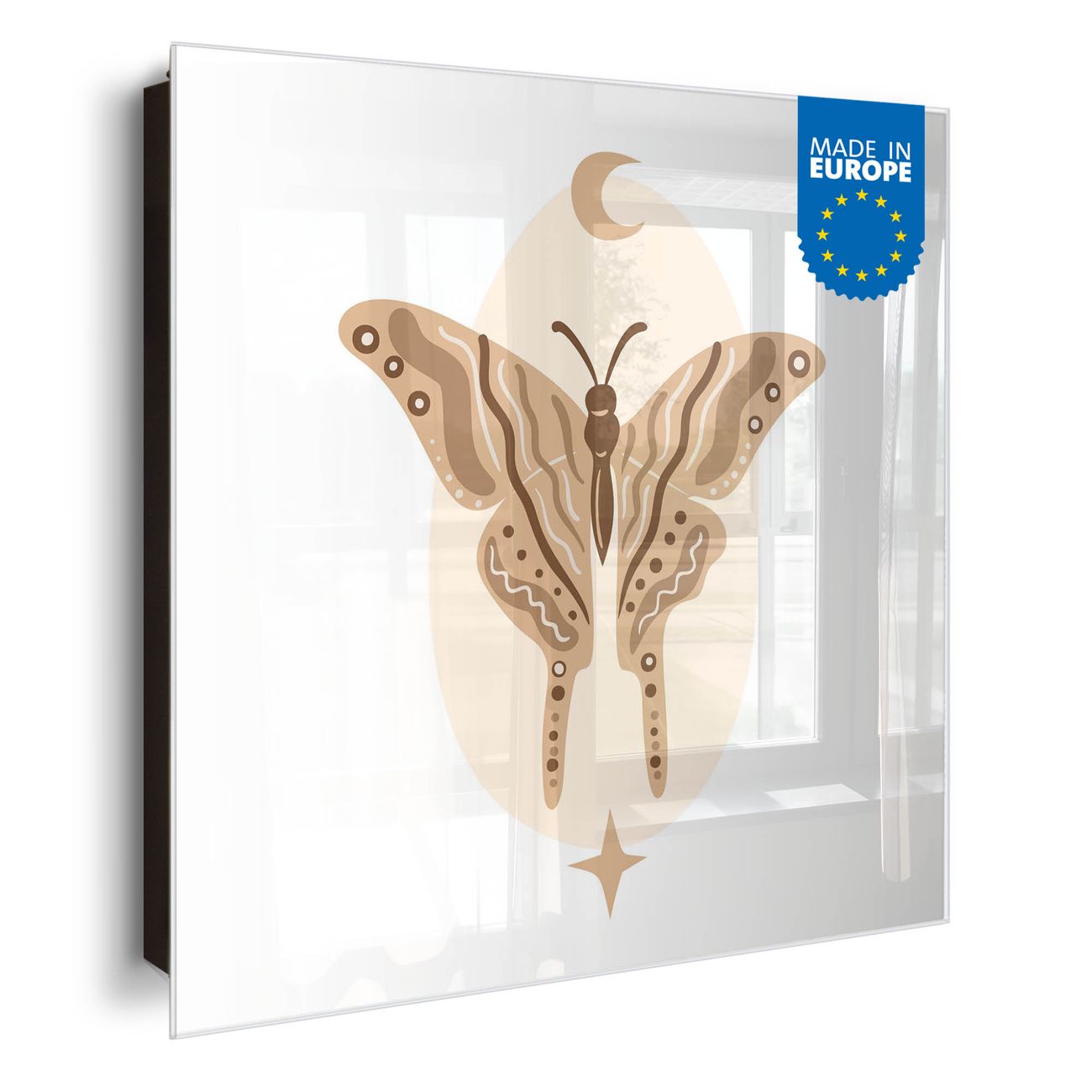 Bringe Ordnung und Eleganz in deinen Eingangsbereich mit dem banjado Schlüsselkasten Motiv Motiv Schmetterlingsnacht. Die moderne Schlüsselbox kombiniert funktionales Design mit hochwertiger Verarbeitung und wird so zu einem echten Hingucker in Flur, Büro oder Ferienwohnung. ✅ Stilvolle Schlüsselaufbewahrung mit Glasfront im Motiv Motiv Schmetterlingsnacht Der Design-Schlüsselkasten Motiv Motiv Schmetterlingsnacht bietet Platz für bis zu 50 Schlüssel, die auf 5 stabilen Reihen mit je 10 Haken übersichtlich verstaut werden. Mit seinen kompakten Maßen von 30 x 30 x 5 cm passt die Schlüsselbox perfekt auch in kleinere Räume. Der schwarz lackierte Stahlkorpus mit rechts angeschlagenem Türscharnier harmoniert mit der Glasfront und fügt sich nahtlos in jedes Wohnambiente ein. Ob als Schlüsselorganizer für Zuhause oder als praktische Lösung für Büros, Praxen und Gewerbe, der banjado Schlüsselkasten sorgt für Ordnung und Übersicht. Dank der magnetischen, mit Kreidestiften beschreibbaren Glasfront kannst du Notizen anheften oder Termine direkt auf der Oberfläche festhalten. Die Schlüsselbox Motiv Motiv Schmetterlingsnacht zur Wandmontage wird inklusive Befestigungsmaterial geliefert und ist schnell angebracht. So hast du deine Schlüssel jederzeit griffbereit und zugleich stilvoll verstaut. Mit diesem banjado Schlüsselkasten Motiv Motiv Schmetterlingsnacht kombinierst du praktische Aufbewahrung mit stilvollem Wohndesign. Ob privat oder geschäftlich, die Schlüsselbox sorgt für mehr Ordnung, Übersicht und ein wohnliches Ambiente.Vorteile im Überblick