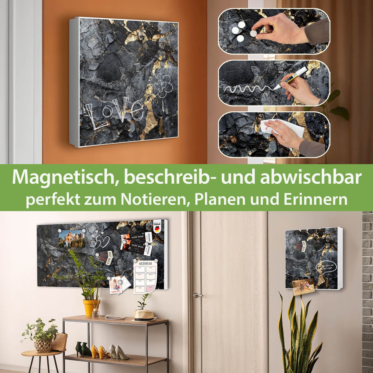 Bringe Ordnung und Eleganz in deinen Eingangsbereich mit dem banjado Schlüsselkasten Motiv Motiv Schwarzer Marmor mit Gold 1. Die moderne Schlüsselbox kombiniert funktionales Design mit hochwertiger Verarbeitung und wird so zu einem echten Hingucker in Flur, Büro oder Ferienwohnung. ✅ Stilvolle Schlüsselaufbewahrung mit Motiv Motiv Schwarzer Marmor mit Gold 1 Der Design-Schlüsselkasten Motiv Motiv Schwarzer Marmor mit Gold 1 bietet Platz für bis zu 32 Schlüssel, die auf 4 stabilen Reihen mit je 8 Haken übersichtlich verstaut werden. Mit seinen kompakten Maßen von 30 x 30 x 5 cm passt die Schlüsselbox perfekt auch in kleinere Räume. Der weiß lackierte Stahlkorpus mit rechts angeschlagenem Türscharnier harmoniert mit gedruckten Folie auf der Front und fügt sich nahtlos in jedes Wohnambiente ein. Ob als Schlüsselorganizer für Zuhause oder als praktische Lösung für Büros, Praxen und Gewerbe, der banjado Schlüsselkasten sorgt für Ordnung und Übersicht. Dank der magnetischen, mit Kreidestiften beschreibbaren Folie auf der Front kannst du Notizen anheften oder Termine direkt auf der Oberfläche festhalten. Die Schlüsselbox Motiv Motiv Schwarzer Marmor mit Gold 1 zur Wandmontage wird inklusive Befestigungsmaterial geliefert und ist schnell angebracht. So hast du deine Schlüssel jederzeit griffbereit und zugleich stilvoll verstaut. Mit diesem banjado Schlüsselkasten Motiv Motiv Schwarzer Marmor mit Gold 1 kombinierst du praktische Aufbewahrung mit stilvollem Wohndesign. Ob privat oder geschäftlich, die Schlüsselbox sorgt für mehr Ordnung, Übersicht und ein wohnliches Ambiente.Vorteile im Überblick