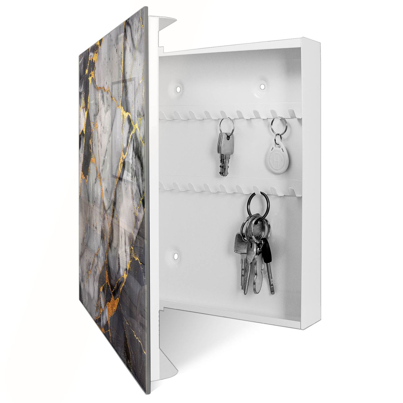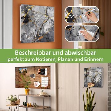 Bringe Ordnung und Eleganz in deinen Eingangsbereich mit dem banjado Schlüsselkasten Motiv Schwarzer Marmor mit Gold 2. Die moderne Schlüsselbox kombiniert funktionales Design mit hochwertiger Verarbeitung und wird so zu einem echten Hingucker in Flur, Büro oder Ferienwohnung. ✅ Stilvolle Schlüsselaufbewahrung mit Glasfront im Motiv Motiv Schwarzer Marmor mit Gold 2 Der Design-Schlüsselkasten Motiv Schwarzer Marmor mit Gold 2 bietet Platz für bis zu 50 Schlüssel, die auf 5 stabilen Reihen mit je 10 Haken übersichtlich verstaut werden. Mit seinen kompakten Maßen von 30 x 30 x 5 cm passt die Schlüsselbox perfekt auch in kleinere Räume. Der weiß lackierte Stahlkorpus mit rechts angeschlagenem Türscharnier harmoniert mit der Glasfront und fügt sich nahtlos in jedes Wohnambiente ein. Ob als Schlüsselorganizer für Zuhause oder als praktische Lösung für Büros, Praxen und Gewerbe, der banjado Schlüsselkasten sorgt für Ordnung und Übersicht. Dank der magnetischen, mit Kreidestiften beschreibbaren Glasfront kannst du Notizen anheften oder Termine direkt auf der Oberfläche festhalten. Die Schlüsselbox Motiv Schwarzer Marmor mit Gold 2 zur Wandmontage wird inklusive Befestigungsmaterial geliefert und ist schnell angebracht. So hast du deine Schlüssel jederzeit griffbereit und zugleich stilvoll verstaut. Mit diesem banjado Schlüsselkasten Motiv Schwarzer Marmor mit Gold 2 kombinierst du praktische Aufbewahrung mit stilvollem Wohndesign. Ob privat oder geschäftlich, die Schlüsselbox sorgt für mehr Ordnung, Übersicht und ein wohnliches Ambiente.Vorteile im Überblick