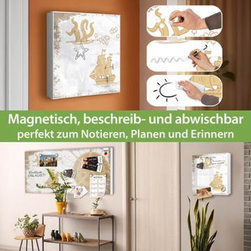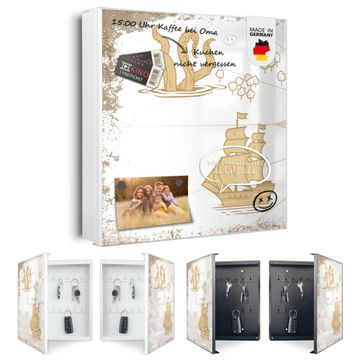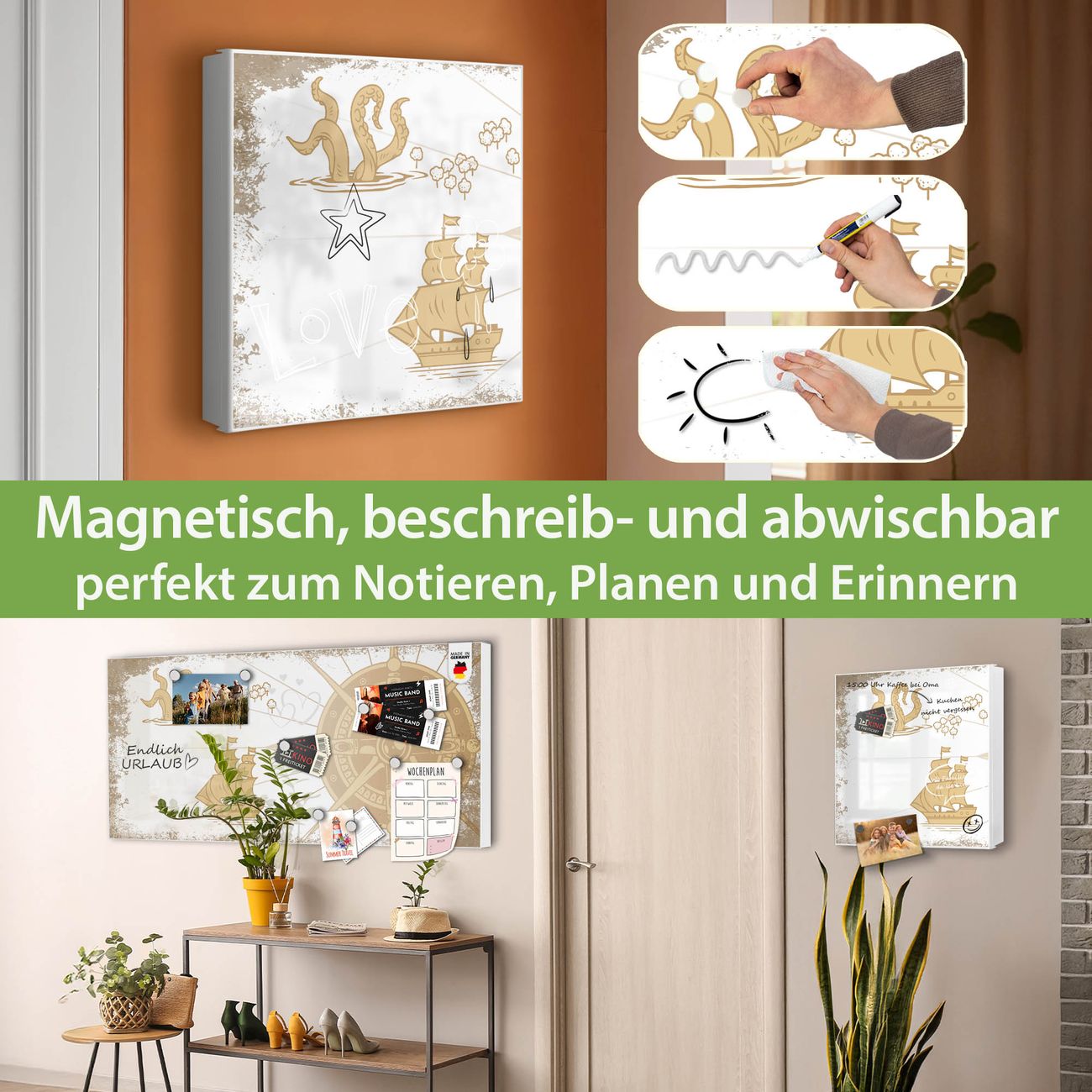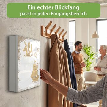 Bringe Ordnung und Eleganz in deinen Eingangsbereich mit dem banjado Schlüsselkasten Motiv Motiv Seemonster und Segelschiff. Die moderne Schlüsselbox kombiniert funktionales Design mit hochwertiger Verarbeitung und wird so zu einem echten Hingucker in Flur, Büro oder Ferienwohnung. ✅ Stilvolle Schlüsselaufbewahrung mit Motiv Motiv Seemonster und Segelschiff Der Design-Schlüsselkasten Motiv Motiv Seemonster und Segelschiff bietet Platz für bis zu 32 Schlüssel, die auf 4 stabilen Reihen mit je 8 Haken übersichtlich verstaut werden. Mit seinen kompakten Maßen von 30 x 30 x 5 cm passt die Schlüsselbox perfekt auch in kleinere Räume. Der weiß lackierte Stahlkorpus mit links angeschlagenem Türscharnier harmoniert mit gedruckten Folie auf der Front und fügt sich nahtlos in jedes Wohnambiente ein. Ob als Schlüsselorganizer für Zuhause oder als praktische Lösung für Büros, Praxen und Gewerbe, der banjado Schlüsselkasten sorgt für Ordnung und Übersicht. Dank der magnetischen, mit Kreidestiften beschreibbaren Folie auf der Front kannst du Notizen anheften oder Termine direkt auf der Oberfläche festhalten. Die Schlüsselbox Motiv Motiv Seemonster und Segelschiff zur Wandmontage wird inklusive Befestigungsmaterial geliefert und ist schnell angebracht. So hast du deine Schlüssel jederzeit griffbereit und zugleich stilvoll verstaut. Mit diesem banjado Schlüsselkasten Motiv Motiv Seemonster und Segelschiff kombinierst du praktische Aufbewahrung mit stilvollem Wohndesign. Ob privat oder geschäftlich, die Schlüsselbox sorgt für mehr Ordnung, Übersicht und ein wohnliches Ambiente.Vorteile im Überblick