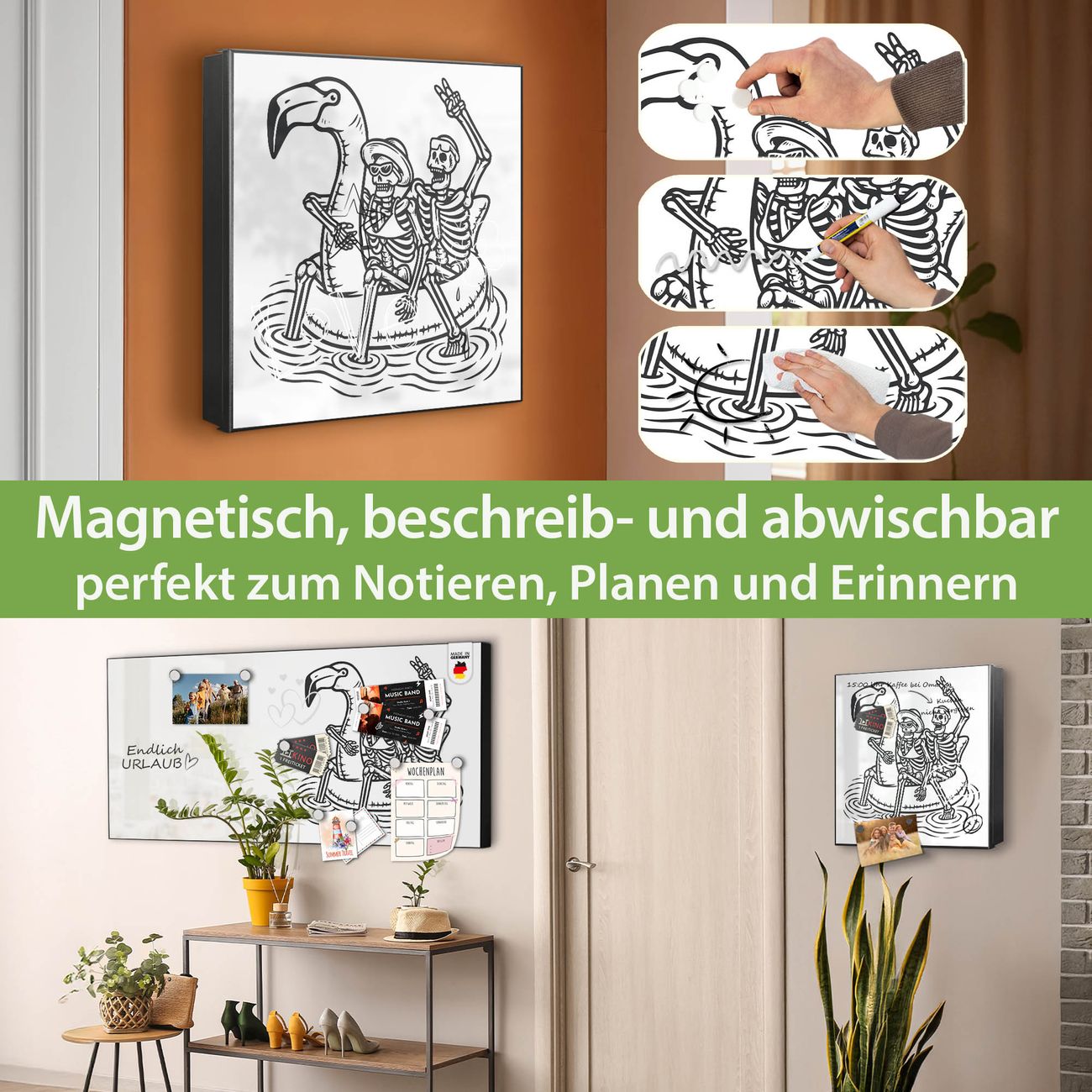 Bringe Ordnung und Eleganz in deinen Eingangsbereich mit dem banjado Schlüsselkasten Motiv Motiv Skelette mit Flamingoschwimmring 2. Die moderne Schlüsselbox kombiniert funktionales Design mit hochwertiger Verarbeitung und wird so zu einem echten Hingucker in Flur, Büro oder Ferienwohnung. ✅ Stilvolle Schlüsselaufbewahrung mit Motiv Motiv Skelette mit Flamingoschwimmring 2 Der Design-Schlüsselkasten Motiv Motiv Skelette mit Flamingoschwimmring 2 bietet Platz für bis zu 32 Schlüssel, die auf 4 stabilen Reihen mit je 8 Haken übersichtlich verstaut werden. Mit seinen kompakten Maßen von 30 x 30 x 5 cm passt die Schlüsselbox perfekt auch in kleinere Räume. Der schwarz lackierte Stahlkorpus mit rechts angeschlagenem Türscharnier harmoniert mit gedruckten Folie auf der Front und fügt sich nahtlos in jedes Wohnambiente ein. Ob als Schlüsselorganizer für Zuhause oder als praktische Lösung für Büros, Praxen und Gewerbe, der banjado Schlüsselkasten sorgt für Ordnung und Übersicht. Dank der magnetischen, mit Kreidestiften beschreibbaren Folie auf der Front kannst du Notizen anheften oder Termine direkt auf der Oberfläche festhalten. Die Schlüsselbox Motiv Motiv Skelette mit Flamingoschwimmring 2 zur Wandmontage wird inklusive Befestigungsmaterial geliefert und ist schnell angebracht. So hast du deine Schlüssel jederzeit griffbereit und zugleich stilvoll verstaut. Mit diesem banjado Schlüsselkasten Motiv Motiv Skelette mit Flamingoschwimmring 2 kombinierst du praktische Aufbewahrung mit stilvollem Wohndesign. Ob privat oder geschäftlich, die Schlüsselbox sorgt für mehr Ordnung, Übersicht und ein wohnliches Ambiente.Vorteile im Überblick