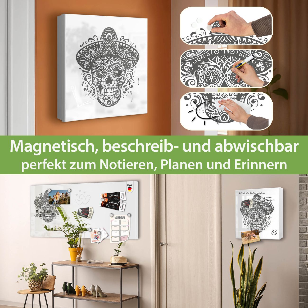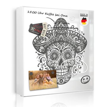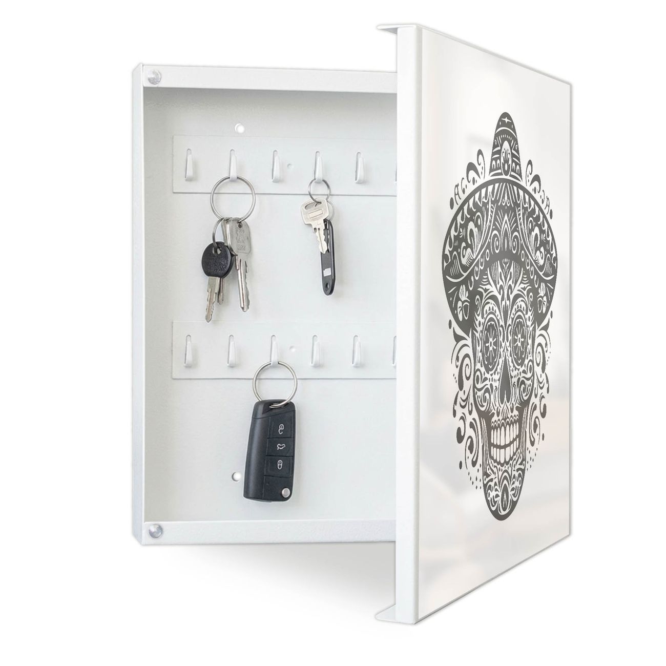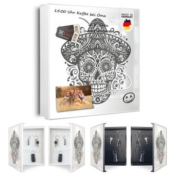 Bringe Ordnung und Eleganz in deinen Eingangsbereich mit dem banjado Schlüsselkasten Motiv Motiv Sombrero Totenkopf. Die moderne Schlüsselbox kombiniert funktionales Design mit hochwertiger Verarbeitung und wird so zu einem echten Hingucker in Flur, Büro oder Ferienwohnung. ✅ Stilvolle Schlüsselaufbewahrung mit Motiv Motiv Sombrero Totenkopf Der Design-Schlüsselkasten Motiv Motiv Sombrero Totenkopf bietet Platz für bis zu 32 Schlüssel, die auf 4 stabilen Reihen mit je 8 Haken übersichtlich verstaut werden. Mit seinen kompakten Maßen von 30 x 30 x 5 cm passt die Schlüsselbox perfekt auch in kleinere Räume. Der weiß lackierte Stahlkorpus mit rechts angeschlagenem Türscharnier harmoniert mit gedruckten Folie auf der Front und fügt sich nahtlos in jedes Wohnambiente ein. Ob als Schlüsselorganizer für Zuhause oder als praktische Lösung für Büros, Praxen und Gewerbe, der banjado Schlüsselkasten sorgt für Ordnung und Übersicht. Dank der magnetischen, mit Kreidestiften beschreibbaren Folie auf der Front kannst du Notizen anheften oder Termine direkt auf der Oberfläche festhalten. Die Schlüsselbox Motiv Motiv Sombrero Totenkopf zur Wandmontage wird inklusive Befestigungsmaterial geliefert und ist schnell angebracht. So hast du deine Schlüssel jederzeit griffbereit und zugleich stilvoll verstaut. Mit diesem banjado Schlüsselkasten Motiv Motiv Sombrero Totenkopf kombinierst du praktische Aufbewahrung mit stilvollem Wohndesign. Ob privat oder geschäftlich, die Schlüsselbox sorgt für mehr Ordnung, Übersicht und ein wohnliches Ambiente.Vorteile im Überblick
