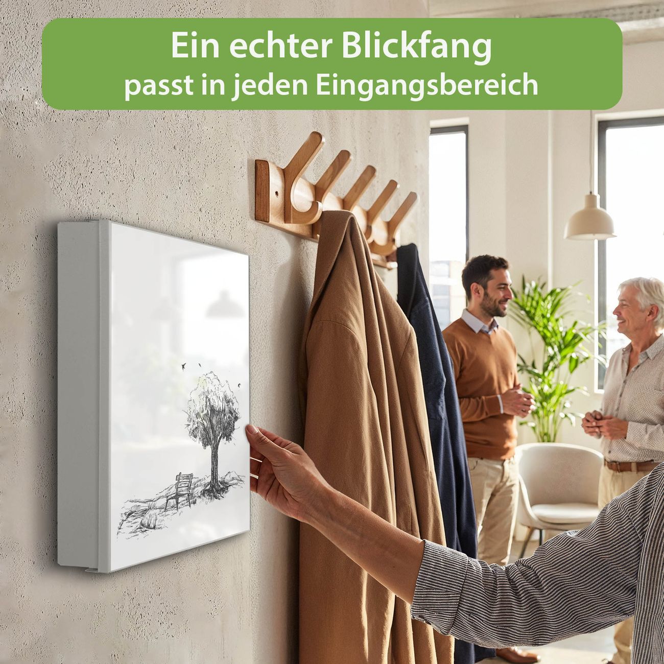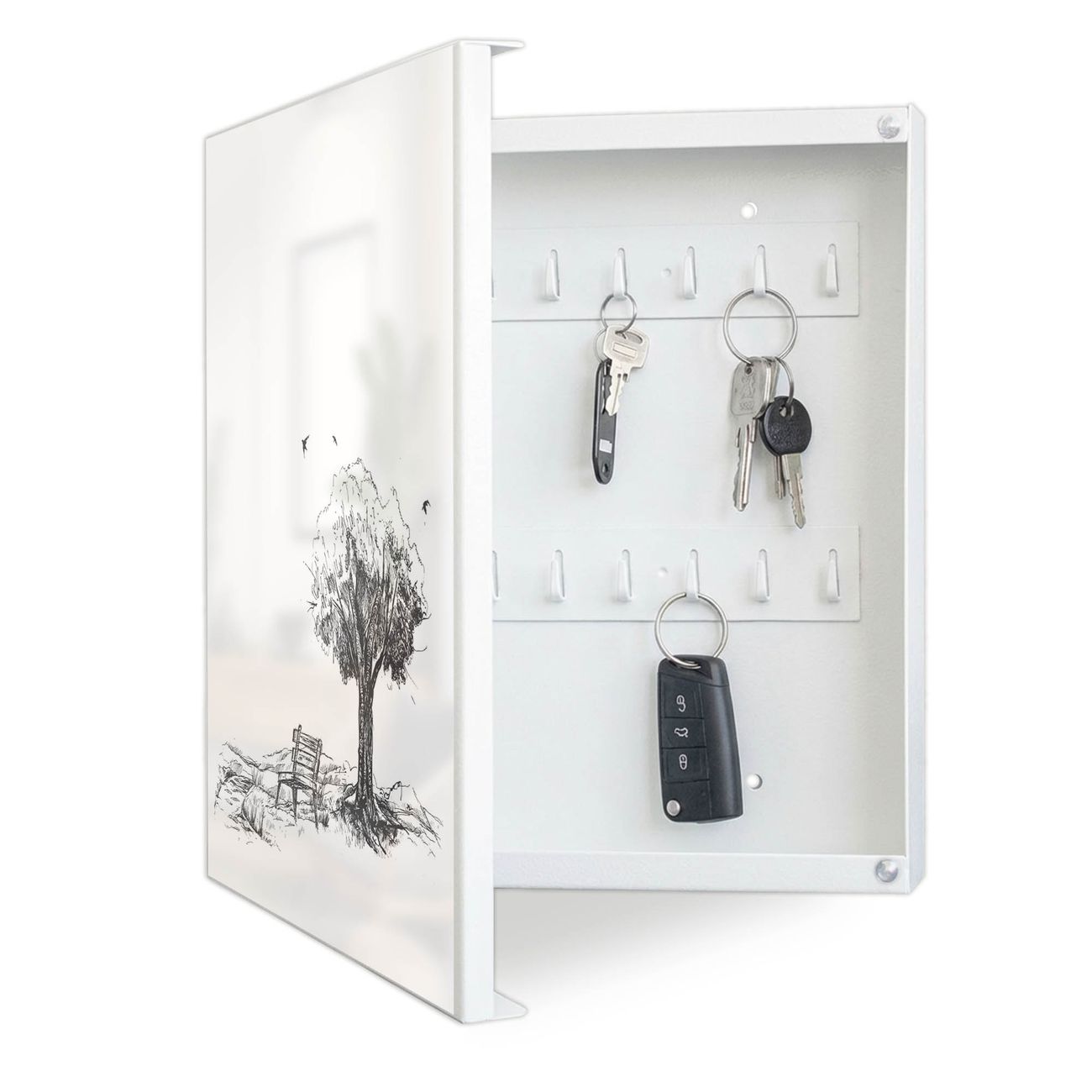 Bringe Ordnung und Eleganz in deinen Eingangsbereich mit dem banjado Schlüsselkasten Motiv Motiv Sommerliche Parkszene. Die moderne Schlüsselbox kombiniert funktionales Design mit hochwertiger Verarbeitung und wird so zu einem echten Hingucker in Flur, Büro oder Ferienwohnung. ✅ Stilvolle Schlüsselaufbewahrung mit Motiv Motiv Sommerliche Parkszene Der Design-Schlüsselkasten Motiv Motiv Sommerliche Parkszene bietet Platz für bis zu 32 Schlüssel, die auf 4 stabilen Reihen mit je 8 Haken übersichtlich verstaut werden. Mit seinen kompakten Maßen von 30 x 30 x 5 cm passt die Schlüsselbox perfekt auch in kleinere Räume. Der weiß lackierte Stahlkorpus mit links angeschlagenem Türscharnier harmoniert mit gedruckten Folie auf der Front und fügt sich nahtlos in jedes Wohnambiente ein. Ob als Schlüsselorganizer für Zuhause oder als praktische Lösung für Büros, Praxen und Gewerbe, der banjado Schlüsselkasten sorgt für Ordnung und Übersicht. Dank der magnetischen, mit Kreidestiften beschreibbaren Folie auf der Front kannst du Notizen anheften oder Termine direkt auf der Oberfläche festhalten. Die Schlüsselbox Motiv Motiv Sommerliche Parkszene zur Wandmontage wird inklusive Befestigungsmaterial geliefert und ist schnell angebracht. So hast du deine Schlüssel jederzeit griffbereit und zugleich stilvoll verstaut. Mit diesem banjado Schlüsselkasten Motiv Motiv Sommerliche Parkszene kombinierst du praktische Aufbewahrung mit stilvollem Wohndesign. Ob privat oder geschäftlich, die Schlüsselbox sorgt für mehr Ordnung, Übersicht und ein wohnliches Ambiente.Vorteile im Überblick
