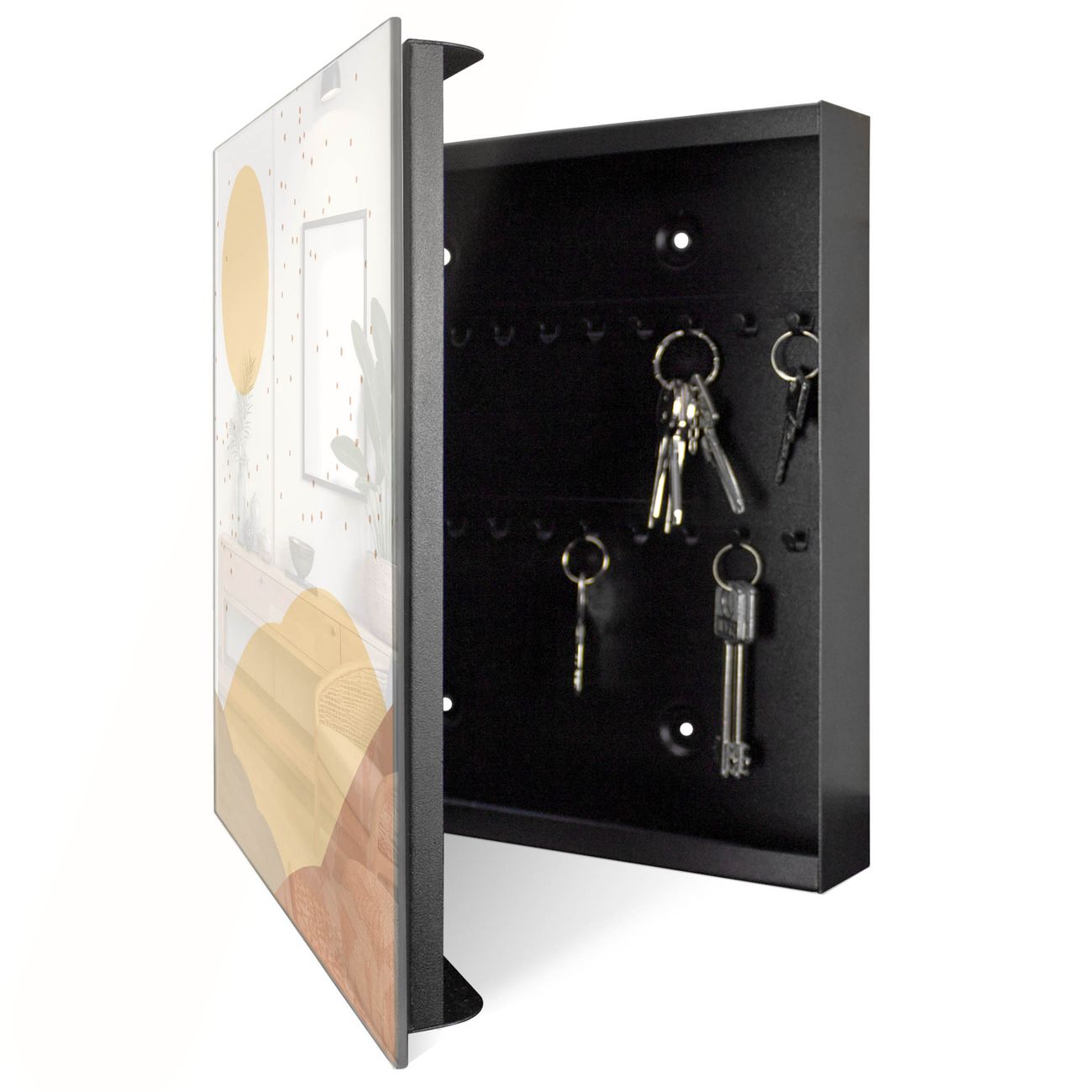 Bringe Ordnung und Eleganz in deinen Eingangsbereich mit dem banjado Schlüsselkasten Motiv Motiv Sommertag Abstrakt. Die moderne Schlüsselbox kombiniert funktionales Design mit hochwertiger Verarbeitung und wird so zu einem echten Hingucker in Flur, Büro oder Ferienwohnung. ✅ Stilvolle Schlüsselaufbewahrung mit Glasfront im Motiv Motiv Sommertag Abstrakt Der Design-Schlüsselkasten Motiv Motiv Sommertag Abstrakt bietet Platz für bis zu 50 Schlüssel, die auf 5 stabilen Reihen mit je 10 Haken übersichtlich verstaut werden. Mit seinen kompakten Maßen von 30 x 30 x 5 cm passt die Schlüsselbox perfekt auch in kleinere Räume. Der schwarz lackierte Stahlkorpus mit rechts angeschlagenem Türscharnier harmoniert mit der Glasfront und fügt sich nahtlos in jedes Wohnambiente ein. Ob als Schlüsselorganizer für Zuhause oder als praktische Lösung für Büros, Praxen und Gewerbe, der banjado Schlüsselkasten sorgt für Ordnung und Übersicht. Dank der magnetischen, mit Kreidestiften beschreibbaren Glasfront kannst du Notizen anheften oder Termine direkt auf der Oberfläche festhalten. Die Schlüsselbox Motiv Motiv Sommertag Abstrakt zur Wandmontage wird inklusive Befestigungsmaterial geliefert und ist schnell angebracht. So hast du deine Schlüssel jederzeit griffbereit und zugleich stilvoll verstaut. Mit diesem banjado Schlüsselkasten Motiv Motiv Sommertag Abstrakt kombinierst du praktische Aufbewahrung mit stilvollem Wohndesign. Ob privat oder geschäftlich, die Schlüsselbox sorgt für mehr Ordnung, Übersicht und ein wohnliches Ambiente.Vorteile im Überblick