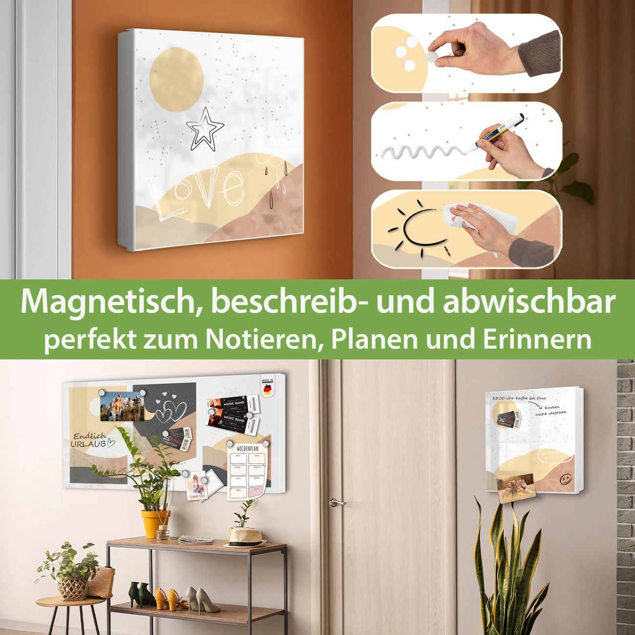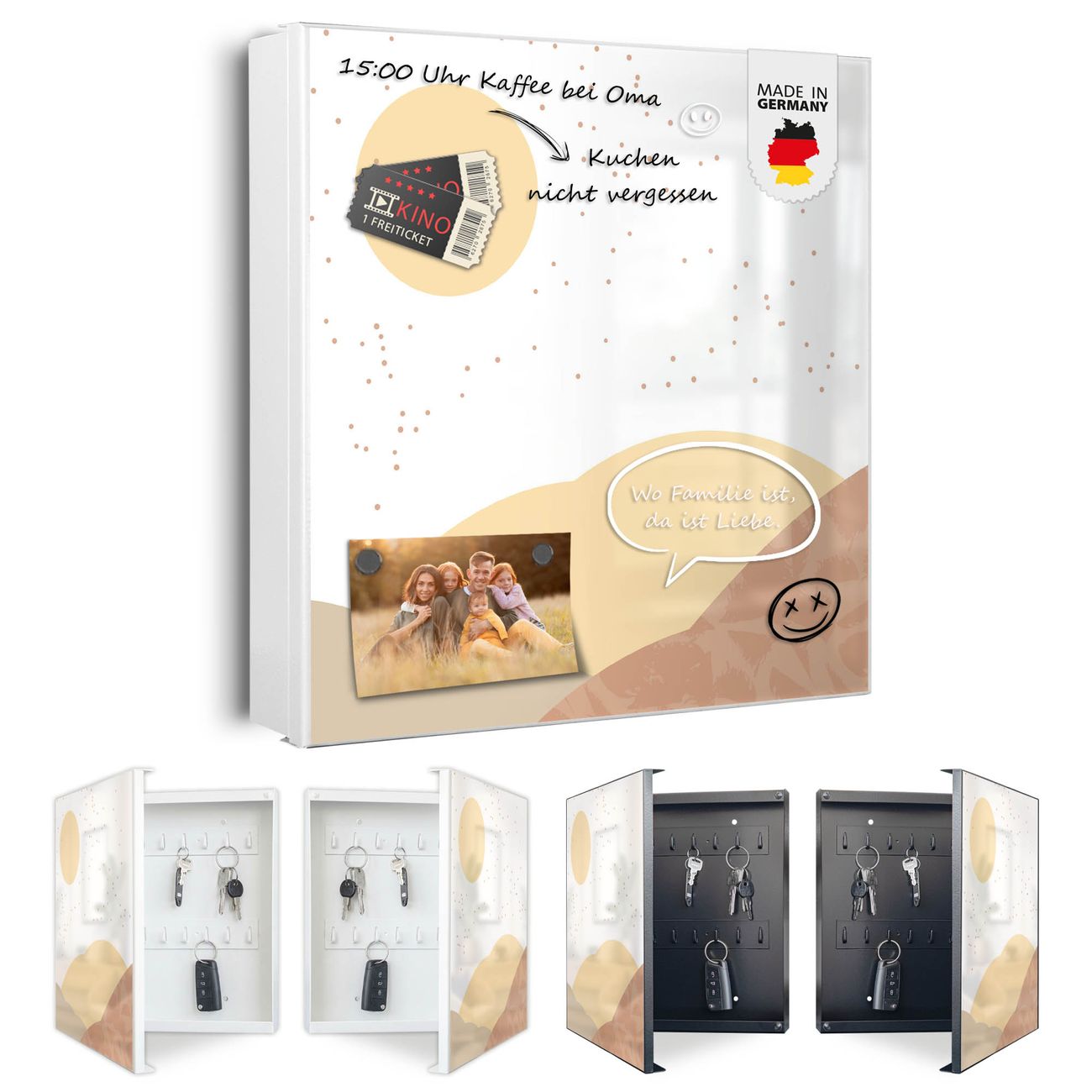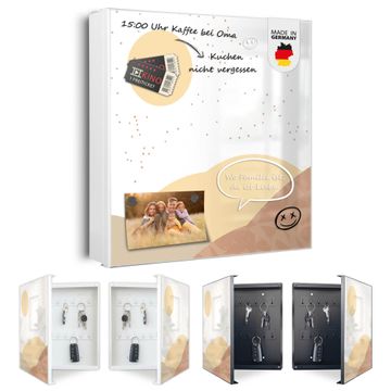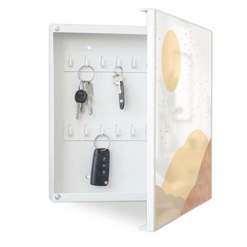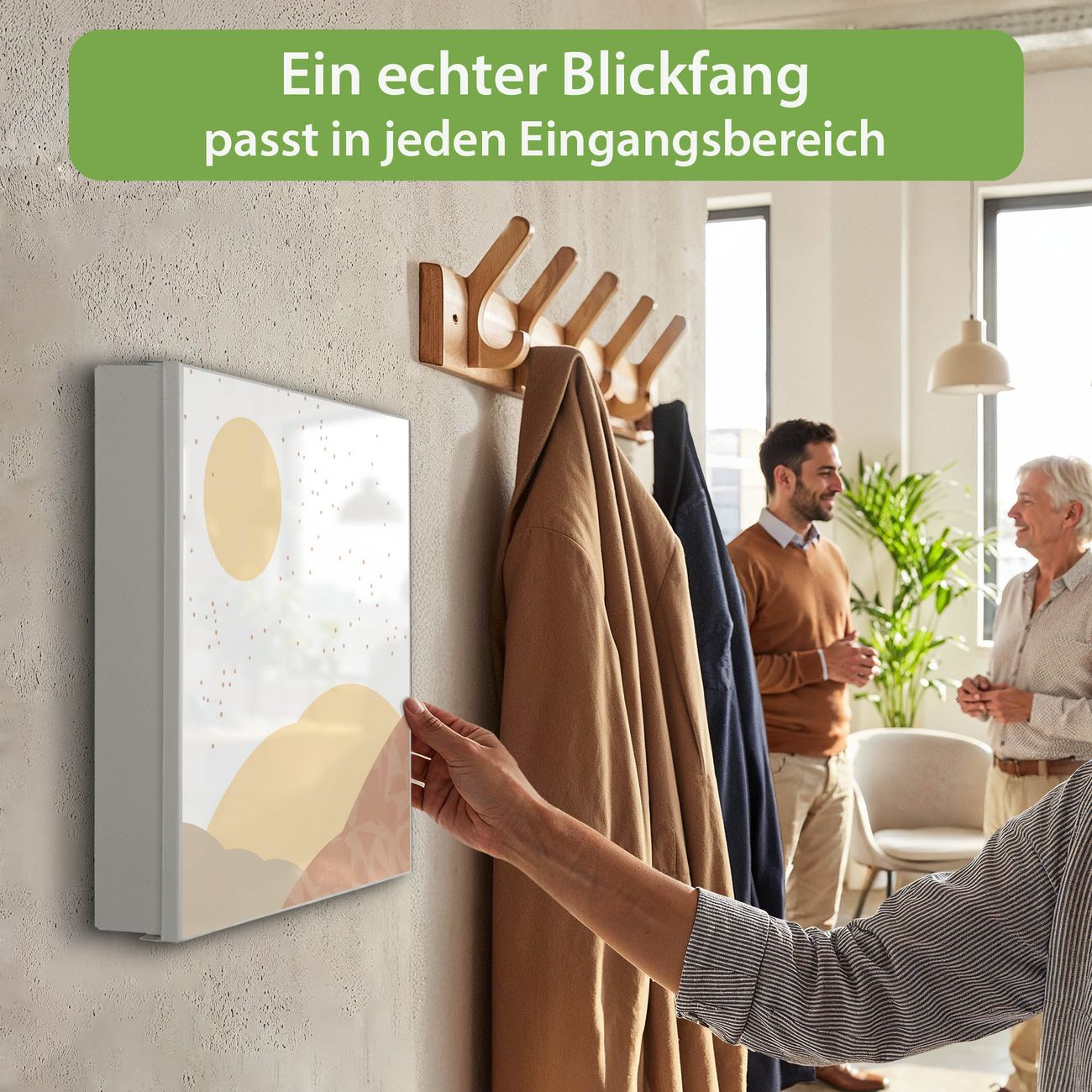 Bringe Ordnung und Eleganz in deinen Eingangsbereich mit dem banjado Schlüsselkasten Motiv Motiv Sommertag Abstrakt. Die moderne Schlüsselbox kombiniert funktionales Design mit hochwertiger Verarbeitung und wird so zu einem echten Hingucker in Flur, Büro oder Ferienwohnung. ✅ Stilvolle Schlüsselaufbewahrung mit Motiv Motiv Sommertag Abstrakt Der Design-Schlüsselkasten Motiv Motiv Sommertag Abstrakt bietet Platz für bis zu 32 Schlüssel, die auf 4 stabilen Reihen mit je 8 Haken übersichtlich verstaut werden. Mit seinen kompakten Maßen von 30 x 30 x 5 cm passt die Schlüsselbox perfekt auch in kleinere Räume. Der weiß lackierte Stahlkorpus mit rechts angeschlagenem Türscharnier harmoniert mit gedruckten Folie auf der Front und fügt sich nahtlos in jedes Wohnambiente ein. Ob als Schlüsselorganizer für Zuhause oder als praktische Lösung für Büros, Praxen und Gewerbe, der banjado Schlüsselkasten sorgt für Ordnung und Übersicht. Dank der magnetischen, mit Kreidestiften beschreibbaren Folie auf der Front kannst du Notizen anheften oder Termine direkt auf der Oberfläche festhalten. Die Schlüsselbox Motiv Motiv Sommertag Abstrakt zur Wandmontage wird inklusive Befestigungsmaterial geliefert und ist schnell angebracht. So hast du deine Schlüssel jederzeit griffbereit und zugleich stilvoll verstaut. Mit diesem banjado Schlüsselkasten Motiv Motiv Sommertag Abstrakt kombinierst du praktische Aufbewahrung mit stilvollem Wohndesign. Ob privat oder geschäftlich, die Schlüsselbox sorgt für mehr Ordnung, Übersicht und ein wohnliches Ambiente.Vorteile im Überblick