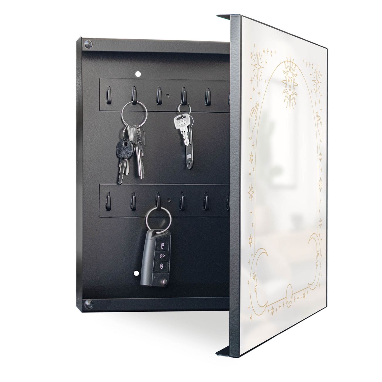 Bringe Ordnung und Eleganz in deinen Eingangsbereich mit dem banjado Schlüsselkasten Motiv Motiv Sonne und Mond Symbole. Die moderne Schlüsselbox kombiniert funktionales Design mit hochwertiger Verarbeitung und wird so zu einem echten Hingucker in Flur, Büro oder Ferienwohnung. ✅ Stilvolle Schlüsselaufbewahrung mit Motiv Motiv Sonne und Mond Symbole Der Design-Schlüsselkasten Motiv Motiv Sonne und Mond Symbole bietet Platz für bis zu 32 Schlüssel, die auf 4 stabilen Reihen mit je 8 Haken übersichtlich verstaut werden. Mit seinen kompakten Maßen von 30 x 30 x 5 cm passt die Schlüsselbox perfekt auch in kleinere Räume. Der schwarz lackierte Stahlkorpus mit rechts angeschlagenem Türscharnier harmoniert mit gedruckten Folie auf der Front und fügt sich nahtlos in jedes Wohnambiente ein. Ob als Schlüsselorganizer für Zuhause oder als praktische Lösung für Büros, Praxen und Gewerbe, der banjado Schlüsselkasten sorgt für Ordnung und Übersicht. Dank der magnetischen, mit Kreidestiften beschreibbaren Folie auf der Front kannst du Notizen anheften oder Termine direkt auf der Oberfläche festhalten. Die Schlüsselbox Motiv Motiv Sonne und Mond Symbole zur Wandmontage wird inklusive Befestigungsmaterial geliefert und ist schnell angebracht. So hast du deine Schlüssel jederzeit griffbereit und zugleich stilvoll verstaut. Mit diesem banjado Schlüsselkasten Motiv Motiv Sonne und Mond Symbole kombinierst du praktische Aufbewahrung mit stilvollem Wohndesign. Ob privat oder geschäftlich, die Schlüsselbox sorgt für mehr Ordnung, Übersicht und ein wohnliches Ambiente.Vorteile im Überblick