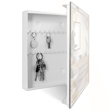Bringe Ordnung und Eleganz in deinen Eingangsbereich mit dem banjado Schlüsselkasten Motiv Motiv Sonnen- und Mondrahmen. Die moderne Schlüsselbox kombiniert funktionales Design mit hochwertiger Verarbeitung und wird so zu einem echten Hingucker in Flur, Büro oder Ferienwohnung. ✅ Stilvolle Schlüsselaufbewahrung mit Glasfront im Motiv Motiv Sonnen- und Mondrahmen Der Design-Schlüsselkasten Motiv Motiv Sonnen- und Mondrahmen bietet Platz für bis zu 50 Schlüssel, die auf 5 stabilen Reihen mit je 10 Haken übersichtlich verstaut werden. Mit seinen kompakten Maßen von 30 x 30 x 5 cm passt die Schlüsselbox perfekt auch in kleinere Räume. Der weiß lackierte Stahlkorpus mit rechts angeschlagenem Türscharnier harmoniert mit der Glasfront und fügt sich nahtlos in jedes Wohnambiente ein. Ob als Schlüsselorganizer für Zuhause oder als praktische Lösung für Büros, Praxen und Gewerbe, der banjado Schlüsselkasten sorgt für Ordnung und Übersicht. Dank der magnetischen, mit Kreidestiften beschreibbaren Glasfront kannst du Notizen anheften oder Termine direkt auf der Oberfläche festhalten. Die Schlüsselbox Motiv Motiv Sonnen- und Mondrahmen zur Wandmontage wird inklusive Befestigungsmaterial geliefert und ist schnell angebracht. So hast du deine Schlüssel jederzeit griffbereit und zugleich stilvoll verstaut. Mit diesem banjado Schlüsselkasten Motiv Motiv Sonnen- und Mondrahmen kombinierst du praktische Aufbewahrung mit stilvollem Wohndesign. Ob privat oder geschäftlich, die Schlüsselbox sorgt für mehr Ordnung, Übersicht und ein wohnliches Ambiente.Vorteile im Überblick