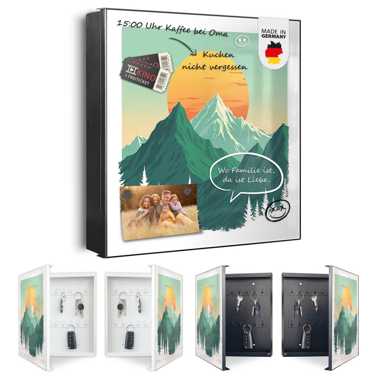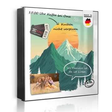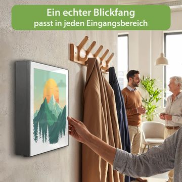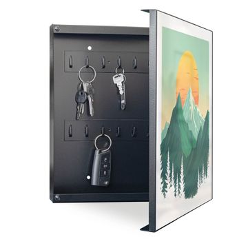 Bringe Ordnung und Eleganz in deinen Eingangsbereich mit dem banjado Schlüsselkasten Motiv Motiv Sonnenaufgang über den Bergen. Die moderne Schlüsselbox kombiniert funktionales Design mit hochwertiger Verarbeitung und wird so zu einem echten Hingucker in Flur, Büro oder Ferienwohnung. ✅ Stilvolle Schlüsselaufbewahrung mit Motiv Motiv Sonnenaufgang über den Bergen Der Design-Schlüsselkasten Motiv Motiv Sonnenaufgang über den Bergen bietet Platz für bis zu 32 Schlüssel, die auf 4 stabilen Reihen mit je 8 Haken übersichtlich verstaut werden. Mit seinen kompakten Maßen von 30 x 30 x 5 cm passt die Schlüsselbox perfekt auch in kleinere Räume. Der schwarz lackierte Stahlkorpus mit rechts angeschlagenem Türscharnier harmoniert mit gedruckten Folie auf der Front und fügt sich nahtlos in jedes Wohnambiente ein. Ob als Schlüsselorganizer für Zuhause oder als praktische Lösung für Büros, Praxen und Gewerbe, der banjado Schlüsselkasten sorgt für Ordnung und Übersicht. Dank der magnetischen, mit Kreidestiften beschreibbaren Folie auf der Front kannst du Notizen anheften oder Termine direkt auf der Oberfläche festhalten. Die Schlüsselbox Motiv Motiv Sonnenaufgang über den Bergen zur Wandmontage wird inklusive Befestigungsmaterial geliefert und ist schnell angebracht. So hast du deine Schlüssel jederzeit griffbereit und zugleich stilvoll verstaut. Mit diesem banjado Schlüsselkasten Motiv Motiv Sonnenaufgang über den Bergen kombinierst du praktische Aufbewahrung mit stilvollem Wohndesign. Ob privat oder geschäftlich, die Schlüsselbox sorgt für mehr Ordnung, Übersicht und ein wohnliches Ambiente.Vorteile im Überblick