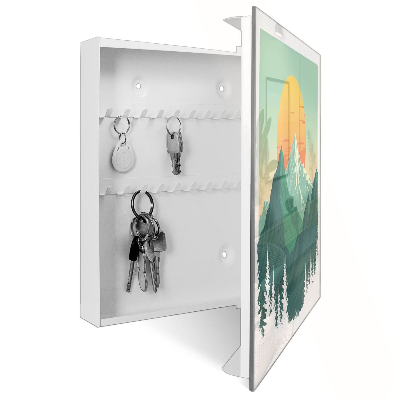 Bringe Ordnung und Eleganz in deinen Eingangsbereich mit dem banjado Schlüsselkasten Motiv Motiv Sonnenaufgang über den Bergen. Die moderne Schlüsselbox kombiniert funktionales Design mit hochwertiger Verarbeitung und wird so zu einem echten Hingucker in Flur, Büro oder Ferienwohnung. ✅ Stilvolle Schlüsselaufbewahrung mit Glasfront im Motiv Motiv Sonnenaufgang über den Bergen Der Design-Schlüsselkasten Motiv Motiv Sonnenaufgang über den Bergen bietet Platz für bis zu 50 Schlüssel, die auf 5 stabilen Reihen mit je 10 Haken übersichtlich verstaut werden. Mit seinen kompakten Maßen von 30 x 30 x 5 cm passt die Schlüsselbox perfekt auch in kleinere Räume. Der weiß lackierte Stahlkorpus mit rechts angeschlagenem Türscharnier harmoniert mit der Glasfront und fügt sich nahtlos in jedes Wohnambiente ein. Ob als Schlüsselorganizer für Zuhause oder als praktische Lösung für Büros, Praxen und Gewerbe, der banjado Schlüsselkasten sorgt für Ordnung und Übersicht. Dank der magnetischen, mit Kreidestiften beschreibbaren Glasfront kannst du Notizen anheften oder Termine direkt auf der Oberfläche festhalten. Die Schlüsselbox Motiv Motiv Sonnenaufgang über den Bergen zur Wandmontage wird inklusive Befestigungsmaterial geliefert und ist schnell angebracht. So hast du deine Schlüssel jederzeit griffbereit und zugleich stilvoll verstaut. Mit diesem banjado Schlüsselkasten Motiv Motiv Sonnenaufgang über den Bergen kombinierst du praktische Aufbewahrung mit stilvollem Wohndesign. Ob privat oder geschäftlich, die Schlüsselbox sorgt für mehr Ordnung, Übersicht und ein wohnliches Ambiente.Vorteile im Überblick