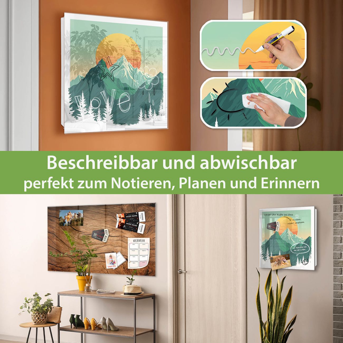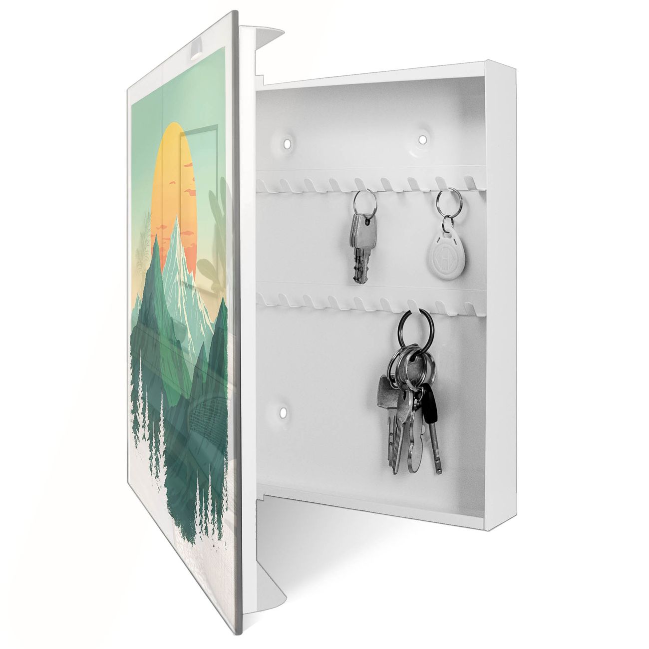 Bringe Ordnung und Eleganz in deinen Eingangsbereich mit dem banjado Schlüsselkasten Motiv Motiv Sonnenaufgang über den Bergen. Die moderne Schlüsselbox kombiniert funktionales Design mit hochwertiger Verarbeitung und wird so zu einem echten Hingucker in Flur, Büro oder Ferienwohnung. ✅ Stilvolle Schlüsselaufbewahrung mit Glasfront im Motiv Motiv Sonnenaufgang über den Bergen Der Design-Schlüsselkasten Motiv Motiv Sonnenaufgang über den Bergen bietet Platz für bis zu 50 Schlüssel, die auf 5 stabilen Reihen mit je 10 Haken übersichtlich verstaut werden. Mit seinen kompakten Maßen von 30 x 30 x 5 cm passt die Schlüsselbox perfekt auch in kleinere Räume. Der weiß lackierte Stahlkorpus mit rechts angeschlagenem Türscharnier harmoniert mit der Glasfront und fügt sich nahtlos in jedes Wohnambiente ein. Ob als Schlüsselorganizer für Zuhause oder als praktische Lösung für Büros, Praxen und Gewerbe, der banjado Schlüsselkasten sorgt für Ordnung und Übersicht. Dank der magnetischen, mit Kreidestiften beschreibbaren Glasfront kannst du Notizen anheften oder Termine direkt auf der Oberfläche festhalten. Die Schlüsselbox Motiv Motiv Sonnenaufgang über den Bergen zur Wandmontage wird inklusive Befestigungsmaterial geliefert und ist schnell angebracht. So hast du deine Schlüssel jederzeit griffbereit und zugleich stilvoll verstaut. Mit diesem banjado Schlüsselkasten Motiv Motiv Sonnenaufgang über den Bergen kombinierst du praktische Aufbewahrung mit stilvollem Wohndesign. Ob privat oder geschäftlich, die Schlüsselbox sorgt für mehr Ordnung, Übersicht und ein wohnliches Ambiente.Vorteile im Überblick