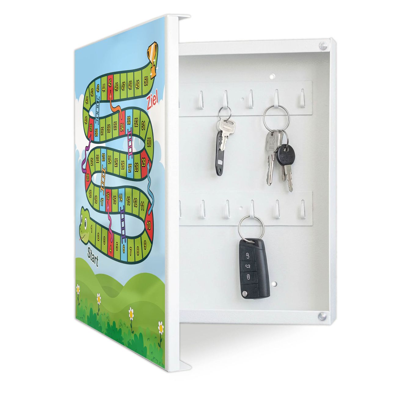 Bringe Ordnung und Eleganz in deinen Eingangsbereich mit dem banjado Schlüsselkasten Motiv Motiv Spielbrett 3. Die moderne Schlüsselbox kombiniert funktionales Design mit hochwertiger Verarbeitung und wird so zu einem echten Hingucker in Flur, Büro oder Ferienwohnung. ✅ Stilvolle Schlüsselaufbewahrung mit Motiv Motiv Spielbrett 3 Der Design-Schlüsselkasten Motiv Motiv Spielbrett 3 bietet Platz für bis zu 32 Schlüssel, die auf 4 stabilen Reihen mit je 8 Haken übersichtlich verstaut werden. Mit seinen kompakten Maßen von 30 x 30 x 5 cm passt die Schlüsselbox perfekt auch in kleinere Räume. Der weiß lackierte Stahlkorpus mit links angeschlagenem Türscharnier harmoniert mit gedruckten Folie auf der Front und fügt sich nahtlos in jedes Wohnambiente ein. Ob als Schlüsselorganizer für Zuhause oder als praktische Lösung für Büros, Praxen und Gewerbe, der banjado Schlüsselkasten sorgt für Ordnung und Übersicht. Dank der magnetischen, mit Kreidestiften beschreibbaren Folie auf der Front kannst du Notizen anheften oder Termine direkt auf der Oberfläche festhalten. Die Schlüsselbox Motiv Motiv Spielbrett 3 zur Wandmontage wird inklusive Befestigungsmaterial geliefert und ist schnell angebracht. So hast du deine Schlüssel jederzeit griffbereit und zugleich stilvoll verstaut. Mit diesem banjado Schlüsselkasten Motiv Motiv Spielbrett 3 kombinierst du praktische Aufbewahrung mit stilvollem Wohndesign. Ob privat oder geschäftlich, die Schlüsselbox sorgt für mehr Ordnung, Übersicht und ein wohnliches Ambiente.Vorteile im Überblick