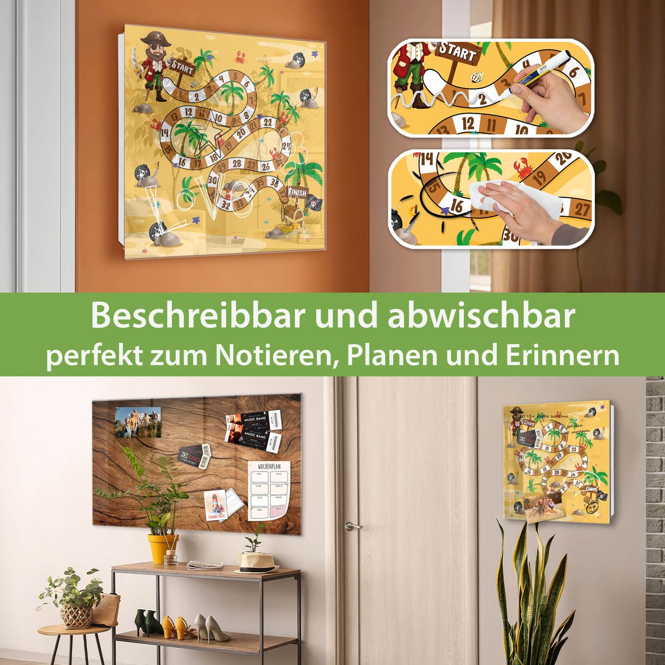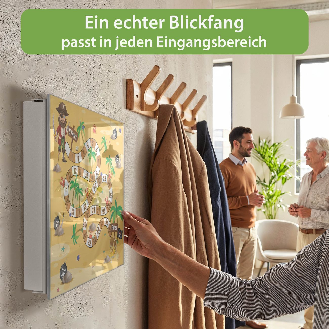 Bringe Ordnung und Eleganz in deinen Eingangsbereich mit dem banjado Schlüsselkasten Motiv Motiv Spielbrett 4. Die moderne Schlüsselbox kombiniert funktionales Design mit hochwertiger Verarbeitung und wird so zu einem echten Hingucker in Flur, Büro oder Ferienwohnung. ✅ Stilvolle Schlüsselaufbewahrung mit Glasfront im Motiv Motiv Spielbrett 4 Der Design-Schlüsselkasten Motiv Motiv Spielbrett 4 bietet Platz für bis zu 50 Schlüssel, die auf 5 stabilen Reihen mit je 10 Haken übersichtlich verstaut werden. Mit seinen kompakten Maßen von 30 x 30 x 5 cm passt die Schlüsselbox perfekt auch in kleinere Räume. Der weiß lackierte Stahlkorpus mit rechts angeschlagenem Türscharnier harmoniert mit der Glasfront und fügt sich nahtlos in jedes Wohnambiente ein. Ob als Schlüsselorganizer für Zuhause oder als praktische Lösung für Büros, Praxen und Gewerbe, der banjado Schlüsselkasten sorgt für Ordnung und Übersicht. Dank der magnetischen, mit Kreidestiften beschreibbaren Glasfront kannst du Notizen anheften oder Termine direkt auf der Oberfläche festhalten. Die Schlüsselbox Motiv Motiv Spielbrett 4 zur Wandmontage wird inklusive Befestigungsmaterial geliefert und ist schnell angebracht. So hast du deine Schlüssel jederzeit griffbereit und zugleich stilvoll verstaut. Mit diesem banjado Schlüsselkasten Motiv Motiv Spielbrett 4 kombinierst du praktische Aufbewahrung mit stilvollem Wohndesign. Ob privat oder geschäftlich, die Schlüsselbox sorgt für mehr Ordnung, Übersicht und ein wohnliches Ambiente.Vorteile im Überblick