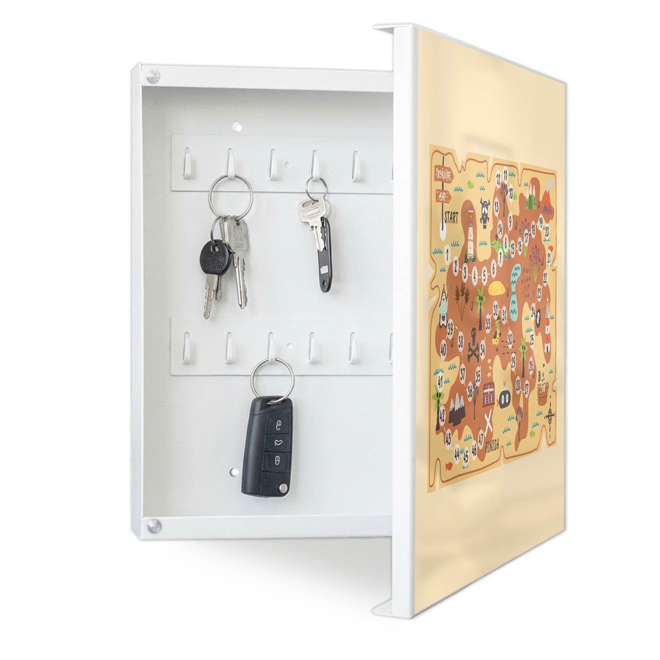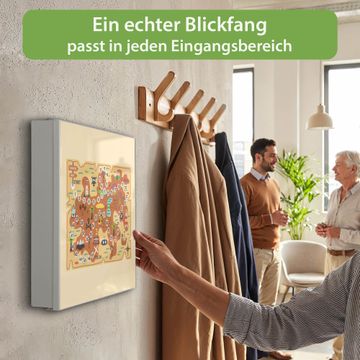 Bringe Ordnung und Eleganz in deinen Eingangsbereich mit dem banjado Schlüsselkasten Motiv Motiv Spielbrett 6. Die moderne Schlüsselbox kombiniert funktionales Design mit hochwertiger Verarbeitung und wird so zu einem echten Hingucker in Flur, Büro oder Ferienwohnung. ✅ Stilvolle Schlüsselaufbewahrung mit Motiv Motiv Spielbrett 6 Der Design-Schlüsselkasten Motiv Motiv Spielbrett 6 bietet Platz für bis zu 32 Schlüssel, die auf 4 stabilen Reihen mit je 8 Haken übersichtlich verstaut werden. Mit seinen kompakten Maßen von 30 x 30 x 5 cm passt die Schlüsselbox perfekt auch in kleinere Räume. Der weiß lackierte Stahlkorpus mit rechts angeschlagenem Türscharnier harmoniert mit gedruckten Folie auf der Front und fügt sich nahtlos in jedes Wohnambiente ein. Ob als Schlüsselorganizer für Zuhause oder als praktische Lösung für Büros, Praxen und Gewerbe, der banjado Schlüsselkasten sorgt für Ordnung und Übersicht. Dank der magnetischen, mit Kreidestiften beschreibbaren Folie auf der Front kannst du Notizen anheften oder Termine direkt auf der Oberfläche festhalten. Die Schlüsselbox Motiv Motiv Spielbrett 6 zur Wandmontage wird inklusive Befestigungsmaterial geliefert und ist schnell angebracht. So hast du deine Schlüssel jederzeit griffbereit und zugleich stilvoll verstaut. Mit diesem banjado Schlüsselkasten Motiv Motiv Spielbrett 6 kombinierst du praktische Aufbewahrung mit stilvollem Wohndesign. Ob privat oder geschäftlich, die Schlüsselbox sorgt für mehr Ordnung, Übersicht und ein wohnliches Ambiente.Vorteile im Überblick