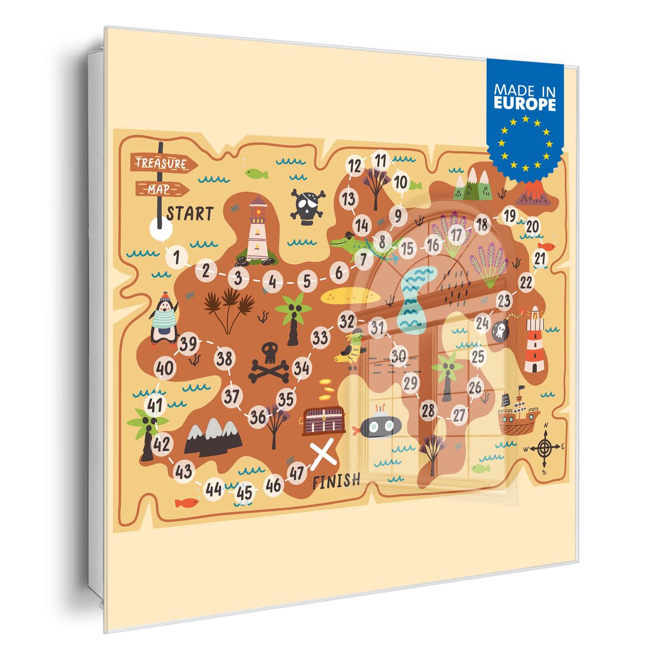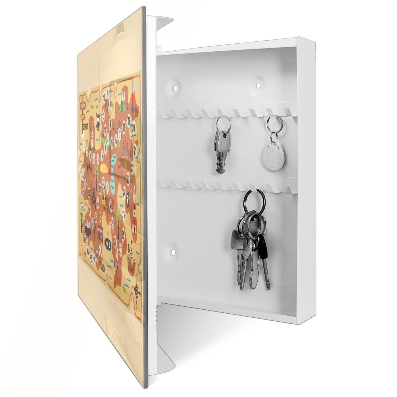 Bringe Ordnung und Eleganz in deinen Eingangsbereich mit dem banjado Schlüsselkasten Motiv Motiv Spielbrett 6. Die moderne Schlüsselbox kombiniert funktionales Design mit hochwertiger Verarbeitung und wird so zu einem echten Hingucker in Flur, Büro oder Ferienwohnung. ✅ Stilvolle Schlüsselaufbewahrung mit Glasfront im Motiv Motiv Spielbrett 6 Der Design-Schlüsselkasten Motiv Motiv Spielbrett 6 bietet Platz für bis zu 50 Schlüssel, die auf 5 stabilen Reihen mit je 10 Haken übersichtlich verstaut werden. Mit seinen kompakten Maßen von 30 x 30 x 5 cm passt die Schlüsselbox perfekt auch in kleinere Räume. Der weiß lackierte Stahlkorpus mit rechts angeschlagenem Türscharnier harmoniert mit der Glasfront und fügt sich nahtlos in jedes Wohnambiente ein. Ob als Schlüsselorganizer für Zuhause oder als praktische Lösung für Büros, Praxen und Gewerbe, der banjado Schlüsselkasten sorgt für Ordnung und Übersicht. Dank der magnetischen, mit Kreidestiften beschreibbaren Glasfront kannst du Notizen anheften oder Termine direkt auf der Oberfläche festhalten. Die Schlüsselbox Motiv Motiv Spielbrett 6 zur Wandmontage wird inklusive Befestigungsmaterial geliefert und ist schnell angebracht. So hast du deine Schlüssel jederzeit griffbereit und zugleich stilvoll verstaut. Mit diesem banjado Schlüsselkasten Motiv Motiv Spielbrett 6 kombinierst du praktische Aufbewahrung mit stilvollem Wohndesign. Ob privat oder geschäftlich, die Schlüsselbox sorgt für mehr Ordnung, Übersicht und ein wohnliches Ambiente.Vorteile im Überblick