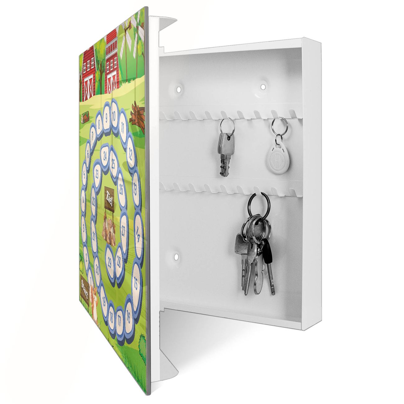 Bringe Ordnung und Eleganz in deinen Eingangsbereich mit dem banjado Schlüsselkasten Motiv Motiv Spielbrett 7. Die moderne Schlüsselbox kombiniert funktionales Design mit hochwertiger Verarbeitung und wird so zu einem echten Hingucker in Flur, Büro oder Ferienwohnung. ✅ Stilvolle Schlüsselaufbewahrung mit Glasfront im Motiv Motiv Spielbrett 7 Der Design-Schlüsselkasten Motiv Motiv Spielbrett 7 bietet Platz für bis zu 50 Schlüssel, die auf 5 stabilen Reihen mit je 10 Haken übersichtlich verstaut werden. Mit seinen kompakten Maßen von 30 x 30 x 5 cm passt die Schlüsselbox perfekt auch in kleinere Räume. Der weiß lackierte Stahlkorpus mit rechts angeschlagenem Türscharnier harmoniert mit der Glasfront und fügt sich nahtlos in jedes Wohnambiente ein. Ob als Schlüsselorganizer für Zuhause oder als praktische Lösung für Büros, Praxen und Gewerbe, der banjado Schlüsselkasten sorgt für Ordnung und Übersicht. Dank der magnetischen, mit Kreidestiften beschreibbaren Glasfront kannst du Notizen anheften oder Termine direkt auf der Oberfläche festhalten. Die Schlüsselbox Motiv Motiv Spielbrett 7 zur Wandmontage wird inklusive Befestigungsmaterial geliefert und ist schnell angebracht. So hast du deine Schlüssel jederzeit griffbereit und zugleich stilvoll verstaut. Mit diesem banjado Schlüsselkasten Motiv Motiv Spielbrett 7 kombinierst du praktische Aufbewahrung mit stilvollem Wohndesign. Ob privat oder geschäftlich, die Schlüsselbox sorgt für mehr Ordnung, Übersicht und ein wohnliches Ambiente.Vorteile im Überblick