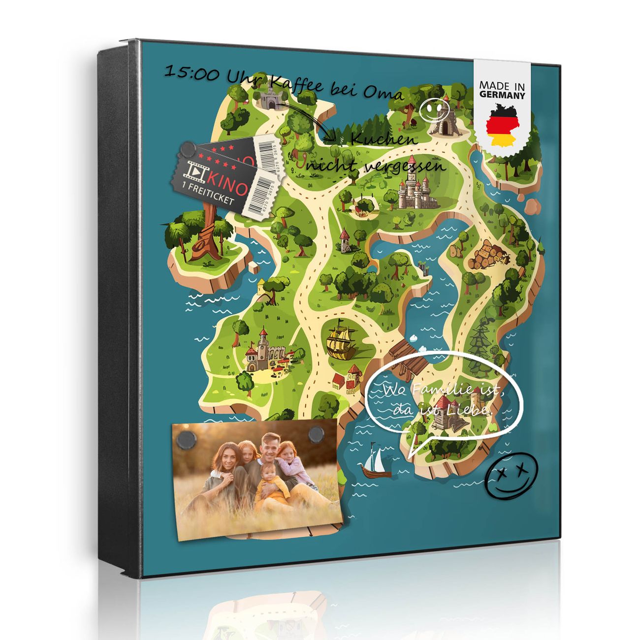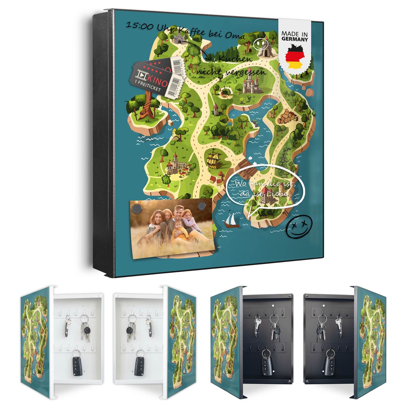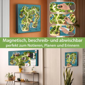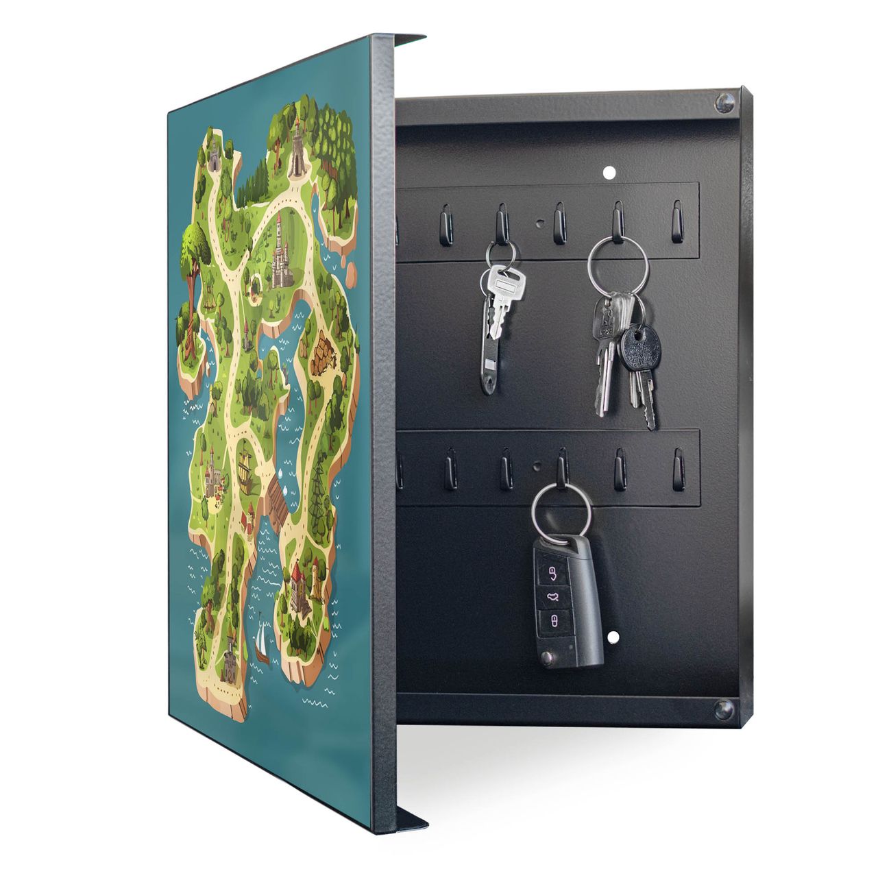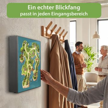 Bringe Ordnung und Eleganz in deinen Eingangsbereich mit dem banjado Schlüsselkasten Motiv Motiv Spielinsel. Die moderne Schlüsselbox kombiniert funktionales Design mit hochwertiger Verarbeitung und wird so zu einem echten Hingucker in Flur, Büro oder Ferienwohnung. ✅ Stilvolle Schlüsselaufbewahrung mit Motiv Motiv Spielinsel Der Design-Schlüsselkasten Motiv Motiv Spielinsel bietet Platz für bis zu 32 Schlüssel, die auf 4 stabilen Reihen mit je 8 Haken übersichtlich verstaut werden. Mit seinen kompakten Maßen von 30 x 30 x 5 cm passt die Schlüsselbox perfekt auch in kleinere Räume. Der schwarz lackierte Stahlkorpus mit links angeschlagenem Türscharnier harmoniert mit gedruckten Folie auf der Front und fügt sich nahtlos in jedes Wohnambiente ein. Ob als Schlüsselorganizer für Zuhause oder als praktische Lösung für Büros, Praxen und Gewerbe, der banjado Schlüsselkasten sorgt für Ordnung und Übersicht. Dank der magnetischen, mit Kreidestiften beschreibbaren Folie auf der Front kannst du Notizen anheften oder Termine direkt auf der Oberfläche festhalten. Die Schlüsselbox Motiv Motiv Spielinsel zur Wandmontage wird inklusive Befestigungsmaterial geliefert und ist schnell angebracht. So hast du deine Schlüssel jederzeit griffbereit und zugleich stilvoll verstaut. Mit diesem banjado Schlüsselkasten Motiv Motiv Spielinsel kombinierst du praktische Aufbewahrung mit stilvollem Wohndesign. Ob privat oder geschäftlich, die Schlüsselbox sorgt für mehr Ordnung, Übersicht und ein wohnliches Ambiente.Vorteile im Überblick