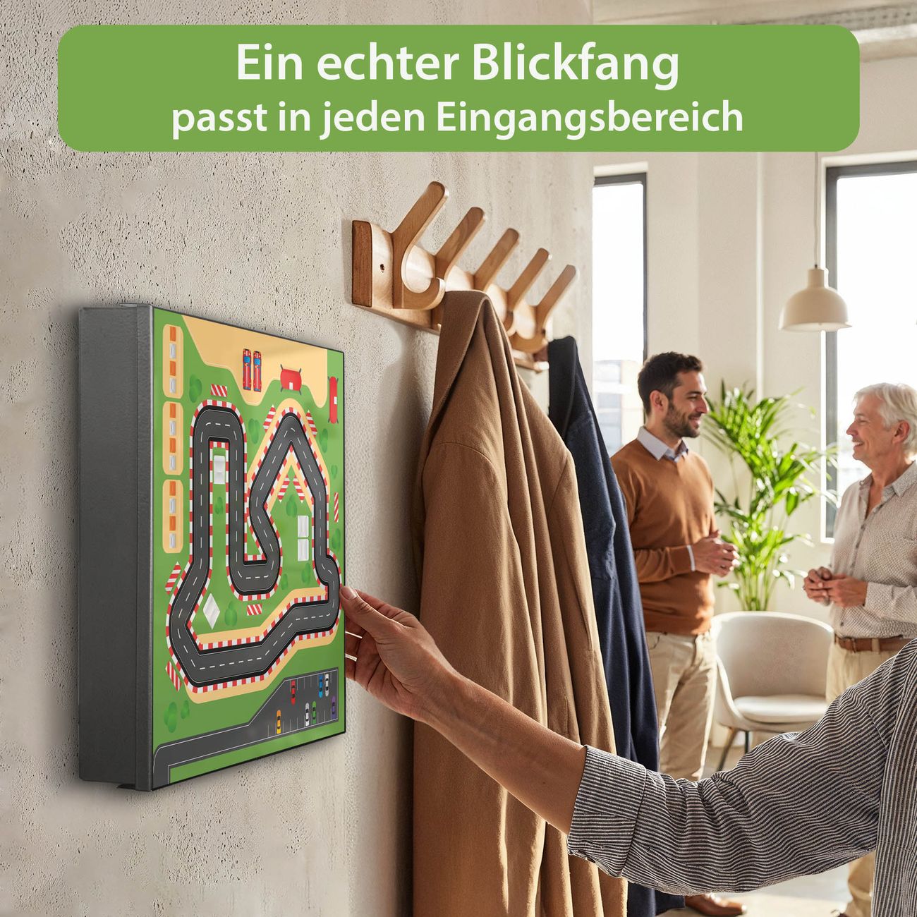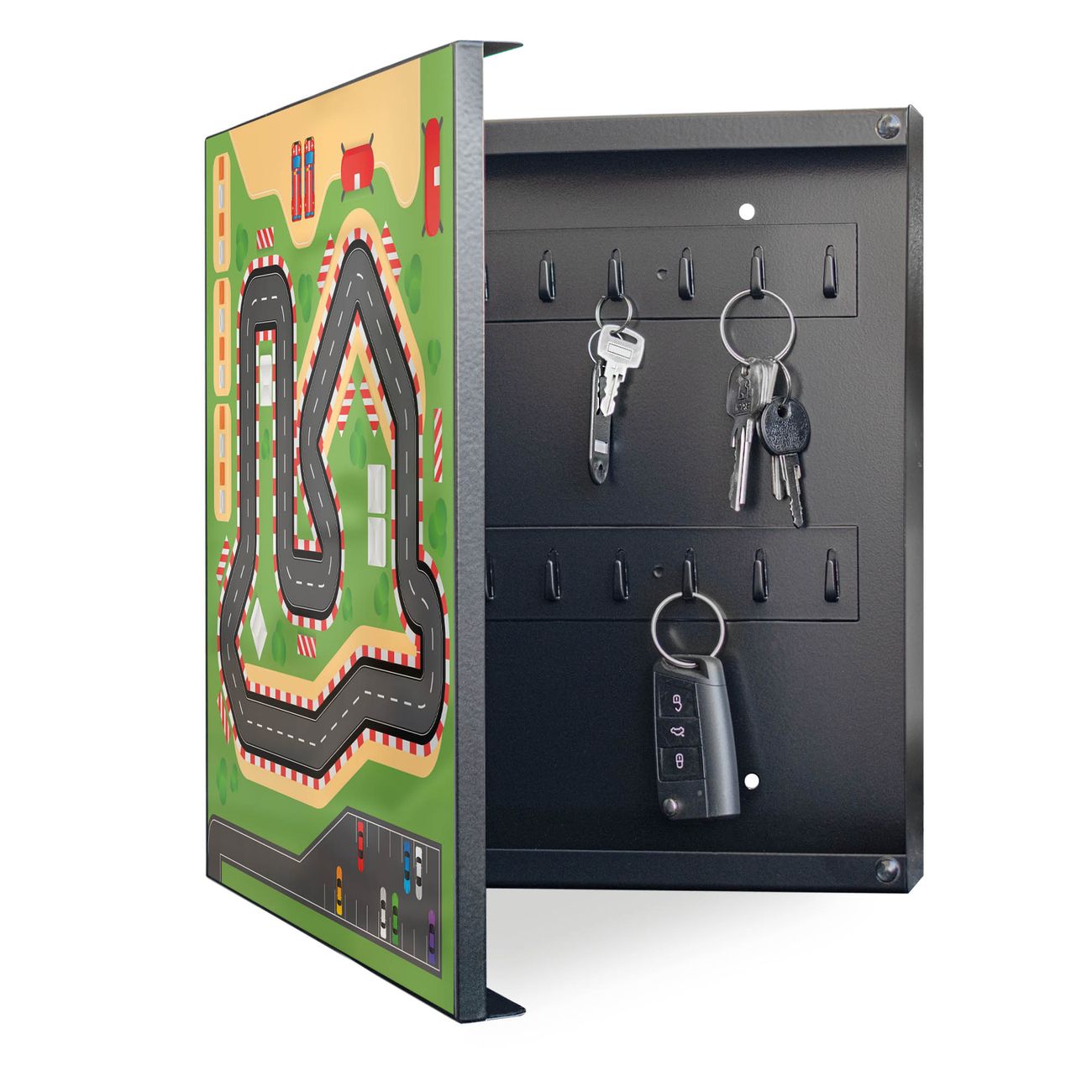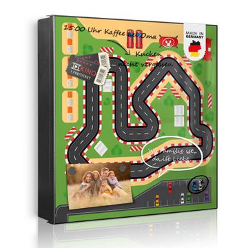 Bringe Ordnung und Eleganz in deinen Eingangsbereich mit dem banjado Schlüsselkasten Motiv Motiv Spielstraße 1. Die moderne Schlüsselbox kombiniert funktionales Design mit hochwertiger Verarbeitung und wird so zu einem echten Hingucker in Flur, Büro oder Ferienwohnung. ✅ Stilvolle Schlüsselaufbewahrung mit Motiv Motiv Spielstraße 1 Der Design-Schlüsselkasten Motiv Motiv Spielstraße 1 bietet Platz für bis zu 32 Schlüssel, die auf 4 stabilen Reihen mit je 8 Haken übersichtlich verstaut werden. Mit seinen kompakten Maßen von 30 x 30 x 5 cm passt die Schlüsselbox perfekt auch in kleinere Räume. Der schwarz lackierte Stahlkorpus mit links angeschlagenem Türscharnier harmoniert mit gedruckten Folie auf der Front und fügt sich nahtlos in jedes Wohnambiente ein. Ob als Schlüsselorganizer für Zuhause oder als praktische Lösung für Büros, Praxen und Gewerbe, der banjado Schlüsselkasten sorgt für Ordnung und Übersicht. Dank der magnetischen, mit Kreidestiften beschreibbaren Folie auf der Front kannst du Notizen anheften oder Termine direkt auf der Oberfläche festhalten. Die Schlüsselbox Motiv Motiv Spielstraße 1 zur Wandmontage wird inklusive Befestigungsmaterial geliefert und ist schnell angebracht. So hast du deine Schlüssel jederzeit griffbereit und zugleich stilvoll verstaut. Mit diesem banjado Schlüsselkasten Motiv Motiv Spielstraße 1 kombinierst du praktische Aufbewahrung mit stilvollem Wohndesign. Ob privat oder geschäftlich, die Schlüsselbox sorgt für mehr Ordnung, Übersicht und ein wohnliches Ambiente.Vorteile im Überblick