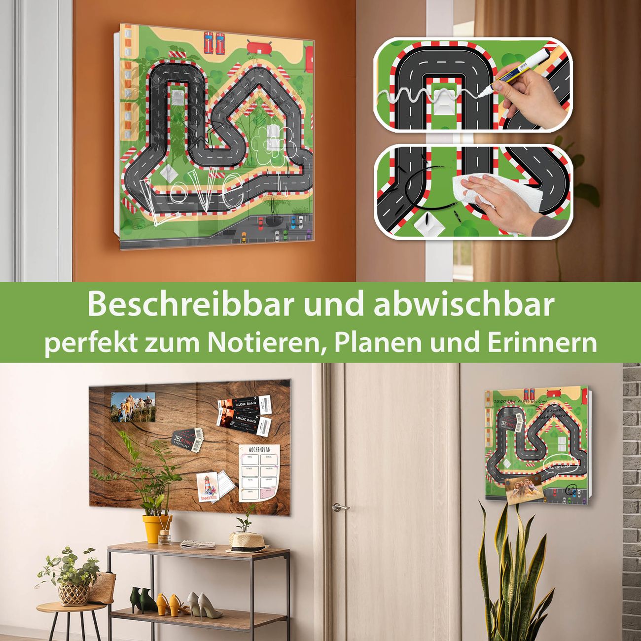 Bringe Ordnung und Eleganz in deinen Eingangsbereich mit dem banjado Schlüsselkasten Motiv Motiv Spielstraße 1. Die moderne Schlüsselbox kombiniert funktionales Design mit hochwertiger Verarbeitung und wird so zu einem echten Hingucker in Flur, Büro oder Ferienwohnung. ✅ Stilvolle Schlüsselaufbewahrung mit Glasfront im Motiv Motiv Spielstraße 1 Der Design-Schlüsselkasten Motiv Motiv Spielstraße 1 bietet Platz für bis zu 50 Schlüssel, die auf 5 stabilen Reihen mit je 10 Haken übersichtlich verstaut werden. Mit seinen kompakten Maßen von 30 x 30 x 5 cm passt die Schlüsselbox perfekt auch in kleinere Räume. Der weiß lackierte Stahlkorpus mit rechts angeschlagenem Türscharnier harmoniert mit der Glasfront und fügt sich nahtlos in jedes Wohnambiente ein. Ob als Schlüsselorganizer für Zuhause oder als praktische Lösung für Büros, Praxen und Gewerbe, der banjado Schlüsselkasten sorgt für Ordnung und Übersicht. Dank der magnetischen, mit Kreidestiften beschreibbaren Glasfront kannst du Notizen anheften oder Termine direkt auf der Oberfläche festhalten. Die Schlüsselbox Motiv Motiv Spielstraße 1 zur Wandmontage wird inklusive Befestigungsmaterial geliefert und ist schnell angebracht. So hast du deine Schlüssel jederzeit griffbereit und zugleich stilvoll verstaut. Mit diesem banjado Schlüsselkasten Motiv Motiv Spielstraße 1 kombinierst du praktische Aufbewahrung mit stilvollem Wohndesign. Ob privat oder geschäftlich, die Schlüsselbox sorgt für mehr Ordnung, Übersicht und ein wohnliches Ambiente.Vorteile im Überblick