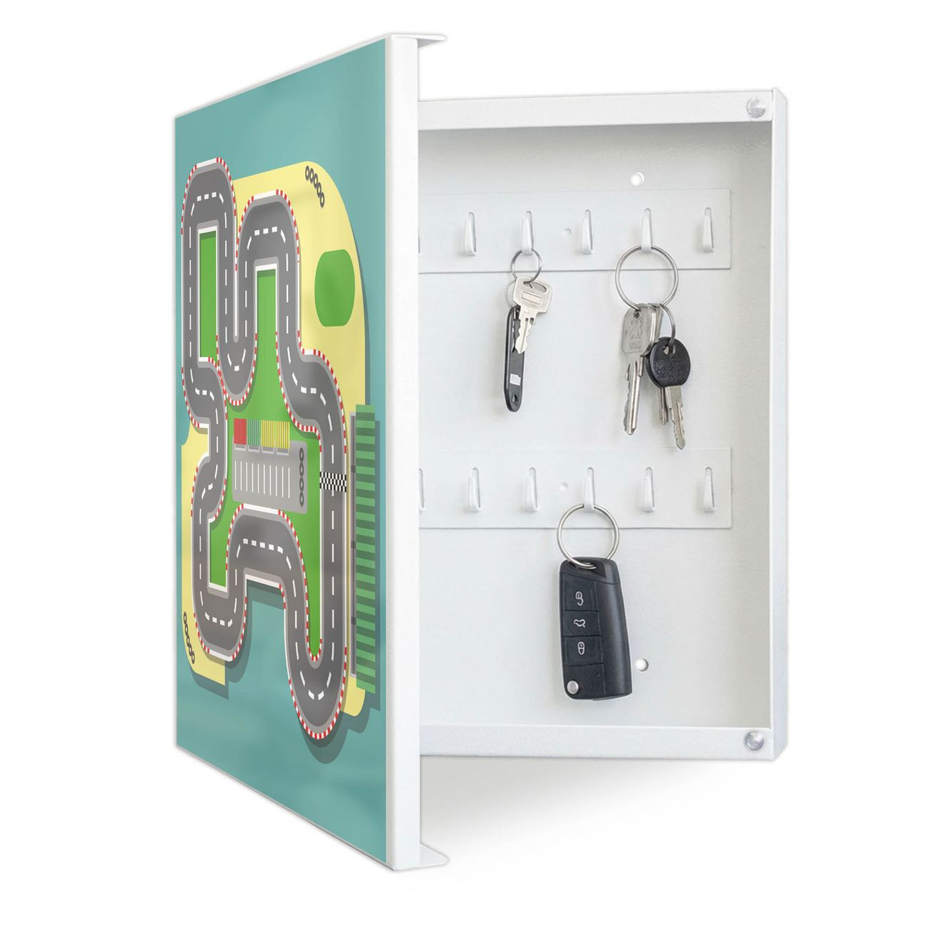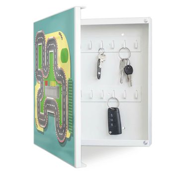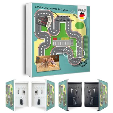 Bringe Ordnung und Eleganz in deinen Eingangsbereich mit dem banjado Schlüsselkasten Motiv Motiv Spielstraße 2. Die moderne Schlüsselbox kombiniert funktionales Design mit hochwertiger Verarbeitung und wird so zu einem echten Hingucker in Flur, Büro oder Ferienwohnung. ✅ Stilvolle Schlüsselaufbewahrung mit Motiv Motiv Spielstraße 2 Der Design-Schlüsselkasten Motiv Motiv Spielstraße 2 bietet Platz für bis zu 32 Schlüssel, die auf 4 stabilen Reihen mit je 8 Haken übersichtlich verstaut werden. Mit seinen kompakten Maßen von 30 x 30 x 5 cm passt die Schlüsselbox perfekt auch in kleinere Räume. Der weiß lackierte Stahlkorpus mit links angeschlagenem Türscharnier harmoniert mit gedruckten Folie auf der Front und fügt sich nahtlos in jedes Wohnambiente ein. Ob als Schlüsselorganizer für Zuhause oder als praktische Lösung für Büros, Praxen und Gewerbe, der banjado Schlüsselkasten sorgt für Ordnung und Übersicht. Dank der magnetischen, mit Kreidestiften beschreibbaren Folie auf der Front kannst du Notizen anheften oder Termine direkt auf der Oberfläche festhalten. Die Schlüsselbox Motiv Motiv Spielstraße 2 zur Wandmontage wird inklusive Befestigungsmaterial geliefert und ist schnell angebracht. So hast du deine Schlüssel jederzeit griffbereit und zugleich stilvoll verstaut. Mit diesem banjado Schlüsselkasten Motiv Motiv Spielstraße 2 kombinierst du praktische Aufbewahrung mit stilvollem Wohndesign. Ob privat oder geschäftlich, die Schlüsselbox sorgt für mehr Ordnung, Übersicht und ein wohnliches Ambiente.Vorteile im Überblick