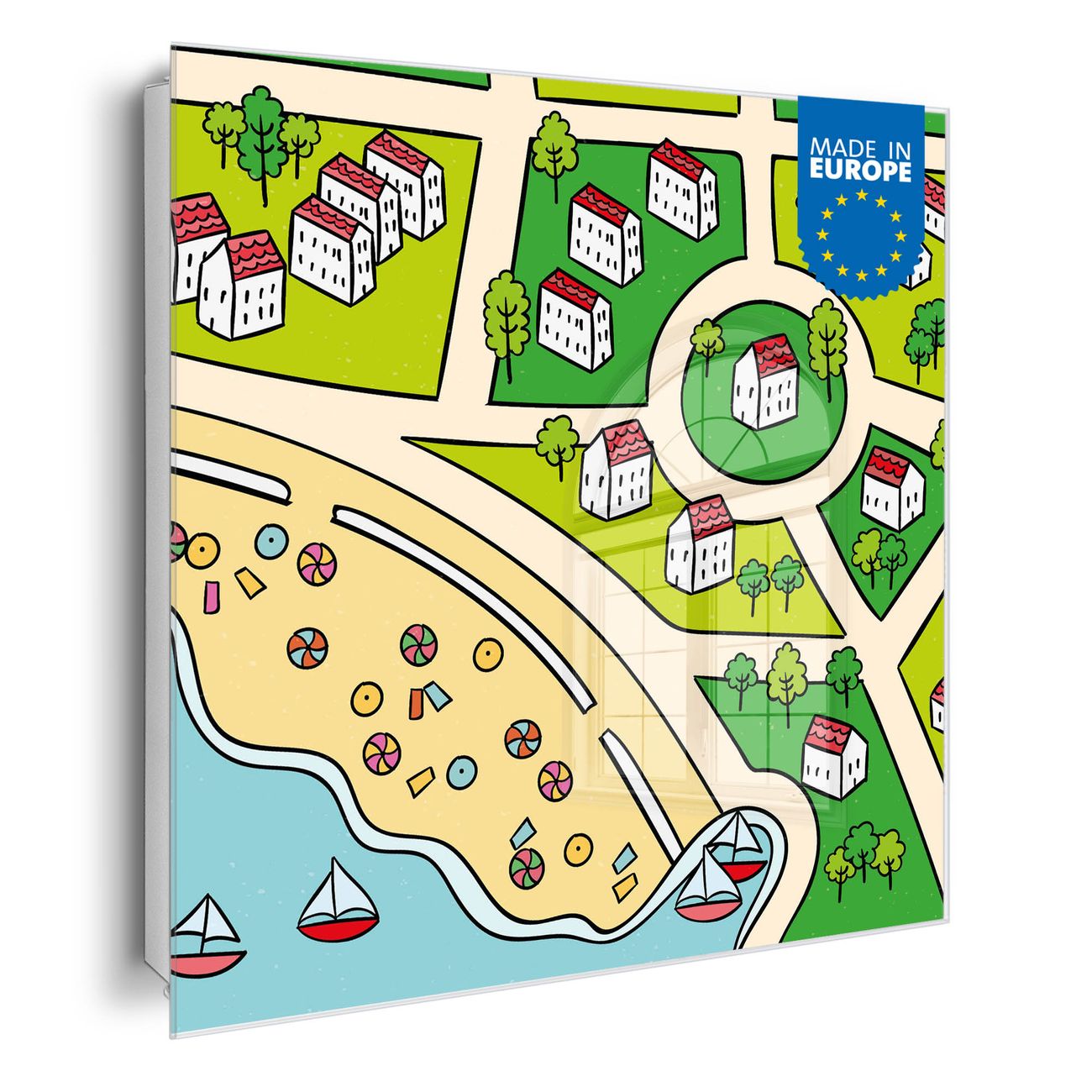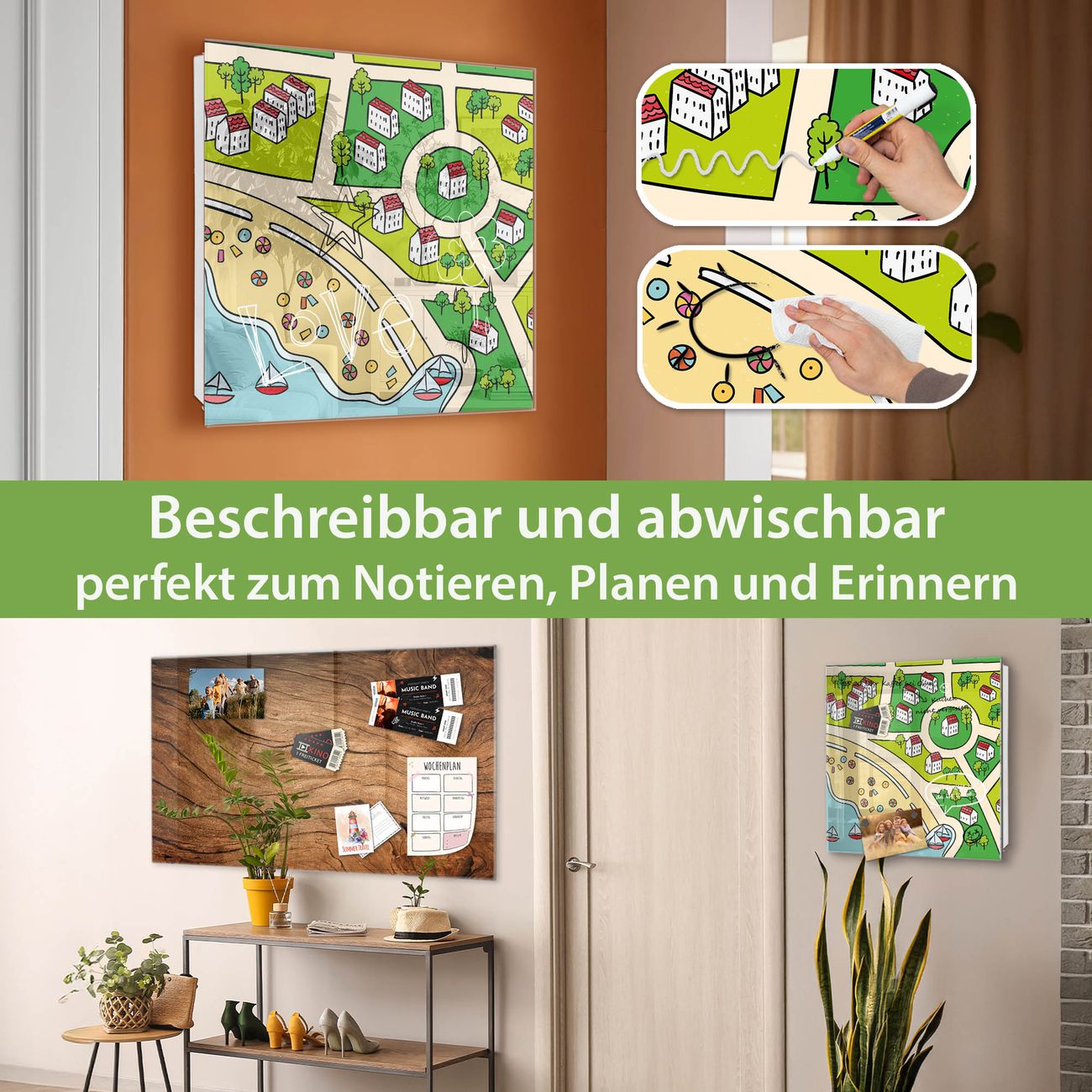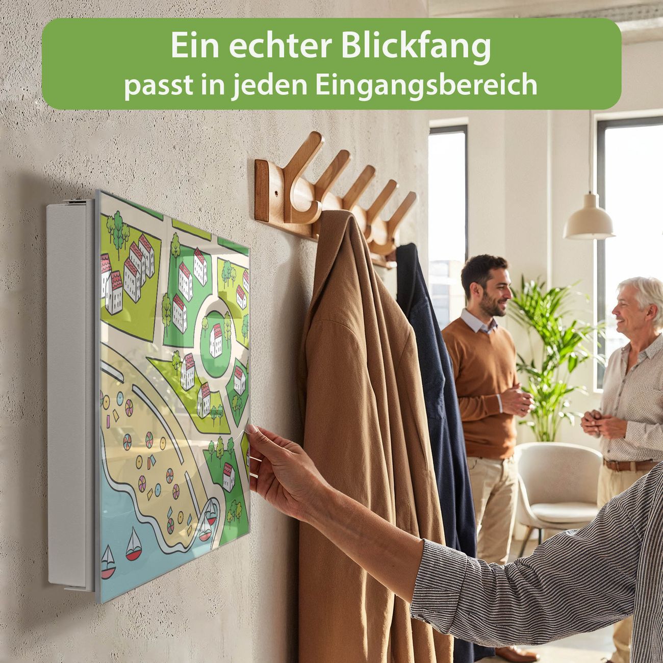 Bringe Ordnung und Eleganz in deinen Eingangsbereich mit dem banjado Schlüsselkasten Motiv Motiv Spielstraße 5. Die moderne Schlüsselbox kombiniert funktionales Design mit hochwertiger Verarbeitung und wird so zu einem echten Hingucker in Flur, Büro oder Ferienwohnung. ✅ Stilvolle Schlüsselaufbewahrung mit Glasfront im Motiv Motiv Spielstraße 5 Der Design-Schlüsselkasten Motiv Motiv Spielstraße 5 bietet Platz für bis zu 50 Schlüssel, die auf 5 stabilen Reihen mit je 10 Haken übersichtlich verstaut werden. Mit seinen kompakten Maßen von 30 x 30 x 5 cm passt die Schlüsselbox perfekt auch in kleinere Räume. Der weiß lackierte Stahlkorpus mit rechts angeschlagenem Türscharnier harmoniert mit der Glasfront und fügt sich nahtlos in jedes Wohnambiente ein. Ob als Schlüsselorganizer für Zuhause oder als praktische Lösung für Büros, Praxen und Gewerbe, der banjado Schlüsselkasten sorgt für Ordnung und Übersicht. Dank der magnetischen, mit Kreidestiften beschreibbaren Glasfront kannst du Notizen anheften oder Termine direkt auf der Oberfläche festhalten. Die Schlüsselbox Motiv Motiv Spielstraße 5 zur Wandmontage wird inklusive Befestigungsmaterial geliefert und ist schnell angebracht. So hast du deine Schlüssel jederzeit griffbereit und zugleich stilvoll verstaut. Mit diesem banjado Schlüsselkasten Motiv Motiv Spielstraße 5 kombinierst du praktische Aufbewahrung mit stilvollem Wohndesign. Ob privat oder geschäftlich, die Schlüsselbox sorgt für mehr Ordnung, Übersicht und ein wohnliches Ambiente.Vorteile im Überblick