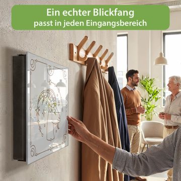 Bringe Ordnung und Eleganz in deinen Eingangsbereich mit dem banjado Schlüsselkasten Motiv Motiv Steinbock Sternzeichen Illustration. Die moderne Schlüsselbox kombiniert funktionales Design mit hochwertiger Verarbeitung und wird so zu einem echten Hingucker in Flur, Büro oder Ferienwohnung. ✅ Stilvolle Schlüsselaufbewahrung mit Glasfront im Motiv Motiv Steinbock Sternzeichen Illustration Der Design-Schlüsselkasten Motiv Motiv Steinbock Sternzeichen Illustration bietet Platz für bis zu 50 Schlüssel, die auf 5 stabilen Reihen mit je 10 Haken übersichtlich verstaut werden. Mit seinen kompakten Maßen von 30 x 30 x 5 cm passt die Schlüsselbox perfekt auch in kleinere Räume. Der schwarz lackierte Stahlkorpus mit rechts angeschlagenem Türscharnier harmoniert mit der Glasfront und fügt sich nahtlos in jedes Wohnambiente ein. Ob als Schlüsselorganizer für Zuhause oder als praktische Lösung für Büros, Praxen und Gewerbe, der banjado Schlüsselkasten sorgt für Ordnung und Übersicht. Dank der magnetischen, mit Kreidestiften beschreibbaren Glasfront kannst du Notizen anheften oder Termine direkt auf der Oberfläche festhalten. Die Schlüsselbox Motiv Motiv Steinbock Sternzeichen Illustration zur Wandmontage wird inklusive Befestigungsmaterial geliefert und ist schnell angebracht. So hast du deine Schlüssel jederzeit griffbereit und zugleich stilvoll verstaut. Mit diesem banjado Schlüsselkasten Motiv Motiv Steinbock Sternzeichen Illustration kombinierst du praktische Aufbewahrung mit stilvollem Wohndesign. Ob privat oder geschäftlich, die Schlüsselbox sorgt für mehr Ordnung, Übersicht und ein wohnliches Ambiente.Vorteile im Überblick