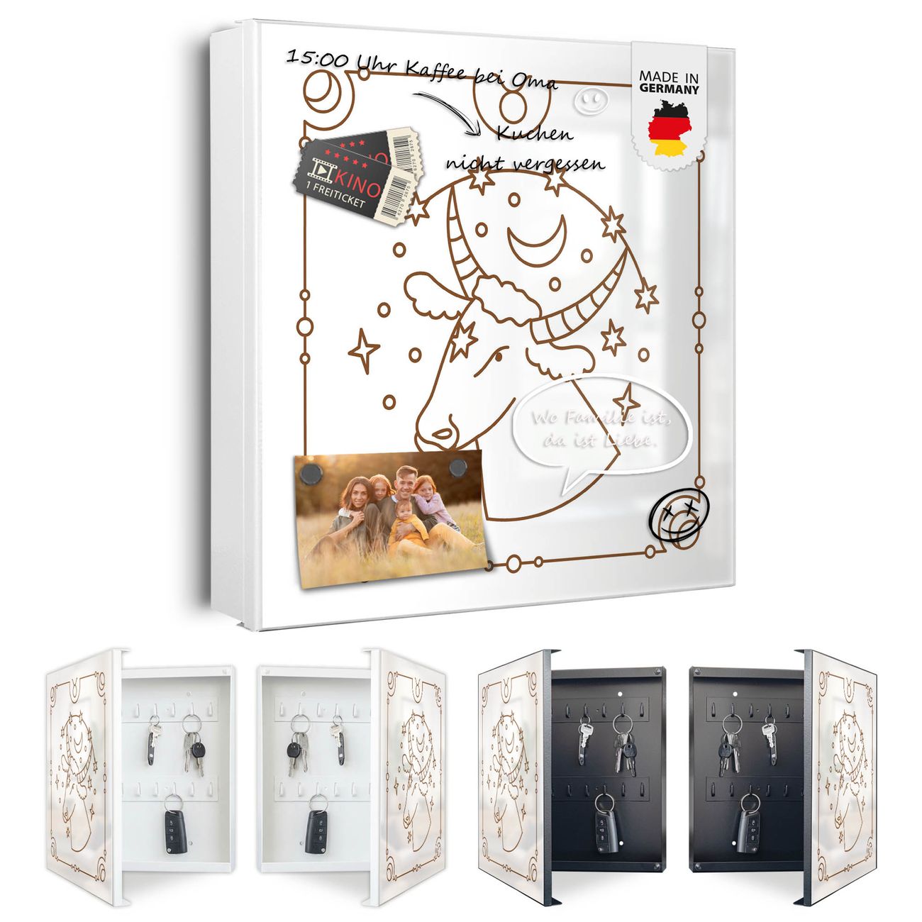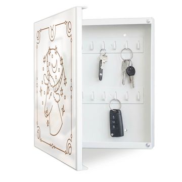 Bringe Ordnung und Eleganz in deinen Eingangsbereich mit dem banjado Schlüsselkasten Motiv Motiv Sternzeichen Stier. Die moderne Schlüsselbox kombiniert funktionales Design mit hochwertiger Verarbeitung und wird so zu einem echten Hingucker in Flur, Büro oder Ferienwohnung. ✅ Stilvolle Schlüsselaufbewahrung mit Motiv Motiv Sternzeichen Stier Der Design-Schlüsselkasten Motiv Motiv Sternzeichen Stier bietet Platz für bis zu 32 Schlüssel, die auf 4 stabilen Reihen mit je 8 Haken übersichtlich verstaut werden. Mit seinen kompakten Maßen von 30 x 30 x 5 cm passt die Schlüsselbox perfekt auch in kleinere Räume. Der weiß lackierte Stahlkorpus mit links angeschlagenem Türscharnier harmoniert mit gedruckten Folie auf der Front und fügt sich nahtlos in jedes Wohnambiente ein. Ob als Schlüsselorganizer für Zuhause oder als praktische Lösung für Büros, Praxen und Gewerbe, der banjado Schlüsselkasten sorgt für Ordnung und Übersicht. Dank der magnetischen, mit Kreidestiften beschreibbaren Folie auf der Front kannst du Notizen anheften oder Termine direkt auf der Oberfläche festhalten. Die Schlüsselbox Motiv Motiv Sternzeichen Stier zur Wandmontage wird inklusive Befestigungsmaterial geliefert und ist schnell angebracht. So hast du deine Schlüssel jederzeit griffbereit und zugleich stilvoll verstaut. Mit diesem banjado Schlüsselkasten Motiv Motiv Sternzeichen Stier kombinierst du praktische Aufbewahrung mit stilvollem Wohndesign. Ob privat oder geschäftlich, die Schlüsselbox sorgt für mehr Ordnung, Übersicht und ein wohnliches Ambiente.Vorteile im Überblick