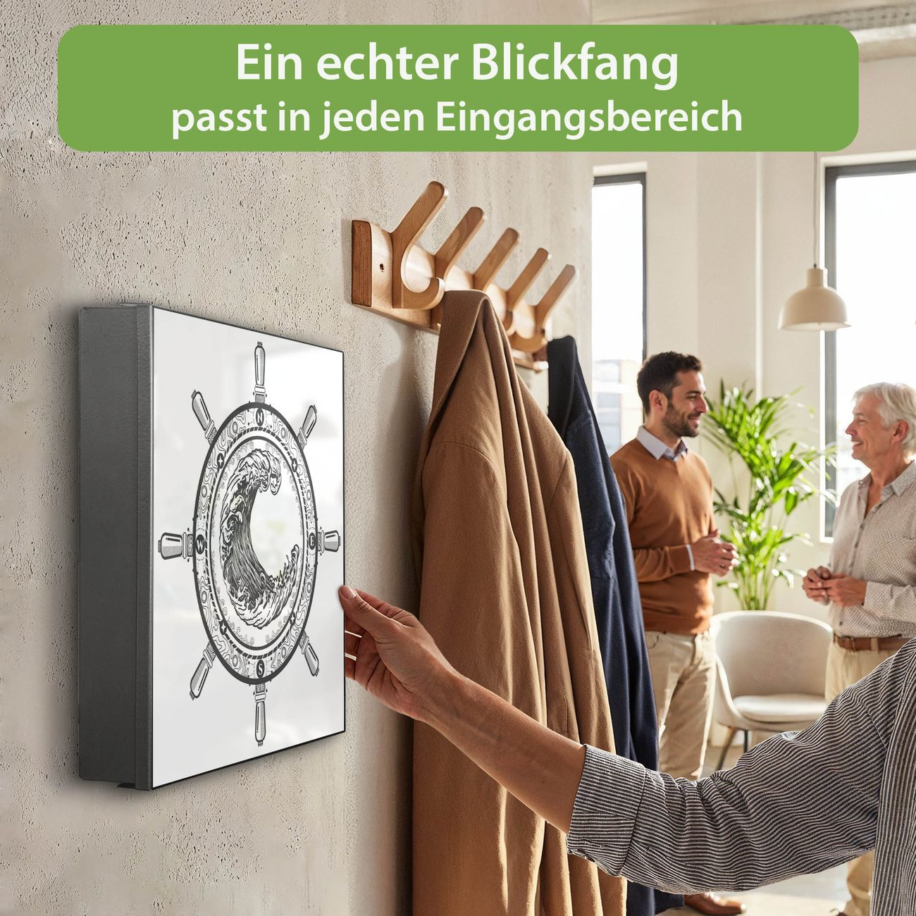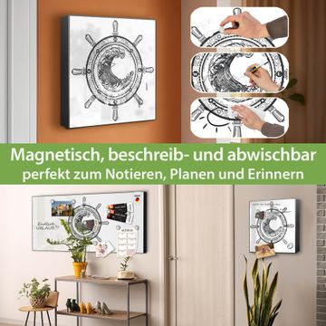 Bringe Ordnung und Eleganz in deinen Eingangsbereich mit dem banjado Schlüsselkasten Motiv Motiv Steuerrad 2. Die moderne Schlüsselbox kombiniert funktionales Design mit hochwertiger Verarbeitung und wird so zu einem echten Hingucker in Flur, Büro oder Ferienwohnung. ✅ Stilvolle Schlüsselaufbewahrung mit Motiv Motiv Steuerrad 2 Der Design-Schlüsselkasten Motiv Motiv Steuerrad 2 bietet Platz für bis zu 32 Schlüssel, die auf 4 stabilen Reihen mit je 8 Haken übersichtlich verstaut werden. Mit seinen kompakten Maßen von 30 x 30 x 5 cm passt die Schlüsselbox perfekt auch in kleinere Räume. Der schwarz lackierte Stahlkorpus mit links angeschlagenem Türscharnier harmoniert mit gedruckten Folie auf der Front und fügt sich nahtlos in jedes Wohnambiente ein. Ob als Schlüsselorganizer für Zuhause oder als praktische Lösung für Büros, Praxen und Gewerbe, der banjado Schlüsselkasten sorgt für Ordnung und Übersicht. Dank der magnetischen, mit Kreidestiften beschreibbaren Folie auf der Front kannst du Notizen anheften oder Termine direkt auf der Oberfläche festhalten. Die Schlüsselbox Motiv Motiv Steuerrad 2 zur Wandmontage wird inklusive Befestigungsmaterial geliefert und ist schnell angebracht. So hast du deine Schlüssel jederzeit griffbereit und zugleich stilvoll verstaut. Mit diesem banjado Schlüsselkasten Motiv Motiv Steuerrad 2 kombinierst du praktische Aufbewahrung mit stilvollem Wohndesign. Ob privat oder geschäftlich, die Schlüsselbox sorgt für mehr Ordnung, Übersicht und ein wohnliches Ambiente.Vorteile im Überblick