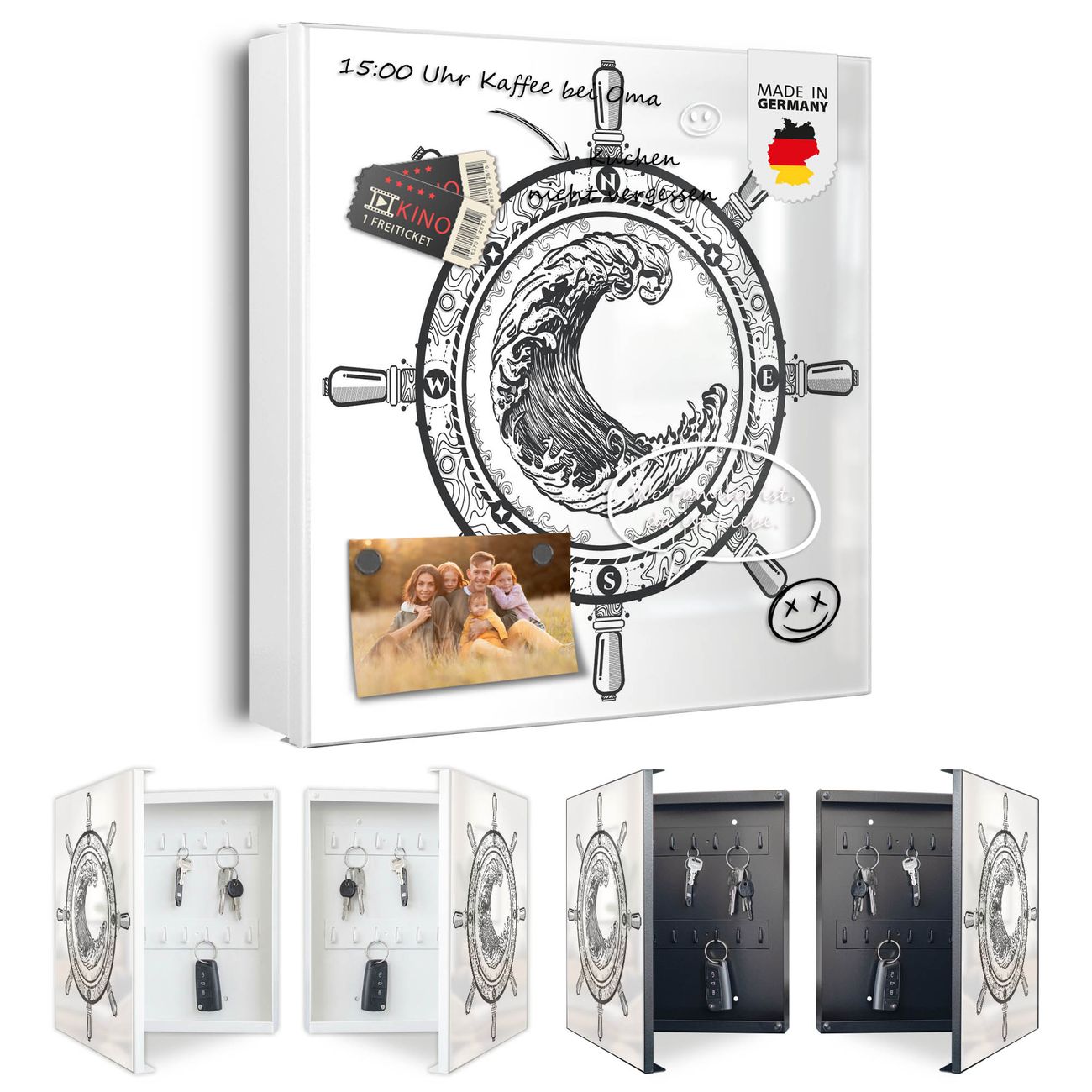 Bringe Ordnung und Eleganz in deinen Eingangsbereich mit dem banjado Schlüsselkasten Motiv Motiv Steuerrad 2. Die moderne Schlüsselbox kombiniert funktionales Design mit hochwertiger Verarbeitung und wird so zu einem echten Hingucker in Flur, Büro oder Ferienwohnung. ✅ Stilvolle Schlüsselaufbewahrung mit Motiv Motiv Steuerrad 2 Der Design-Schlüsselkasten Motiv Motiv Steuerrad 2 bietet Platz für bis zu 32 Schlüssel, die auf 4 stabilen Reihen mit je 8 Haken übersichtlich verstaut werden. Mit seinen kompakten Maßen von 30 x 30 x 5 cm passt die Schlüsselbox perfekt auch in kleinere Räume. Der weiß lackierte Stahlkorpus mit links angeschlagenem Türscharnier harmoniert mit gedruckten Folie auf der Front und fügt sich nahtlos in jedes Wohnambiente ein. Ob als Schlüsselorganizer für Zuhause oder als praktische Lösung für Büros, Praxen und Gewerbe, der banjado Schlüsselkasten sorgt für Ordnung und Übersicht. Dank der magnetischen, mit Kreidestiften beschreibbaren Folie auf der Front kannst du Notizen anheften oder Termine direkt auf der Oberfläche festhalten. Die Schlüsselbox Motiv Motiv Steuerrad 2 zur Wandmontage wird inklusive Befestigungsmaterial geliefert und ist schnell angebracht. So hast du deine Schlüssel jederzeit griffbereit und zugleich stilvoll verstaut. Mit diesem banjado Schlüsselkasten Motiv Motiv Steuerrad 2 kombinierst du praktische Aufbewahrung mit stilvollem Wohndesign. Ob privat oder geschäftlich, die Schlüsselbox sorgt für mehr Ordnung, Übersicht und ein wohnliches Ambiente.Vorteile im Überblick