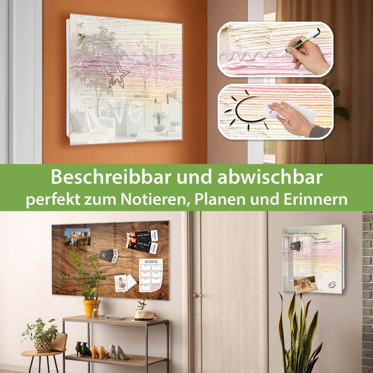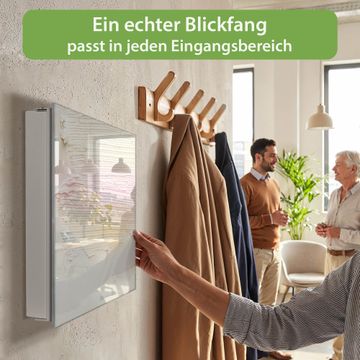 Bringe Ordnung und Eleganz in deinen Eingangsbereich mit dem banjado Schlüsselkasten Motiv Struktur Pastell. Die moderne Schlüsselbox kombiniert funktionales Design mit hochwertiger Verarbeitung und wird so zu einem echten Hingucker in Flur, Büro oder Ferienwohnung. ✅ Stilvolle Schlüsselaufbewahrung mit Glasfront im Motiv Motiv Struktur Pastell Der Design-Schlüsselkasten Motiv Struktur Pastell bietet Platz für bis zu 50 Schlüssel, die auf 5 stabilen Reihen mit je 10 Haken übersichtlich verstaut werden. Mit seinen kompakten Maßen von 30 x 30 x 5 cm passt die Schlüsselbox perfekt auch in kleinere Räume. Der weiß lackierte Stahlkorpus mit rechts angeschlagenem Türscharnier harmoniert mit der Glasfront und fügt sich nahtlos in jedes Wohnambiente ein. Ob als Schlüsselorganizer für Zuhause oder als praktische Lösung für Büros, Praxen und Gewerbe, der banjado Schlüsselkasten sorgt für Ordnung und Übersicht. Dank der magnetischen, mit Kreidestiften beschreibbaren Glasfront kannst du Notizen anheften oder Termine direkt auf der Oberfläche festhalten. Die Schlüsselbox Motiv Struktur Pastell zur Wandmontage wird inklusive Befestigungsmaterial geliefert und ist schnell angebracht. So hast du deine Schlüssel jederzeit griffbereit und zugleich stilvoll verstaut. Mit diesem banjado Schlüsselkasten Motiv Struktur Pastell kombinierst du praktische Aufbewahrung mit stilvollem Wohndesign. Ob privat oder geschäftlich, die Schlüsselbox sorgt für mehr Ordnung, Übersicht und ein wohnliches Ambiente.Vorteile im Überblick