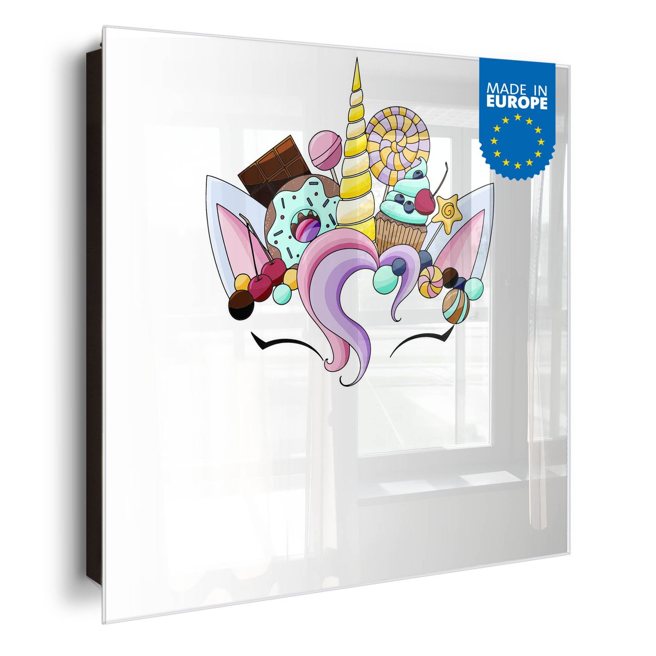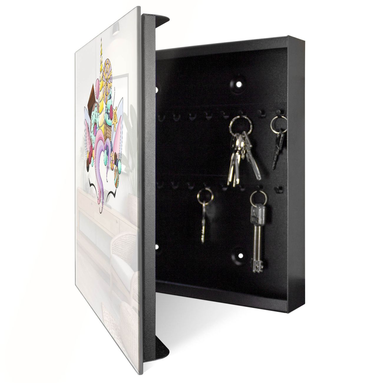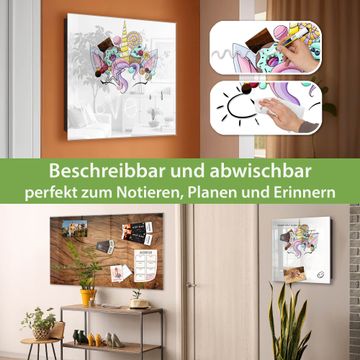 Bringe Ordnung und Eleganz in deinen Eingangsbereich mit dem banjado Schlüsselkasten Motiv Motiv Süßes Einhorn. Die moderne Schlüsselbox kombiniert funktionales Design mit hochwertiger Verarbeitung und wird so zu einem echten Hingucker in Flur, Büro oder Ferienwohnung. ✅ Stilvolle Schlüsselaufbewahrung mit Glasfront im Motiv Motiv Süßes Einhorn Der Design-Schlüsselkasten Motiv Motiv Süßes Einhorn bietet Platz für bis zu 50 Schlüssel, die auf 5 stabilen Reihen mit je 10 Haken übersichtlich verstaut werden. Mit seinen kompakten Maßen von 30 x 30 x 5 cm passt die Schlüsselbox perfekt auch in kleinere Räume. Der schwarz lackierte Stahlkorpus mit rechts angeschlagenem Türscharnier harmoniert mit der Glasfront und fügt sich nahtlos in jedes Wohnambiente ein. Ob als Schlüsselorganizer für Zuhause oder als praktische Lösung für Büros, Praxen und Gewerbe, der banjado Schlüsselkasten sorgt für Ordnung und Übersicht. Dank der magnetischen, mit Kreidestiften beschreibbaren Glasfront kannst du Notizen anheften oder Termine direkt auf der Oberfläche festhalten. Die Schlüsselbox Motiv Motiv Süßes Einhorn zur Wandmontage wird inklusive Befestigungsmaterial geliefert und ist schnell angebracht. So hast du deine Schlüssel jederzeit griffbereit und zugleich stilvoll verstaut. Mit diesem banjado Schlüsselkasten Motiv Motiv Süßes Einhorn kombinierst du praktische Aufbewahrung mit stilvollem Wohndesign. Ob privat oder geschäftlich, die Schlüsselbox sorgt für mehr Ordnung, Übersicht und ein wohnliches Ambiente.Vorteile im Überblick