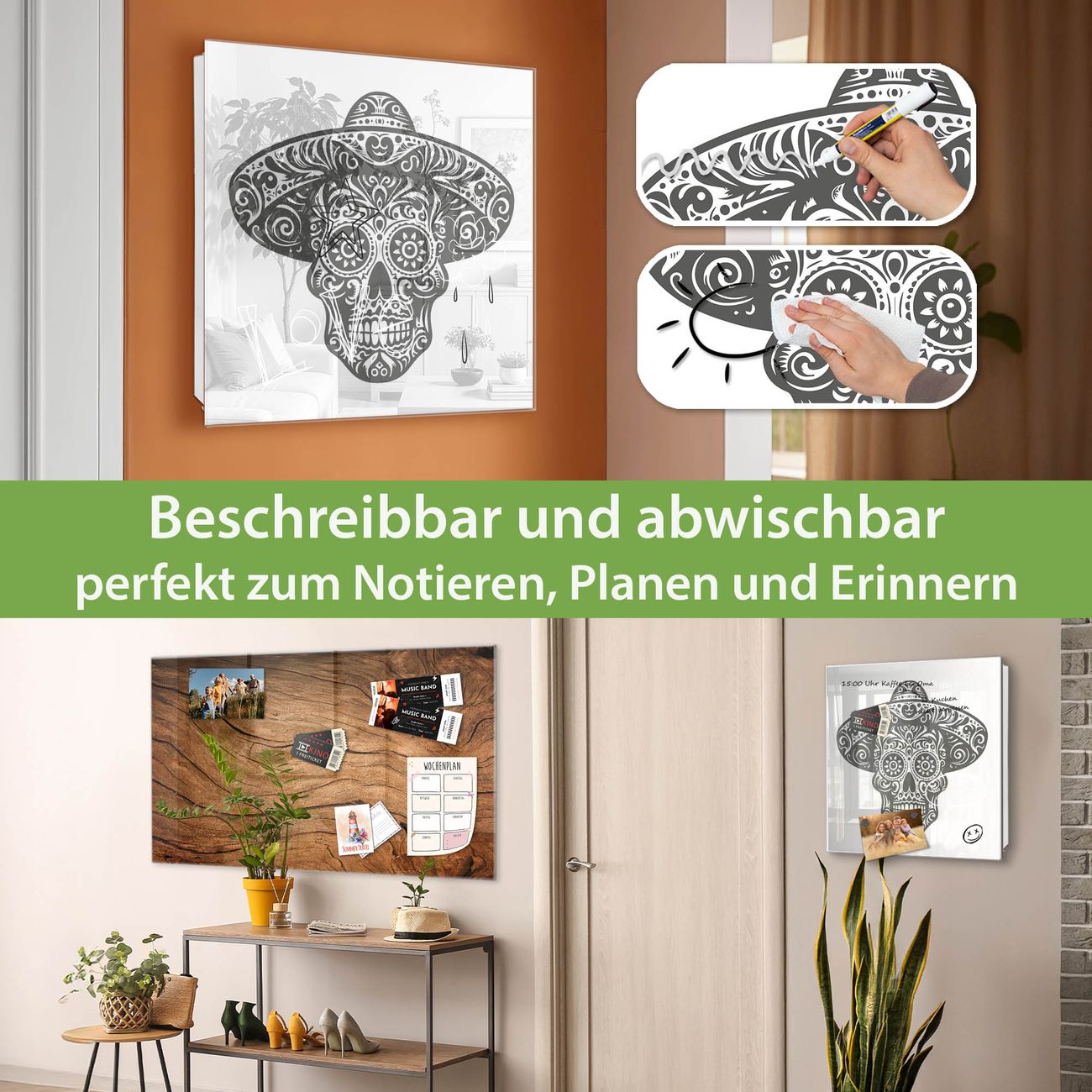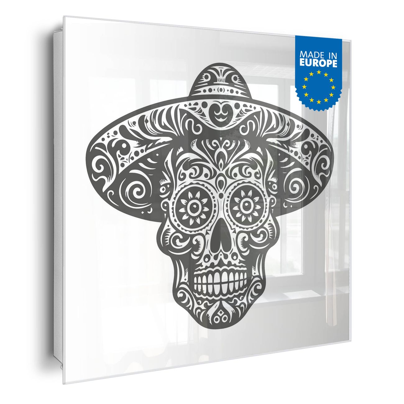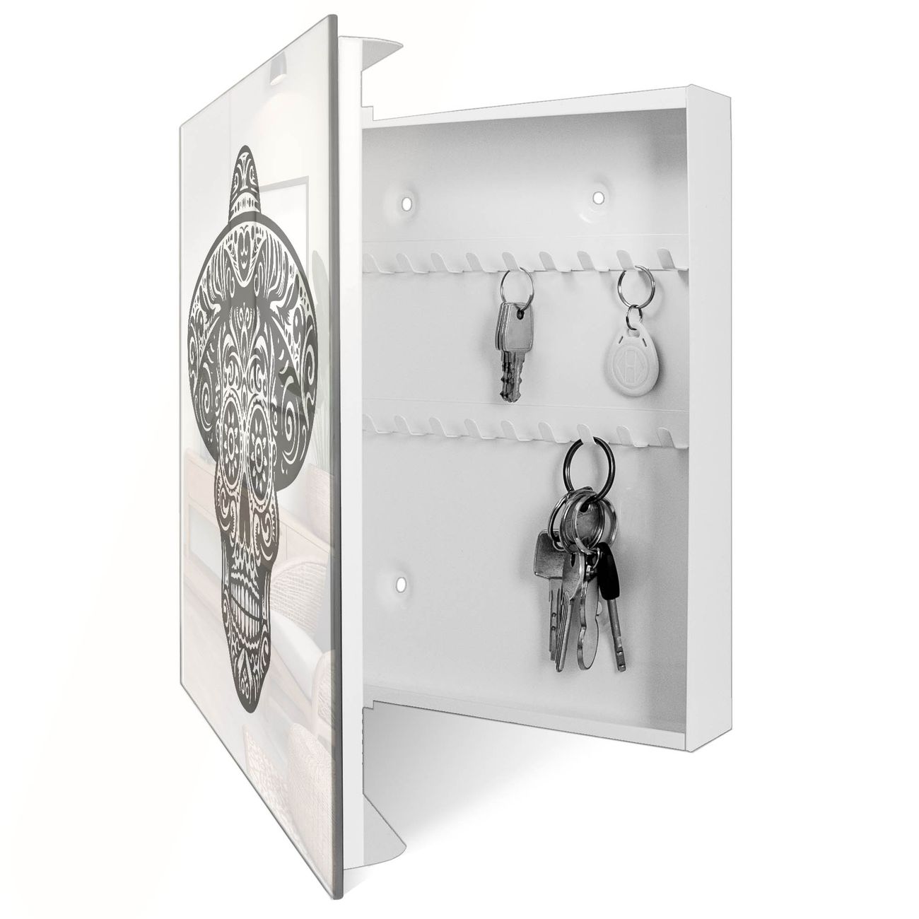 Bringe Ordnung und Eleganz in deinen Eingangsbereich mit dem banjado Schlüsselkasten Motiv Motiv Sugar Skull Design. Die moderne Schlüsselbox kombiniert funktionales Design mit hochwertiger Verarbeitung und wird so zu einem echten Hingucker in Flur, Büro oder Ferienwohnung. ✅ Stilvolle Schlüsselaufbewahrung mit Glasfront im Motiv Motiv Sugar Skull Design Der Design-Schlüsselkasten Motiv Motiv Sugar Skull Design bietet Platz für bis zu 50 Schlüssel, die auf 5 stabilen Reihen mit je 10 Haken übersichtlich verstaut werden. Mit seinen kompakten Maßen von 30 x 30 x 5 cm passt die Schlüsselbox perfekt auch in kleinere Räume. Der weiß lackierte Stahlkorpus mit rechts angeschlagenem Türscharnier harmoniert mit der Glasfront und fügt sich nahtlos in jedes Wohnambiente ein. Ob als Schlüsselorganizer für Zuhause oder als praktische Lösung für Büros, Praxen und Gewerbe, der banjado Schlüsselkasten sorgt für Ordnung und Übersicht. Dank der magnetischen, mit Kreidestiften beschreibbaren Glasfront kannst du Notizen anheften oder Termine direkt auf der Oberfläche festhalten. Die Schlüsselbox Motiv Motiv Sugar Skull Design zur Wandmontage wird inklusive Befestigungsmaterial geliefert und ist schnell angebracht. So hast du deine Schlüssel jederzeit griffbereit und zugleich stilvoll verstaut. Mit diesem banjado Schlüsselkasten Motiv Motiv Sugar Skull Design kombinierst du praktische Aufbewahrung mit stilvollem Wohndesign. Ob privat oder geschäftlich, die Schlüsselbox sorgt für mehr Ordnung, Übersicht und ein wohnliches Ambiente.Vorteile im Überblick