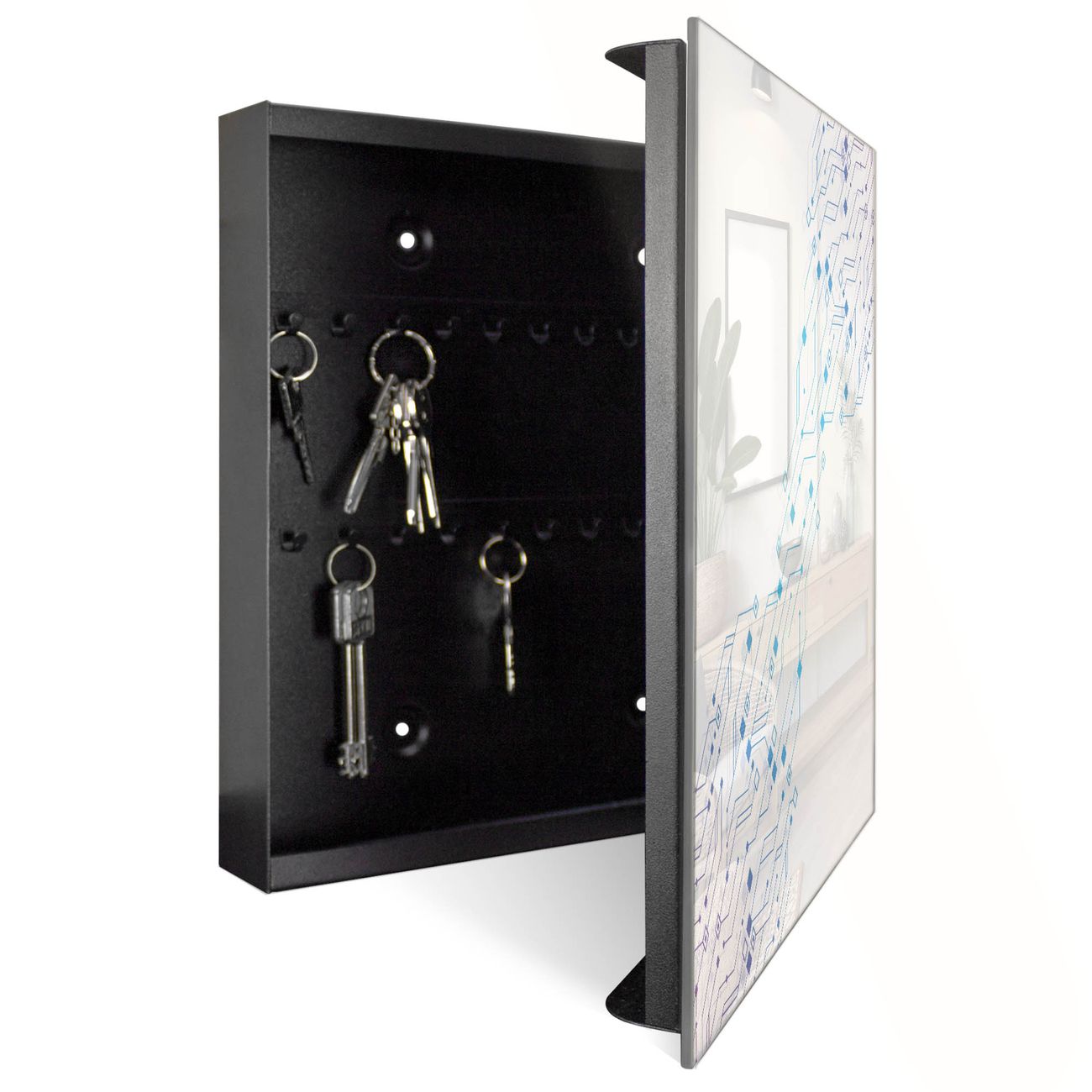 Bringe Ordnung und Eleganz in deinen Eingangsbereich mit dem banjado Schlüsselkasten Motiv Motiv Technologiemuster. Die moderne Schlüsselbox kombiniert funktionales Design mit hochwertiger Verarbeitung und wird so zu einem echten Hingucker in Flur, Büro oder Ferienwohnung. ✅ Stilvolle Schlüsselaufbewahrung mit Glasfront im Motiv Motiv Technologiemuster Der Design-Schlüsselkasten Motiv Motiv Technologiemuster bietet Platz für bis zu 50 Schlüssel, die auf 5 stabilen Reihen mit je 10 Haken übersichtlich verstaut werden. Mit seinen kompakten Maßen von 30 x 30 x 5 cm passt die Schlüsselbox perfekt auch in kleinere Räume. Der schwarz lackierte Stahlkorpus mit rechts angeschlagenem Türscharnier harmoniert mit der Glasfront und fügt sich nahtlos in jedes Wohnambiente ein. Ob als Schlüsselorganizer für Zuhause oder als praktische Lösung für Büros, Praxen und Gewerbe, der banjado Schlüsselkasten sorgt für Ordnung und Übersicht. Dank der magnetischen, mit Kreidestiften beschreibbaren Glasfront kannst du Notizen anheften oder Termine direkt auf der Oberfläche festhalten. Die Schlüsselbox Motiv Motiv Technologiemuster zur Wandmontage wird inklusive Befestigungsmaterial geliefert und ist schnell angebracht. So hast du deine Schlüssel jederzeit griffbereit und zugleich stilvoll verstaut. Mit diesem banjado Schlüsselkasten Motiv Motiv Technologiemuster kombinierst du praktische Aufbewahrung mit stilvollem Wohndesign. Ob privat oder geschäftlich, die Schlüsselbox sorgt für mehr Ordnung, Übersicht und ein wohnliches Ambiente.Vorteile im Überblick