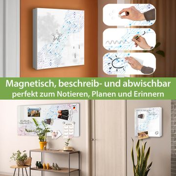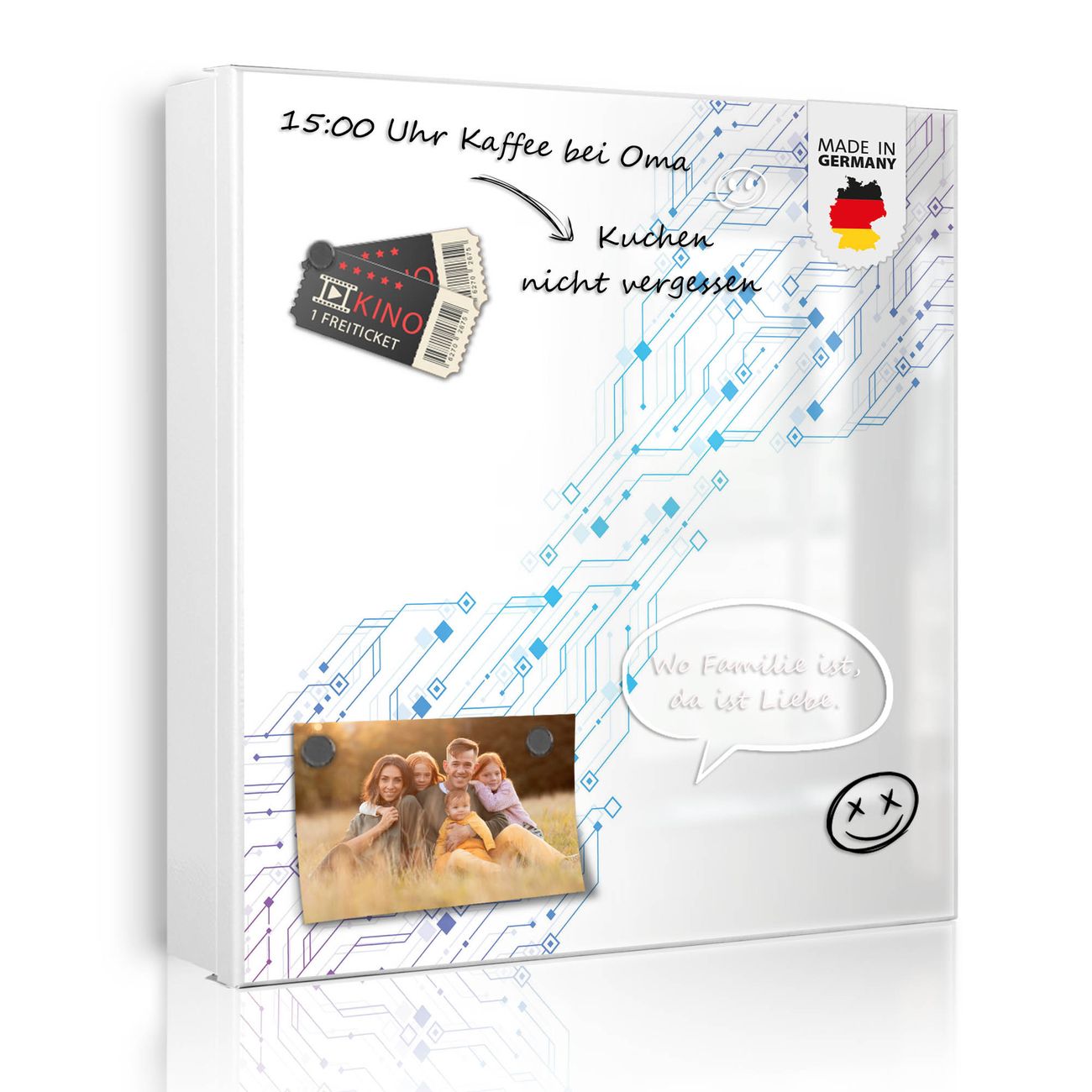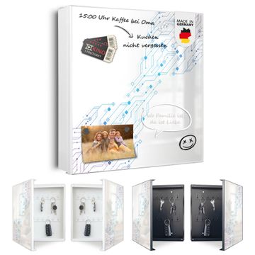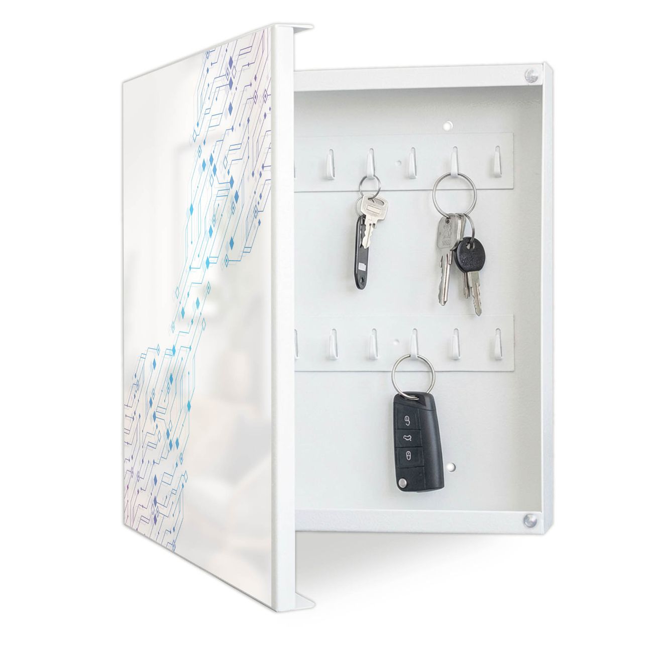 Bringe Ordnung und Eleganz in deinen Eingangsbereich mit dem banjado Schlüsselkasten Motiv Motiv Technologiemuster. Die moderne Schlüsselbox kombiniert funktionales Design mit hochwertiger Verarbeitung und wird so zu einem echten Hingucker in Flur, Büro oder Ferienwohnung. ✅ Stilvolle Schlüsselaufbewahrung mit Motiv Motiv Technologiemuster Der Design-Schlüsselkasten Motiv Motiv Technologiemuster bietet Platz für bis zu 32 Schlüssel, die auf 4 stabilen Reihen mit je 8 Haken übersichtlich verstaut werden. Mit seinen kompakten Maßen von 30 x 30 x 5 cm passt die Schlüsselbox perfekt auch in kleinere Räume. Der weiß lackierte Stahlkorpus mit links angeschlagenem Türscharnier harmoniert mit gedruckten Folie auf der Front und fügt sich nahtlos in jedes Wohnambiente ein. Ob als Schlüsselorganizer für Zuhause oder als praktische Lösung für Büros, Praxen und Gewerbe, der banjado Schlüsselkasten sorgt für Ordnung und Übersicht. Dank der magnetischen, mit Kreidestiften beschreibbaren Folie auf der Front kannst du Notizen anheften oder Termine direkt auf der Oberfläche festhalten. Die Schlüsselbox Motiv Motiv Technologiemuster zur Wandmontage wird inklusive Befestigungsmaterial geliefert und ist schnell angebracht. So hast du deine Schlüssel jederzeit griffbereit und zugleich stilvoll verstaut. Mit diesem banjado Schlüsselkasten Motiv Motiv Technologiemuster kombinierst du praktische Aufbewahrung mit stilvollem Wohndesign. Ob privat oder geschäftlich, die Schlüsselbox sorgt für mehr Ordnung, Übersicht und ein wohnliches Ambiente.Vorteile im Überblick