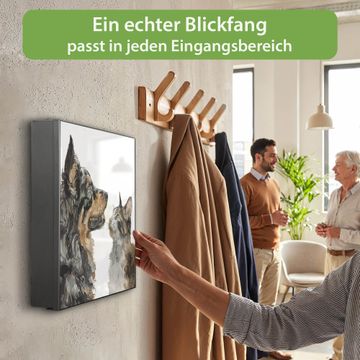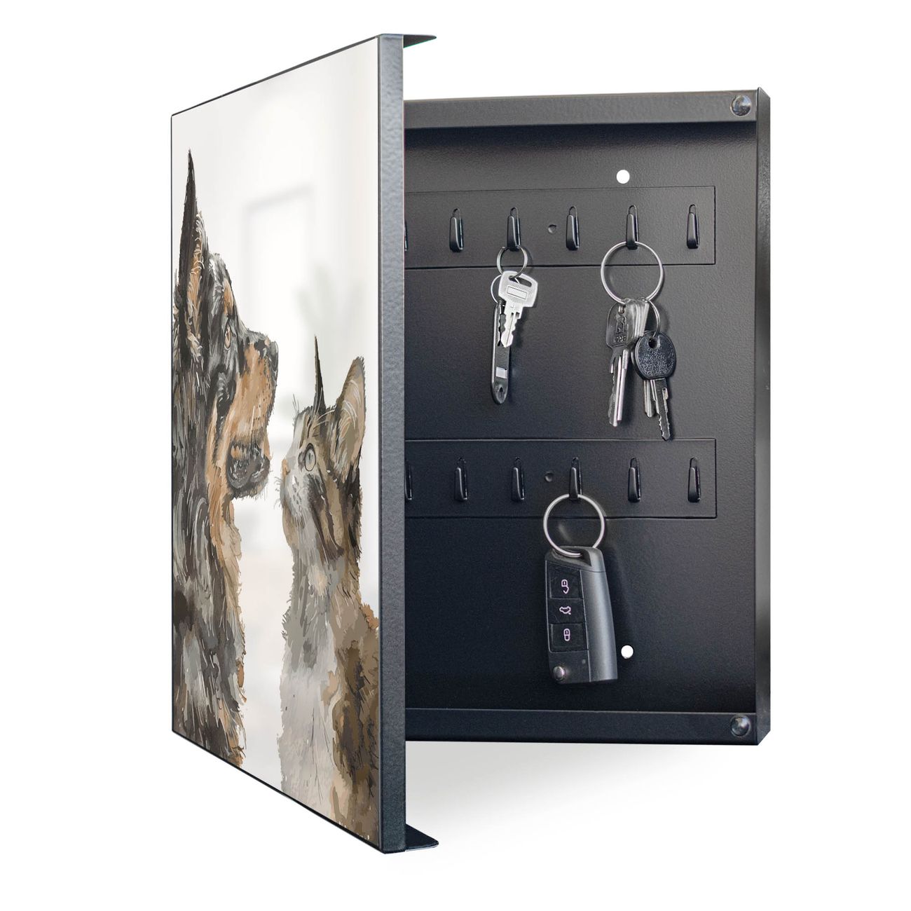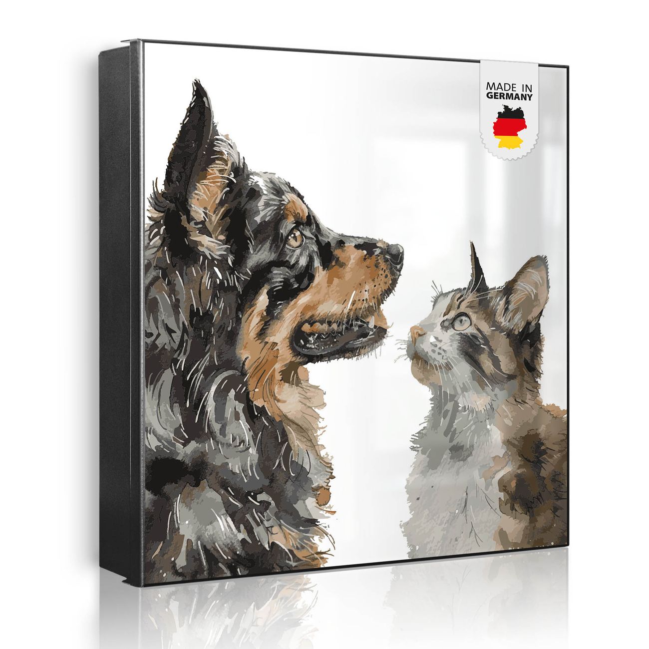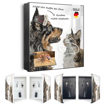 Bringe Ordnung und Eleganz in deinen Eingangsbereich mit dem banjado Schlüsselkasten Motiv Motiv Tierische Begegnung. Die moderne Schlüsselbox kombiniert funktionales Design mit hochwertiger Verarbeitung und wird so zu einem echten Hingucker in Flur, Büro oder Ferienwohnung. ✅ Stilvolle Schlüsselaufbewahrung mit Motiv Motiv Tierische Begegnung Der Design-Schlüsselkasten Motiv Motiv Tierische Begegnung bietet Platz für bis zu 32 Schlüssel, die auf 4 stabilen Reihen mit je 8 Haken übersichtlich verstaut werden. Mit seinen kompakten Maßen von 30 x 30 x 5 cm passt die Schlüsselbox perfekt auch in kleinere Räume. Der schwarz lackierte Stahlkorpus mit links angeschlagenem Türscharnier harmoniert mit gedruckten Folie auf der Front und fügt sich nahtlos in jedes Wohnambiente ein. Ob als Schlüsselorganizer für Zuhause oder als praktische Lösung für Büros, Praxen und Gewerbe, der banjado Schlüsselkasten sorgt für Ordnung und Übersicht. Dank der magnetischen, mit Kreidestiften beschreibbaren Folie auf der Front kannst du Notizen anheften oder Termine direkt auf der Oberfläche festhalten. Die Schlüsselbox Motiv Motiv Tierische Begegnung zur Wandmontage wird inklusive Befestigungsmaterial geliefert und ist schnell angebracht. So hast du deine Schlüssel jederzeit griffbereit und zugleich stilvoll verstaut. Mit diesem banjado Schlüsselkasten Motiv Motiv Tierische Begegnung kombinierst du praktische Aufbewahrung mit stilvollem Wohndesign. Ob privat oder geschäftlich, die Schlüsselbox sorgt für mehr Ordnung, Übersicht und ein wohnliches Ambiente.Vorteile im Überblick