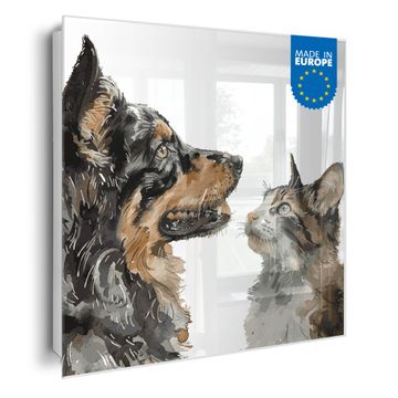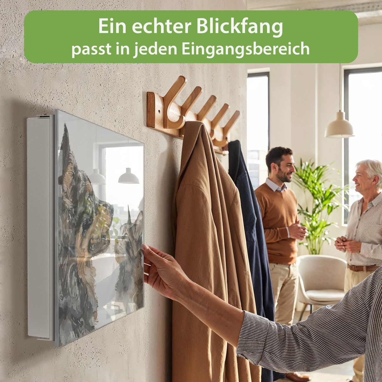 Bringe Ordnung und Eleganz in deinen Eingangsbereich mit dem banjado Schlüsselkasten Motiv Motiv Tierische Begegnung. Die moderne Schlüsselbox kombiniert funktionales Design mit hochwertiger Verarbeitung und wird so zu einem echten Hingucker in Flur, Büro oder Ferienwohnung. ✅ Stilvolle Schlüsselaufbewahrung mit Glasfront im Motiv Motiv Tierische Begegnung Der Design-Schlüsselkasten Motiv Motiv Tierische Begegnung bietet Platz für bis zu 50 Schlüssel, die auf 5 stabilen Reihen mit je 10 Haken übersichtlich verstaut werden. Mit seinen kompakten Maßen von 30 x 30 x 5 cm passt die Schlüsselbox perfekt auch in kleinere Räume. Der weiß lackierte Stahlkorpus mit rechts angeschlagenem Türscharnier harmoniert mit der Glasfront und fügt sich nahtlos in jedes Wohnambiente ein. Ob als Schlüsselorganizer für Zuhause oder als praktische Lösung für Büros, Praxen und Gewerbe, der banjado Schlüsselkasten sorgt für Ordnung und Übersicht. Dank der magnetischen, mit Kreidestiften beschreibbaren Glasfront kannst du Notizen anheften oder Termine direkt auf der Oberfläche festhalten. Die Schlüsselbox Motiv Motiv Tierische Begegnung zur Wandmontage wird inklusive Befestigungsmaterial geliefert und ist schnell angebracht. So hast du deine Schlüssel jederzeit griffbereit und zugleich stilvoll verstaut. Mit diesem banjado Schlüsselkasten Motiv Motiv Tierische Begegnung kombinierst du praktische Aufbewahrung mit stilvollem Wohndesign. Ob privat oder geschäftlich, die Schlüsselbox sorgt für mehr Ordnung, Übersicht und ein wohnliches Ambiente.Vorteile im Überblick