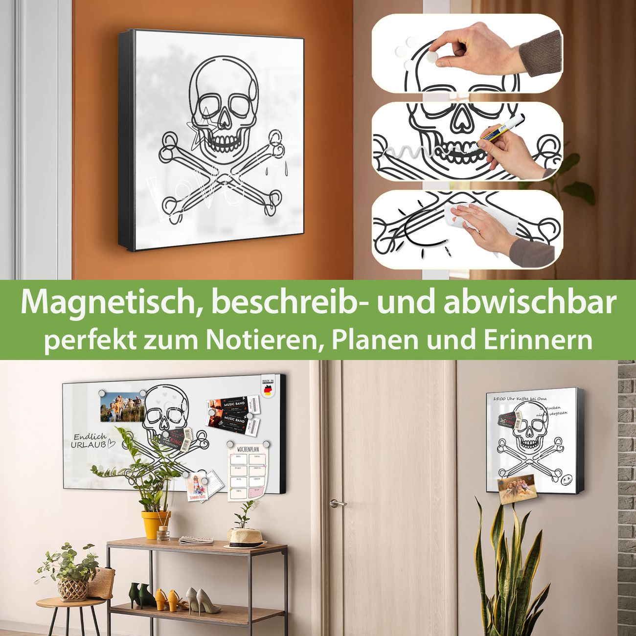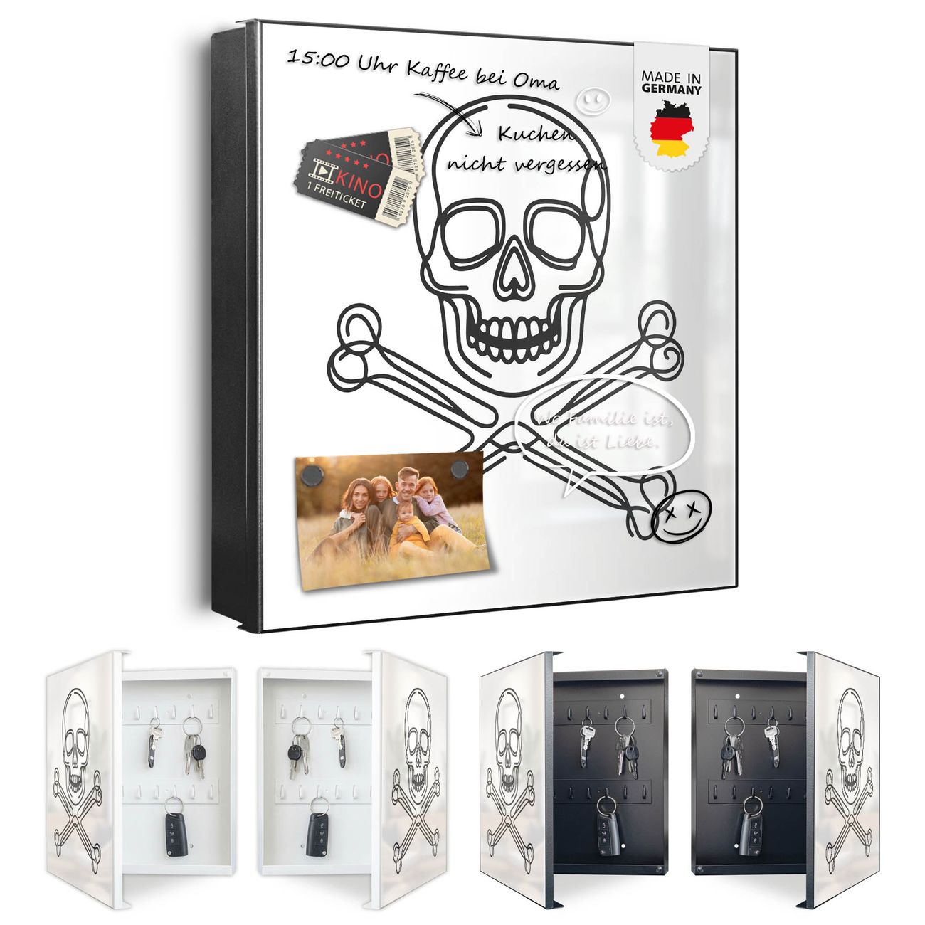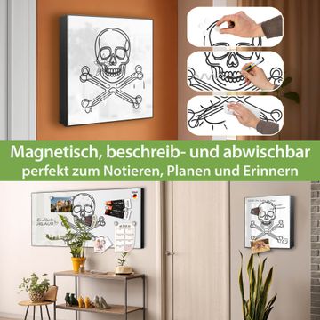 Bringe Ordnung und Eleganz in deinen Eingangsbereich mit dem banjado Schlüsselkasten Motiv Motiv Totenkopf und Knochen. Die moderne Schlüsselbox kombiniert funktionales Design mit hochwertiger Verarbeitung und wird so zu einem echten Hingucker in Flur, Büro oder Ferienwohnung. ✅ Stilvolle Schlüsselaufbewahrung mit Motiv Motiv Totenkopf und Knochen Der Design-Schlüsselkasten Motiv Motiv Totenkopf und Knochen bietet Platz für bis zu 32 Schlüssel, die auf 4 stabilen Reihen mit je 8 Haken übersichtlich verstaut werden. Mit seinen kompakten Maßen von 30 x 30 x 5 cm passt die Schlüsselbox perfekt auch in kleinere Räume. Der schwarz lackierte Stahlkorpus mit rechts angeschlagenem Türscharnier harmoniert mit gedruckten Folie auf der Front und fügt sich nahtlos in jedes Wohnambiente ein. Ob als Schlüsselorganizer für Zuhause oder als praktische Lösung für Büros, Praxen und Gewerbe, der banjado Schlüsselkasten sorgt für Ordnung und Übersicht. Dank der magnetischen, mit Kreidestiften beschreibbaren Folie auf der Front kannst du Notizen anheften oder Termine direkt auf der Oberfläche festhalten. Die Schlüsselbox Motiv Motiv Totenkopf und Knochen zur Wandmontage wird inklusive Befestigungsmaterial geliefert und ist schnell angebracht. So hast du deine Schlüssel jederzeit griffbereit und zugleich stilvoll verstaut. Mit diesem banjado Schlüsselkasten Motiv Motiv Totenkopf und Knochen kombinierst du praktische Aufbewahrung mit stilvollem Wohndesign. Ob privat oder geschäftlich, die Schlüsselbox sorgt für mehr Ordnung, Übersicht und ein wohnliches Ambiente.Vorteile im Überblick