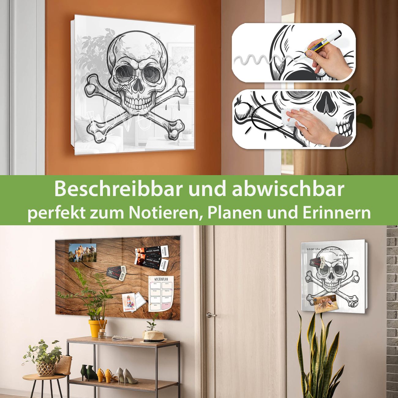 Bringe Ordnung und Eleganz in deinen Eingangsbereich mit dem banjado Schlüsselkasten Motiv Motiv Totenkopfsymbol. Die moderne Schlüsselbox kombiniert funktionales Design mit hochwertiger Verarbeitung und wird so zu einem echten Hingucker in Flur, Büro oder Ferienwohnung. ✅ Stilvolle Schlüsselaufbewahrung mit Glasfront im Motiv Motiv Totenkopfsymbol Der Design-Schlüsselkasten Motiv Motiv Totenkopfsymbol bietet Platz für bis zu 50 Schlüssel, die auf 5 stabilen Reihen mit je 10 Haken übersichtlich verstaut werden. Mit seinen kompakten Maßen von 30 x 30 x 5 cm passt die Schlüsselbox perfekt auch in kleinere Räume. Der weiß lackierte Stahlkorpus mit rechts angeschlagenem Türscharnier harmoniert mit der Glasfront und fügt sich nahtlos in jedes Wohnambiente ein. Ob als Schlüsselorganizer für Zuhause oder als praktische Lösung für Büros, Praxen und Gewerbe, der banjado Schlüsselkasten sorgt für Ordnung und Übersicht. Dank der magnetischen, mit Kreidestiften beschreibbaren Glasfront kannst du Notizen anheften oder Termine direkt auf der Oberfläche festhalten. Die Schlüsselbox Motiv Motiv Totenkopfsymbol zur Wandmontage wird inklusive Befestigungsmaterial geliefert und ist schnell angebracht. So hast du deine Schlüssel jederzeit griffbereit und zugleich stilvoll verstaut. Mit diesem banjado Schlüsselkasten Motiv Motiv Totenkopfsymbol kombinierst du praktische Aufbewahrung mit stilvollem Wohndesign. Ob privat oder geschäftlich, die Schlüsselbox sorgt für mehr Ordnung, Übersicht und ein wohnliches Ambiente.Vorteile im Überblick