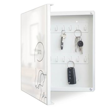 Bringe Ordnung und Eleganz in deinen Eingangsbereich mit dem banjado Schlüsselkasten Motiv Motiv Dream big, little One. Die moderne Schlüsselbox kombiniert funktionales Design mit hochwertiger Verarbeitung und wird so zu einem echten Hingucker in Flur, Büro oder Ferienwohnung. ✅ Stilvolle Schlüsselaufbewahrung mit Motiv Motiv Dream big, little One Der Design-Schlüsselkasten Motiv Motiv Dream big, little One bietet Platz für bis zu 32 Schlüssel, die auf 4 stabilen Reihen mit je 8 Haken übersichtlich verstaut werden. Mit seinen kompakten Maßen von 30 x 30 x 5 cm passt die Schlüsselbox perfekt auch in kleinere Räume. Der weiß lackierte Stahlkorpus mit links angeschlagenem Türscharnier harmoniert mit gedruckten Folie auf der Front und fügt sich nahtlos in jedes Wohnambiente ein. Ob als Schlüsselorganizer für Zuhause oder als praktische Lösung für Büros, Praxen und Gewerbe, der banjado Schlüsselkasten sorgt für Ordnung und Übersicht. Dank der magnetischen, mit Kreidestiften beschreibbaren Folie auf der Front kannst du Notizen anheften oder Termine direkt auf der Oberfläche festhalten. Die Schlüsselbox Motiv Motiv Dream big, little One zur Wandmontage wird inklusive Befestigungsmaterial geliefert und ist schnell angebracht. So hast du deine Schlüssel jederzeit griffbereit und zugleich stilvoll verstaut. Mit diesem banjado Schlüsselkasten Motiv Motiv Dream big, little One kombinierst du praktische Aufbewahrung mit stilvollem Wohndesign. Ob privat oder geschäftlich, die Schlüsselbox sorgt für mehr Ordnung, Übersicht und ein wohnliches Ambiente.Vorteile im Überblick