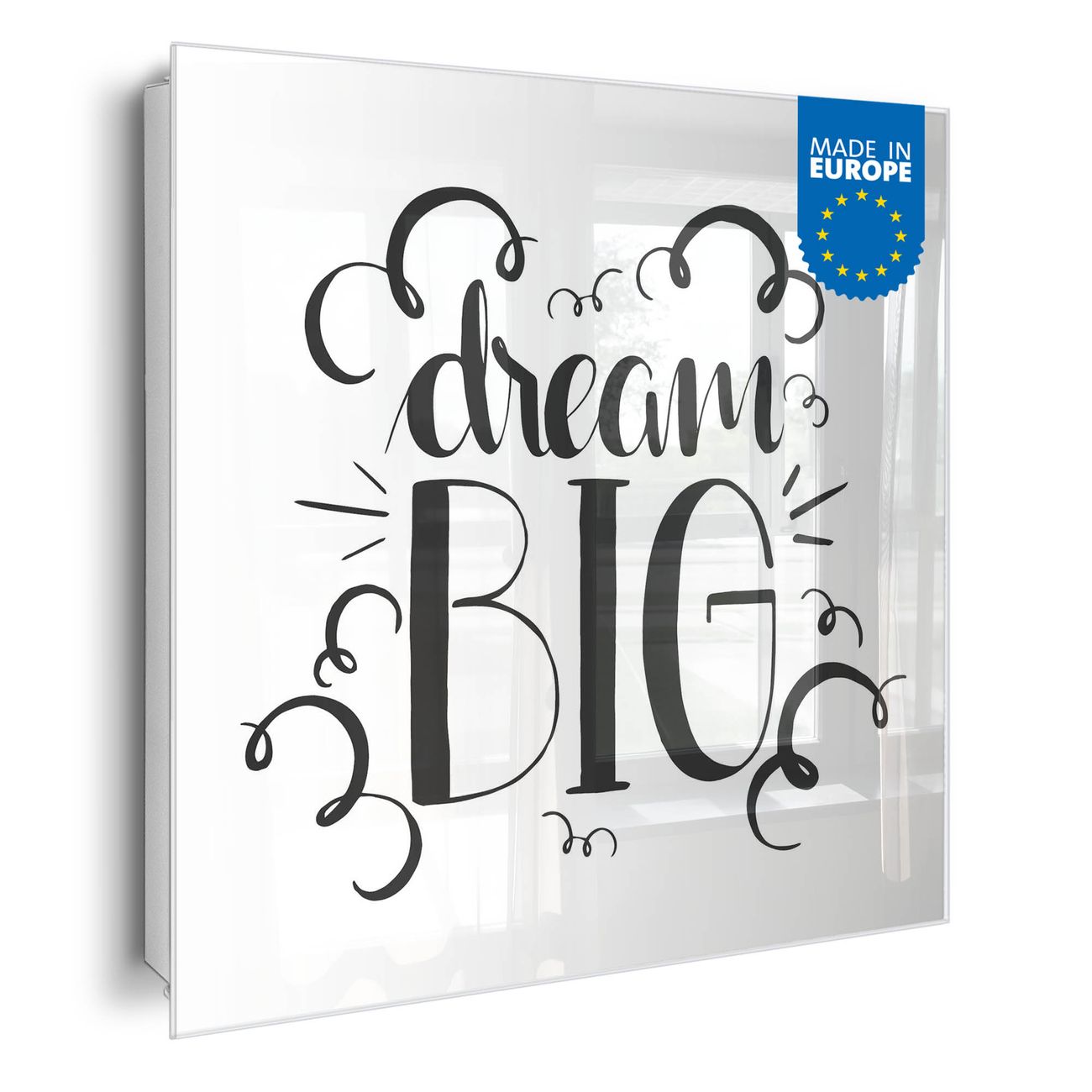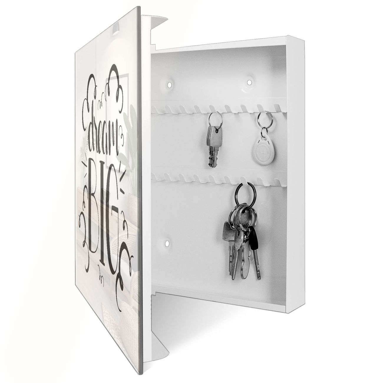 Bringe Ordnung und Eleganz in deinen Eingangsbereich mit dem banjado Schlüsselkasten Motiv Motiv Traum Groß. Die moderne Schlüsselbox kombiniert funktionales Design mit hochwertiger Verarbeitung und wird so zu einem echten Hingucker in Flur, Büro oder Ferienwohnung. ✅ Stilvolle Schlüsselaufbewahrung mit Glasfront im Motiv Motiv Traum Groß Der Design-Schlüsselkasten Motiv Motiv Traum Groß bietet Platz für bis zu 50 Schlüssel, die auf 5 stabilen Reihen mit je 10 Haken übersichtlich verstaut werden. Mit seinen kompakten Maßen von 30 x 30 x 5 cm passt die Schlüsselbox perfekt auch in kleinere Räume. Der weiß lackierte Stahlkorpus mit rechts angeschlagenem Türscharnier harmoniert mit der Glasfront und fügt sich nahtlos in jedes Wohnambiente ein. Ob als Schlüsselorganizer für Zuhause oder als praktische Lösung für Büros, Praxen und Gewerbe, der banjado Schlüsselkasten sorgt für Ordnung und Übersicht. Dank der magnetischen, mit Kreidestiften beschreibbaren Glasfront kannst du Notizen anheften oder Termine direkt auf der Oberfläche festhalten. Die Schlüsselbox Motiv Motiv Traum Groß zur Wandmontage wird inklusive Befestigungsmaterial geliefert und ist schnell angebracht. So hast du deine Schlüssel jederzeit griffbereit und zugleich stilvoll verstaut. Mit diesem banjado Schlüsselkasten Motiv Motiv Traum Groß kombinierst du praktische Aufbewahrung mit stilvollem Wohndesign. Ob privat oder geschäftlich, die Schlüsselbox sorgt für mehr Ordnung, Übersicht und ein wohnliches Ambiente.Vorteile im Überblick