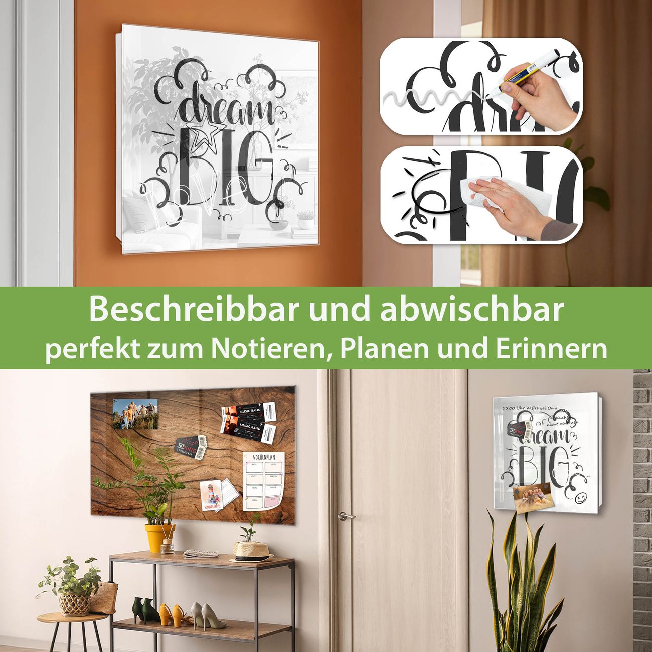 ✅ Magnetisch und mit Kreidestift beschreibbar, gehärtetes Glas, links angeschlagene TürOrdnung und Design in einem