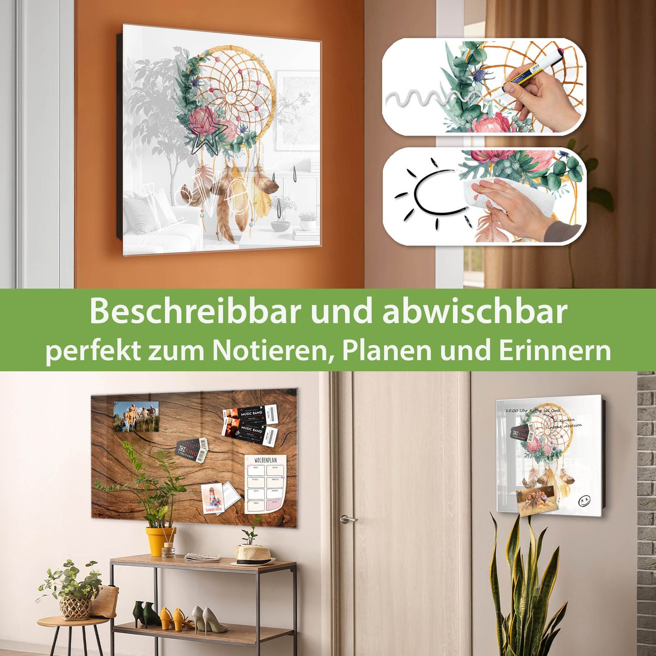 Bringe Ordnung und Eleganz in deinen Eingangsbereich mit dem banjado Schlüsselkasten Motiv Motiv Traumfänger Federn und Blumen. Die moderne Schlüsselbox kombiniert funktionales Design mit hochwertiger Verarbeitung und wird so zu einem echten Hingucker in Flur, Büro oder Ferienwohnung. ✅ Stilvolle Schlüsselaufbewahrung mit Glasfront im Motiv Motiv Traumfänger Federn und Blumen Der Design-Schlüsselkasten Motiv Motiv Traumfänger Federn und Blumen bietet Platz für bis zu 50 Schlüssel, die auf 5 stabilen Reihen mit je 10 Haken übersichtlich verstaut werden. Mit seinen kompakten Maßen von 30 x 30 x 5 cm passt die Schlüsselbox perfekt auch in kleinere Räume. Der schwarz lackierte Stahlkorpus mit rechts angeschlagenem Türscharnier harmoniert mit der Glasfront und fügt sich nahtlos in jedes Wohnambiente ein. Ob als Schlüsselorganizer für Zuhause oder als praktische Lösung für Büros, Praxen und Gewerbe, der banjado Schlüsselkasten sorgt für Ordnung und Übersicht. Dank der magnetischen, mit Kreidestiften beschreibbaren Glasfront kannst du Notizen anheften oder Termine direkt auf der Oberfläche festhalten. Die Schlüsselbox Motiv Motiv Traumfänger Federn und Blumen zur Wandmontage wird inklusive Befestigungsmaterial geliefert und ist schnell angebracht. So hast du deine Schlüssel jederzeit griffbereit und zugleich stilvoll verstaut. Mit diesem banjado Schlüsselkasten Motiv Motiv Traumfänger Federn und Blumen kombinierst du praktische Aufbewahrung mit stilvollem Wohndesign. Ob privat oder geschäftlich, die Schlüsselbox sorgt für mehr Ordnung, Übersicht und ein wohnliches Ambiente.Vorteile im Überblick
