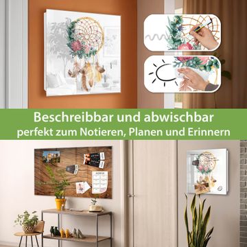 Bringe Ordnung und Eleganz in deinen Eingangsbereich mit dem banjado Schlüsselkasten Motiv Motiv Traumfänger Federn und Blumen. Die moderne Schlüsselbox kombiniert funktionales Design mit hochwertiger Verarbeitung und wird so zu einem echten Hingucker in Flur, Büro oder Ferienwohnung. ✅ Stilvolle Schlüsselaufbewahrung mit Glasfront im Motiv Motiv Traumfänger Federn und Blumen Der Design-Schlüsselkasten Motiv Motiv Traumfänger Federn und Blumen bietet Platz für bis zu 50 Schlüssel, die auf 5 stabilen Reihen mit je 10 Haken übersichtlich verstaut werden. Mit seinen kompakten Maßen von 30 x 30 x 5 cm passt die Schlüsselbox perfekt auch in kleinere Räume. Der weiß lackierte Stahlkorpus mit rechts angeschlagenem Türscharnier harmoniert mit der Glasfront und fügt sich nahtlos in jedes Wohnambiente ein. Ob als Schlüsselorganizer für Zuhause oder als praktische Lösung für Büros, Praxen und Gewerbe, der banjado Schlüsselkasten sorgt für Ordnung und Übersicht. Dank der magnetischen, mit Kreidestiften beschreibbaren Glasfront kannst du Notizen anheften oder Termine direkt auf der Oberfläche festhalten. Die Schlüsselbox Motiv Motiv Traumfänger Federn und Blumen zur Wandmontage wird inklusive Befestigungsmaterial geliefert und ist schnell angebracht. So hast du deine Schlüssel jederzeit griffbereit und zugleich stilvoll verstaut. Mit diesem banjado Schlüsselkasten Motiv Motiv Traumfänger Federn und Blumen kombinierst du praktische Aufbewahrung mit stilvollem Wohndesign. Ob privat oder geschäftlich, die Schlüsselbox sorgt für mehr Ordnung, Übersicht und ein wohnliches Ambiente.Vorteile im Überblick